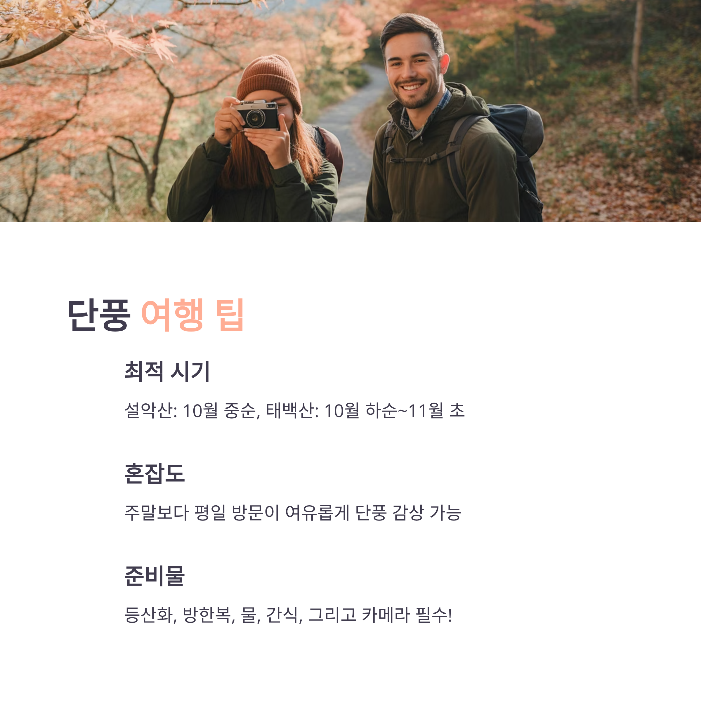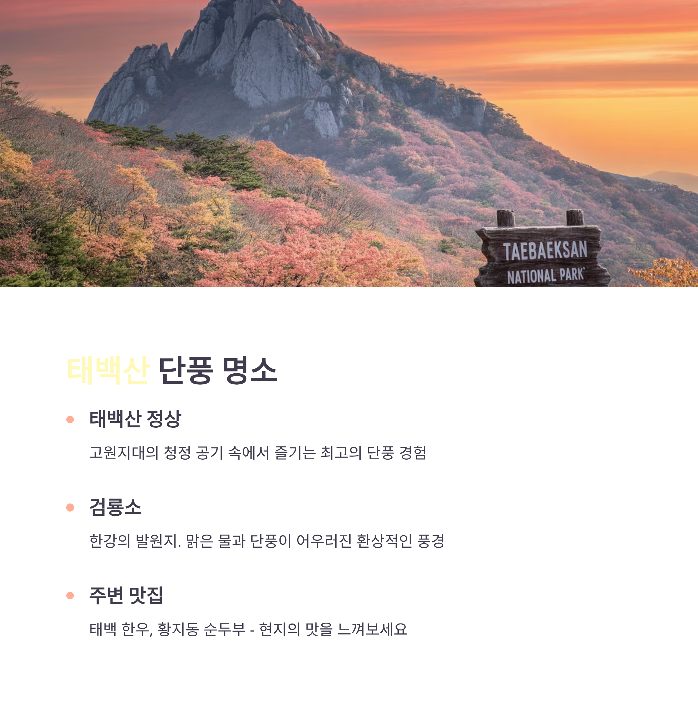 단풍 명소 대청봉, 권금성 태백산 정상, 검룡소 주요 즐길 거리 대청봉 등반, 권금성 케이블카 태백산 정상 등반, 검룡소 하이킹 포토스팟 대청봉, 권금성 태백산 정상, 검룡소 주변 맛집 설악산국밥, 청초수물회 태백 한우, 황지동 순두부 특징 웅장한 암봉과 깊은 계곡, 케이블카 이용 가능 고원지대의 단풍, 고요한 자연 환경 추천 시기 가을 단풍, 봄, 여름, 겨울에도 좋음 가을 단풍, 여름에도 좋음 방문객 수 약 500만 명 (설악산 방문객 수는 2023년 기준) 약 300만 명 (태백산 방문객 수는 2023년 기준)