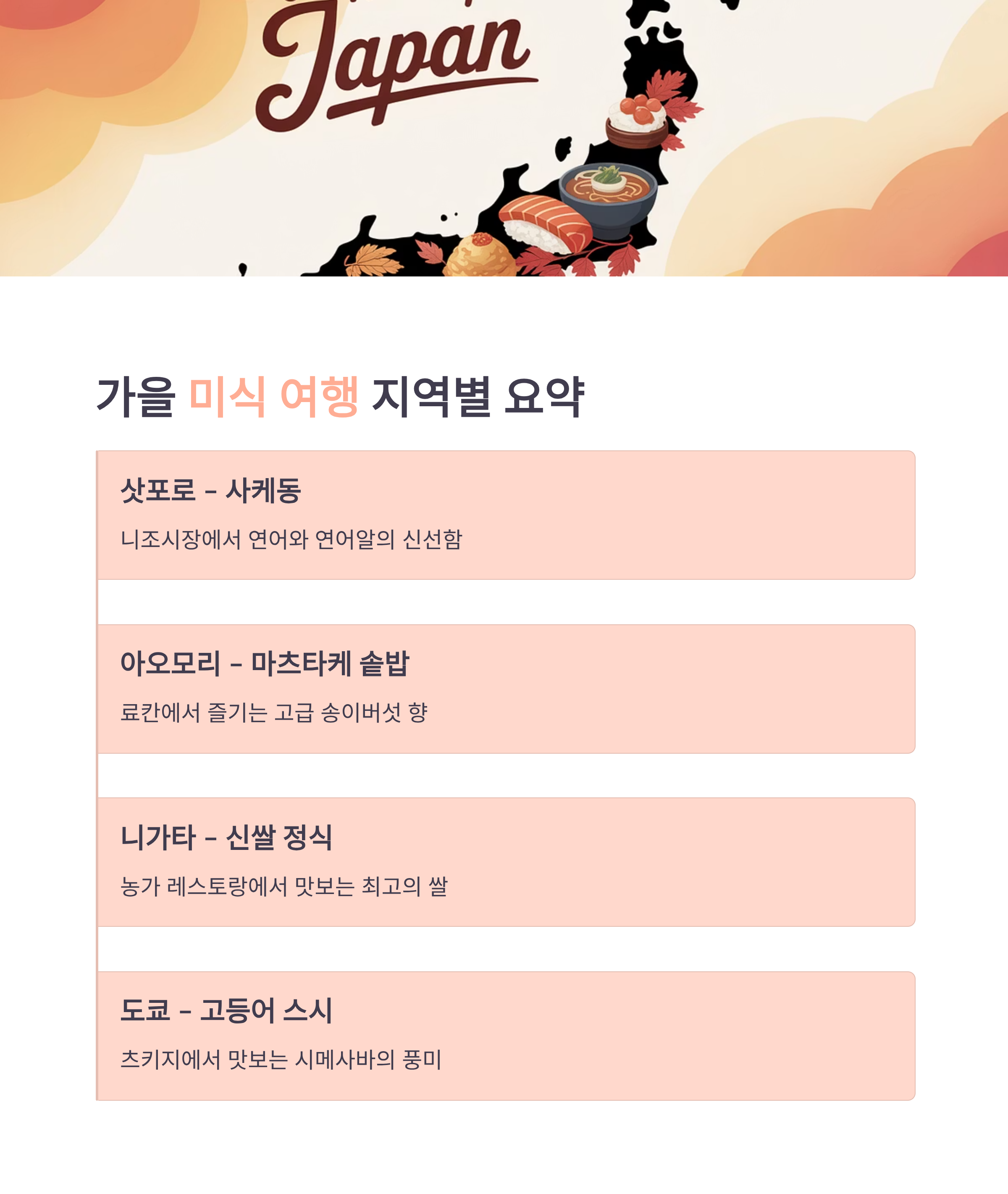 삿포로 사케동 제철 연어와 연어알 니조시장 아오모리 마츠타케 솥밥 고급 향과 깊은 맛 마츠카미 료칸 니가타 신쌀 정식 최고의 쌀 본연의 맛 농가 레스토랑 도쿄 고등어 스시 향과 담백함의 조화 츠키지 시장 나고야 미소카츠 진한 된장소스와 튀김 야바톤 본점 교토 유도후 따뜻한 정원식 식사 아라시야마 찻집 오사카 다코야끼 문어 풍미 가득한 길거리 음식 도톤보리 후쿠오카 가을 라멘 계절 재료와 진한 국물 하카타 라멘집