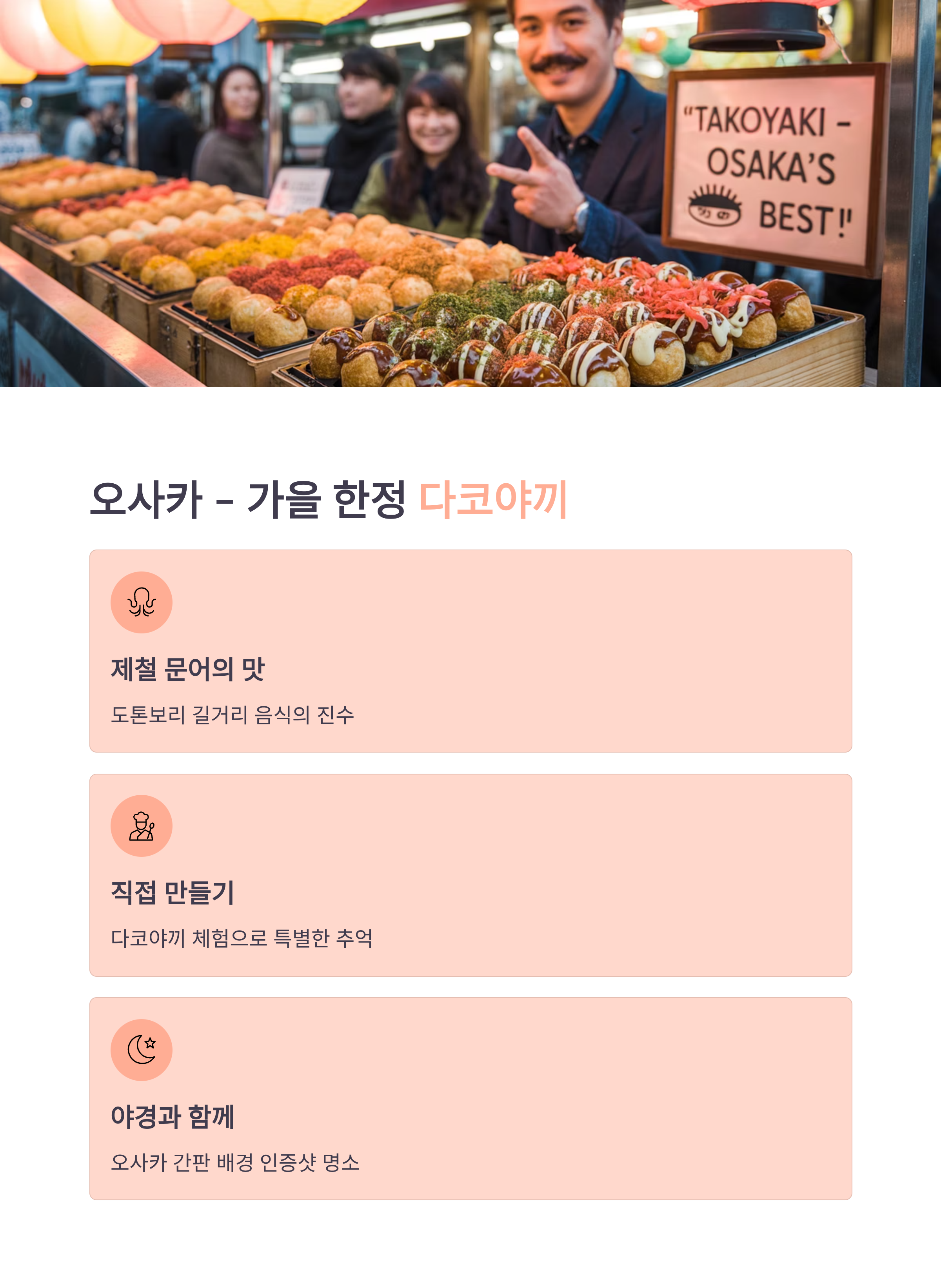 오사카는 스트리트 푸드 천국으로, 가을엔 제철 문어를 넣은 다코야끼와 해산물 오코노미야끼가 특히 인기입니다. 도톤보리 강변에는 계절 한정 트럭들이 즐비해 있으며, 직접 만들기 체험도 가능합니다.