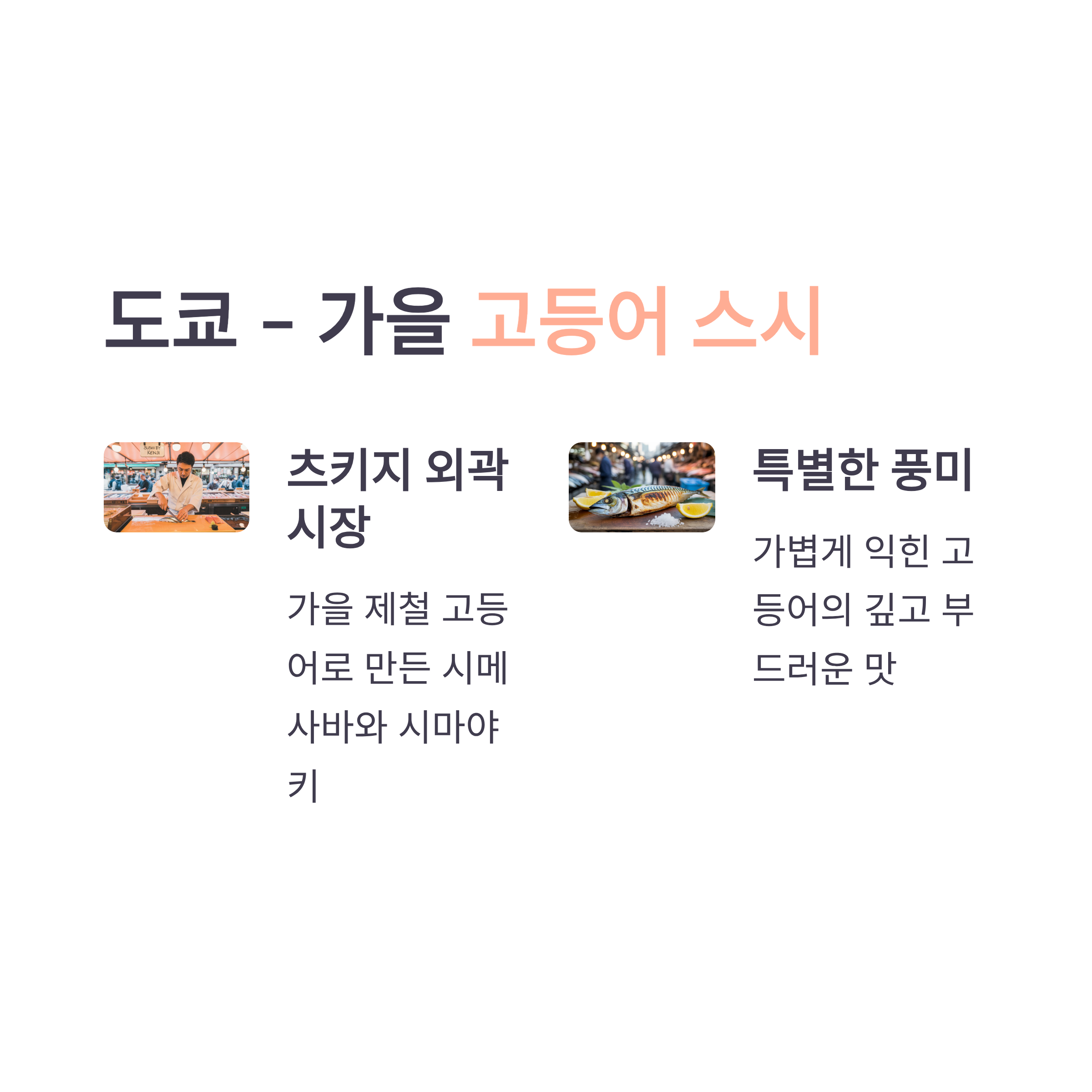 도쿄의 츠키지 외곽시장에서는 가을 제철인 고등어를 이용한 ‘시메사바’ 스시와 함께, 불에 구워낸 고등어 시마야키를 맛볼 수 있습니다. 가볍게 익힌 고등어는 향이 깊고 부드럽습니다.