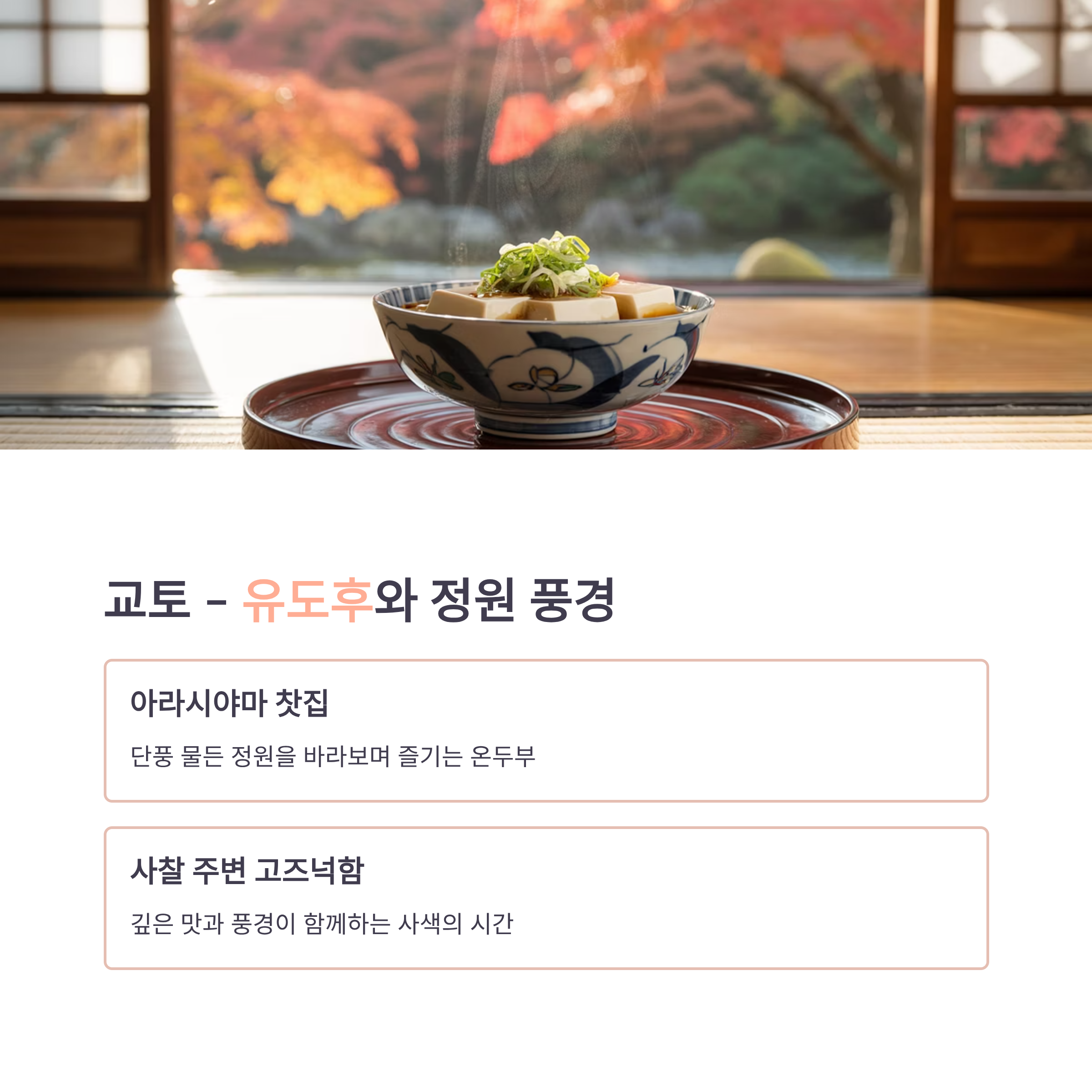 교토의 아라시야마 일대 찻집과 사찰 부근에서는 따뜻한 유도후(온두부요리)를 만날 수 있습니다. 가을 단풍과 어우러진 고즈넉한 정원에서 단순하지만 깊은 맛의 식사를 즐기며 사색의 시간을 보낼 수 있습니다.