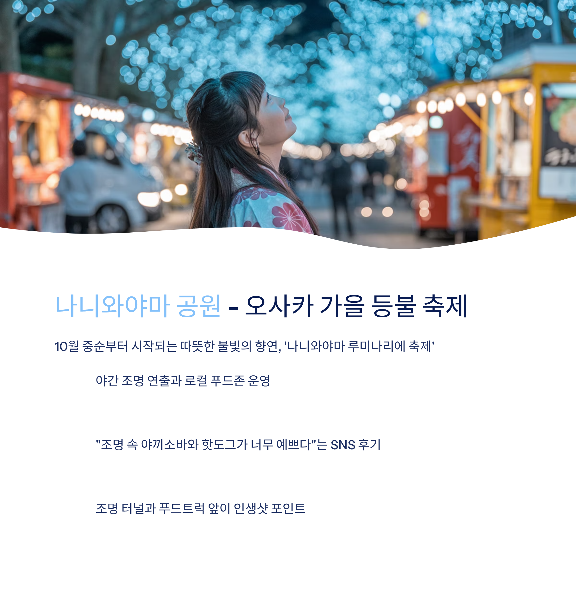 10월 중순부터 시작되는 '나니와야마 루미나리에 축제'는 공원 전체가 따뜻한 등불과 조명으로 장식되며, 라이브 음악과 푸드트럭이 함께 열립니다. SNS에서는 "조명 속 야끼소바와 핫도그가 너무 예쁘다"는 후기가 많습니다.