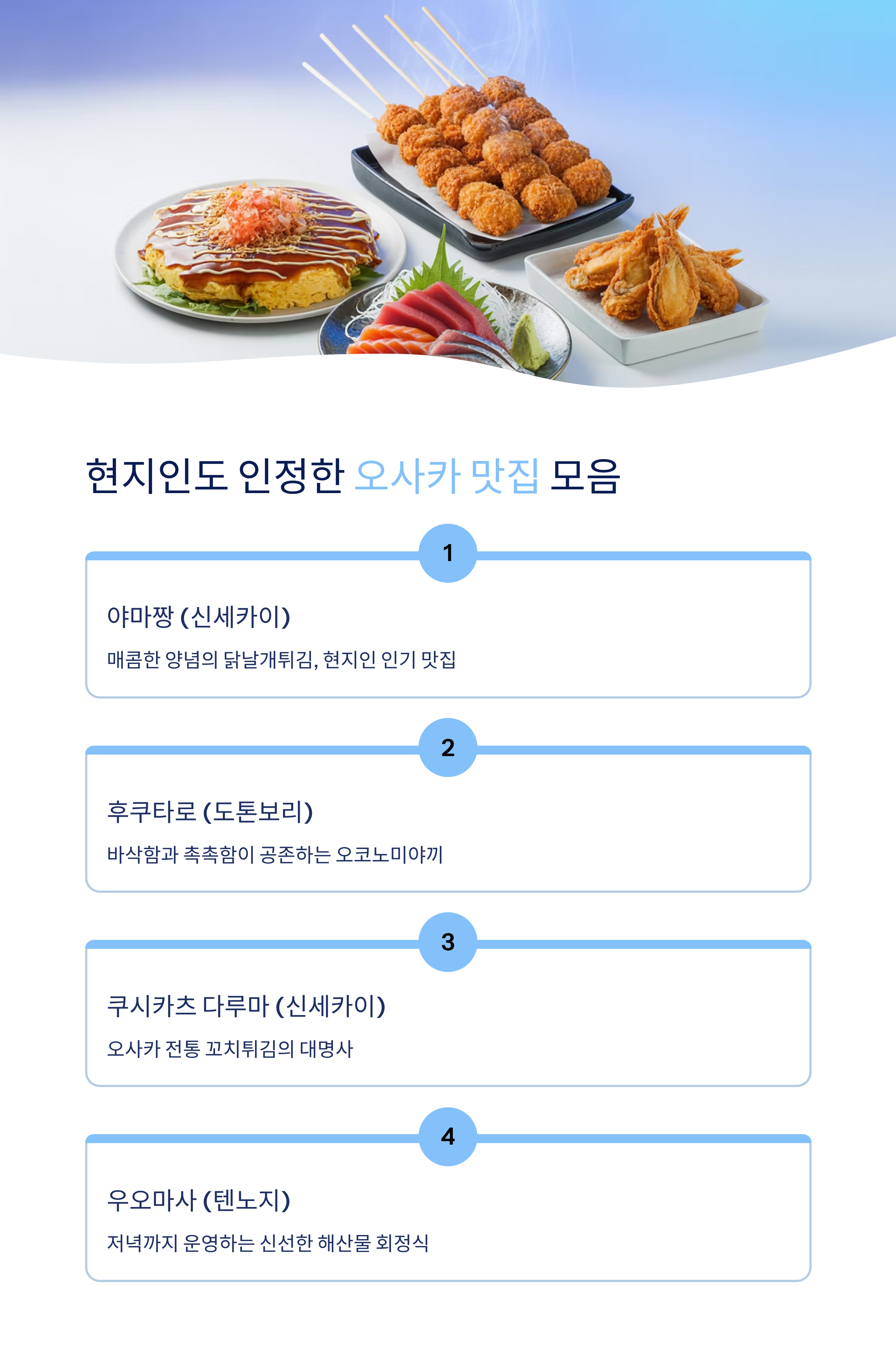 야마짱 신세카이 닭날개튀김 매콤한 양념으로 현지 인기 후쿠타로 도톤보리 오코노미야끼 바삭함과 촉촉함 공존 쿠시카츠 다루마 신세카이 꼬치튀김 오사카 전통 튀김 맛집 우오마사 텐노지 해산물 회정식 저녁까지 운영, 신선함 최고