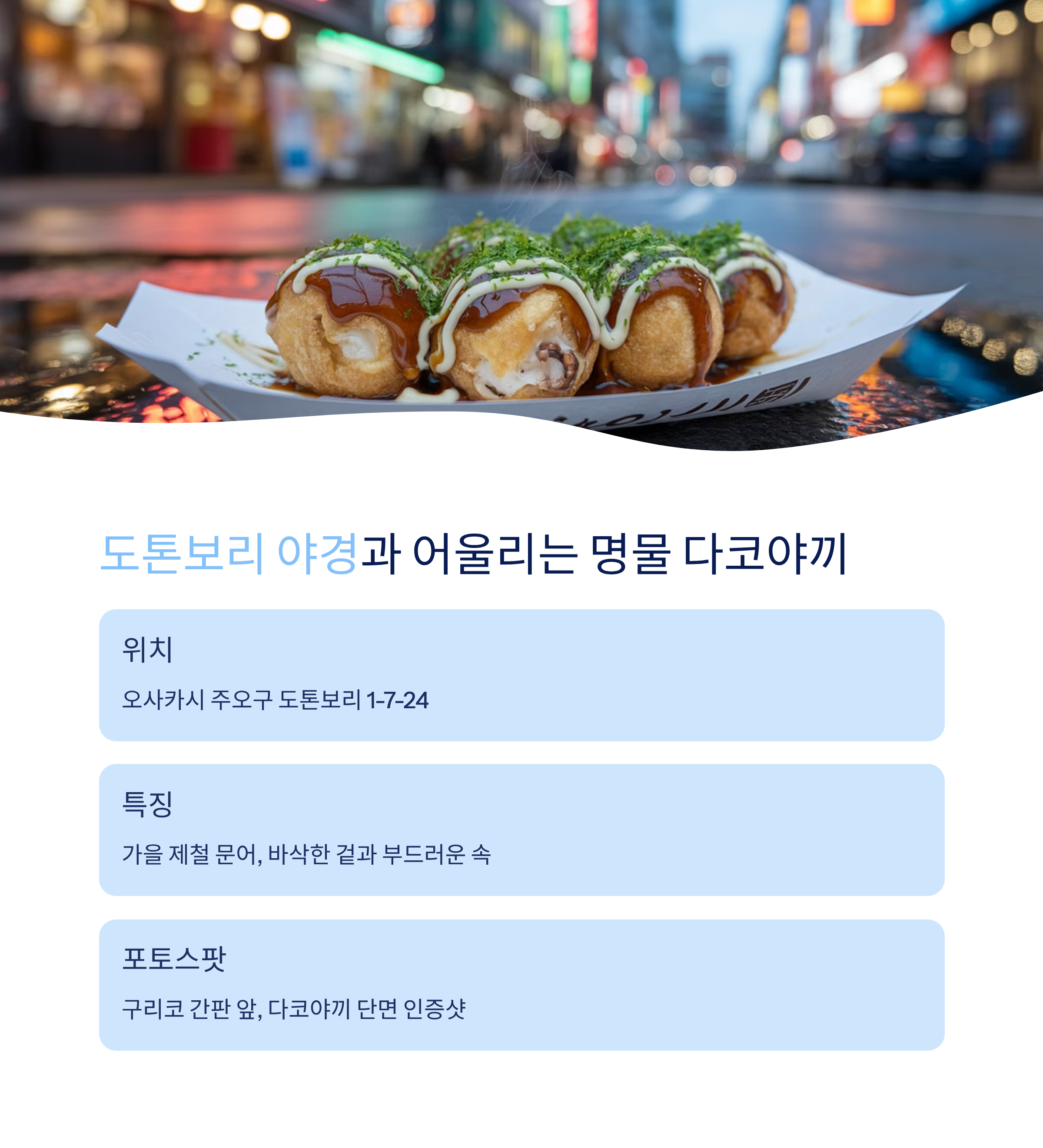 포토스팟: 구리코 간판 앞, 다코야끼 단면 인증샷