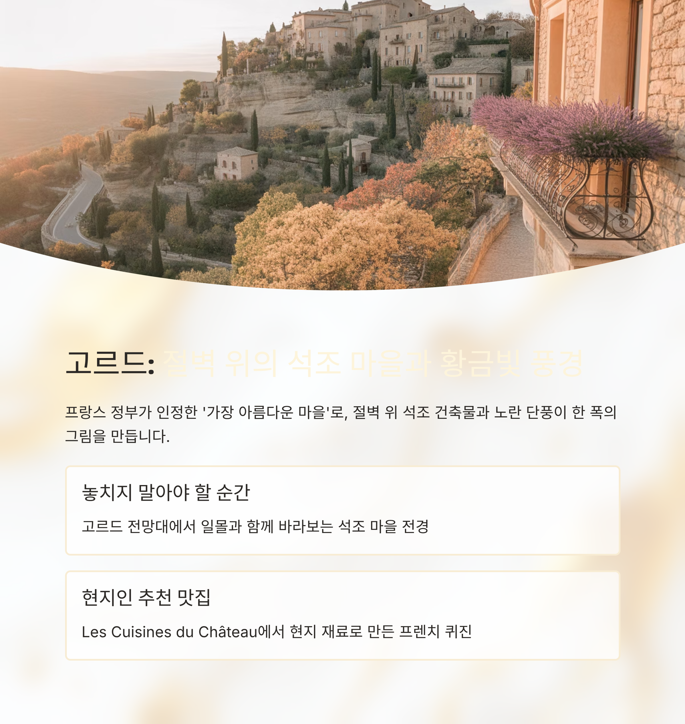 샤토 네프 뒤 파프 황금빛 포도밭 와인 시음, 포도밭 트레킹 와인 셀러, 언덕 위 일몰 루르마랭 중세마을+단풍 골목길 마켓, 성 산책, 브런치카페 성 주변 단풍길, 석조 거리 고르드 석조 절벽과 노란 단풍 예술 마을 투어, 고성 트레킹 고르드 전망대, 마을 전경 발롱솔 트러플+단풍드라이브 트러플 채집 체험, 농장 투어 트러플 나무길, 언덕 숲길