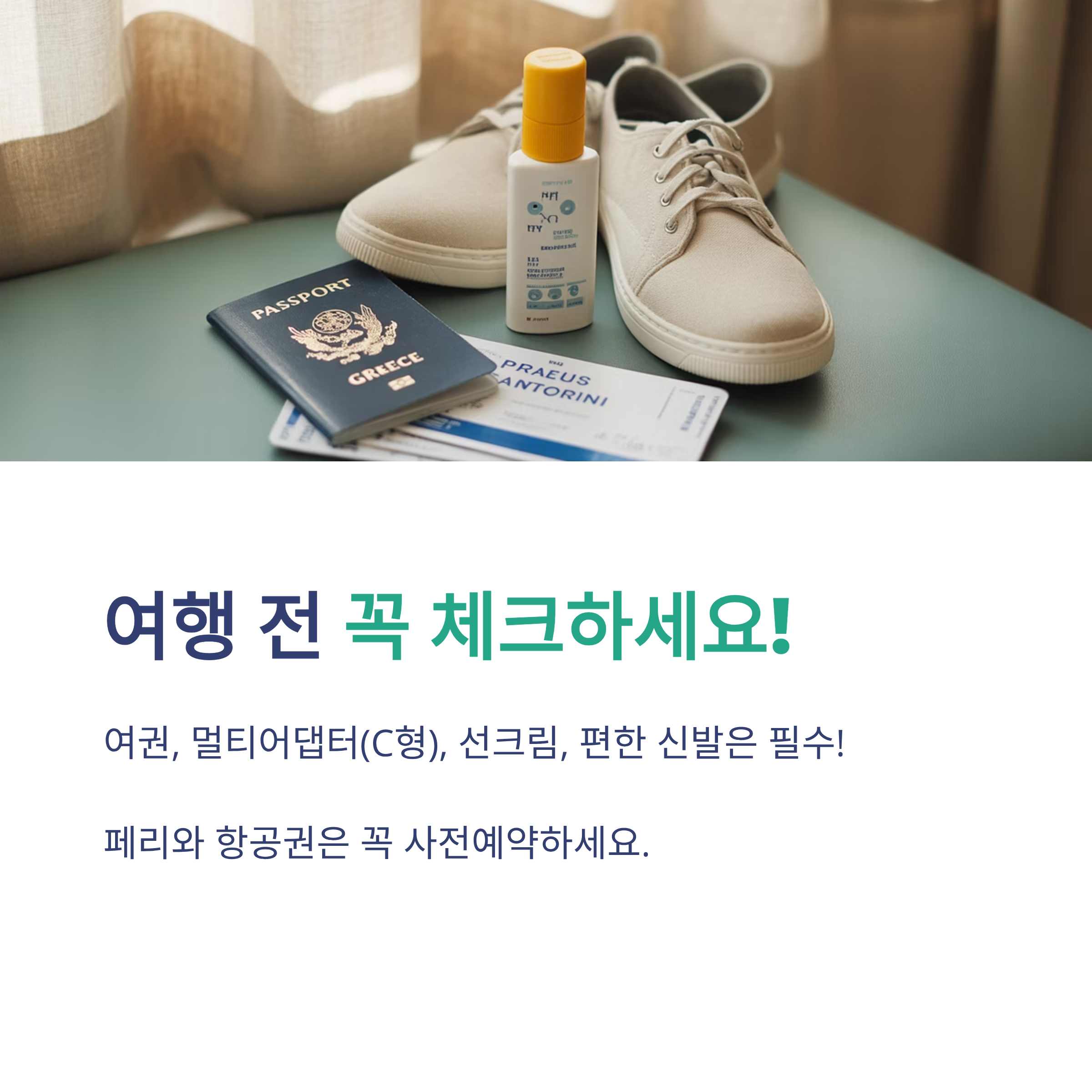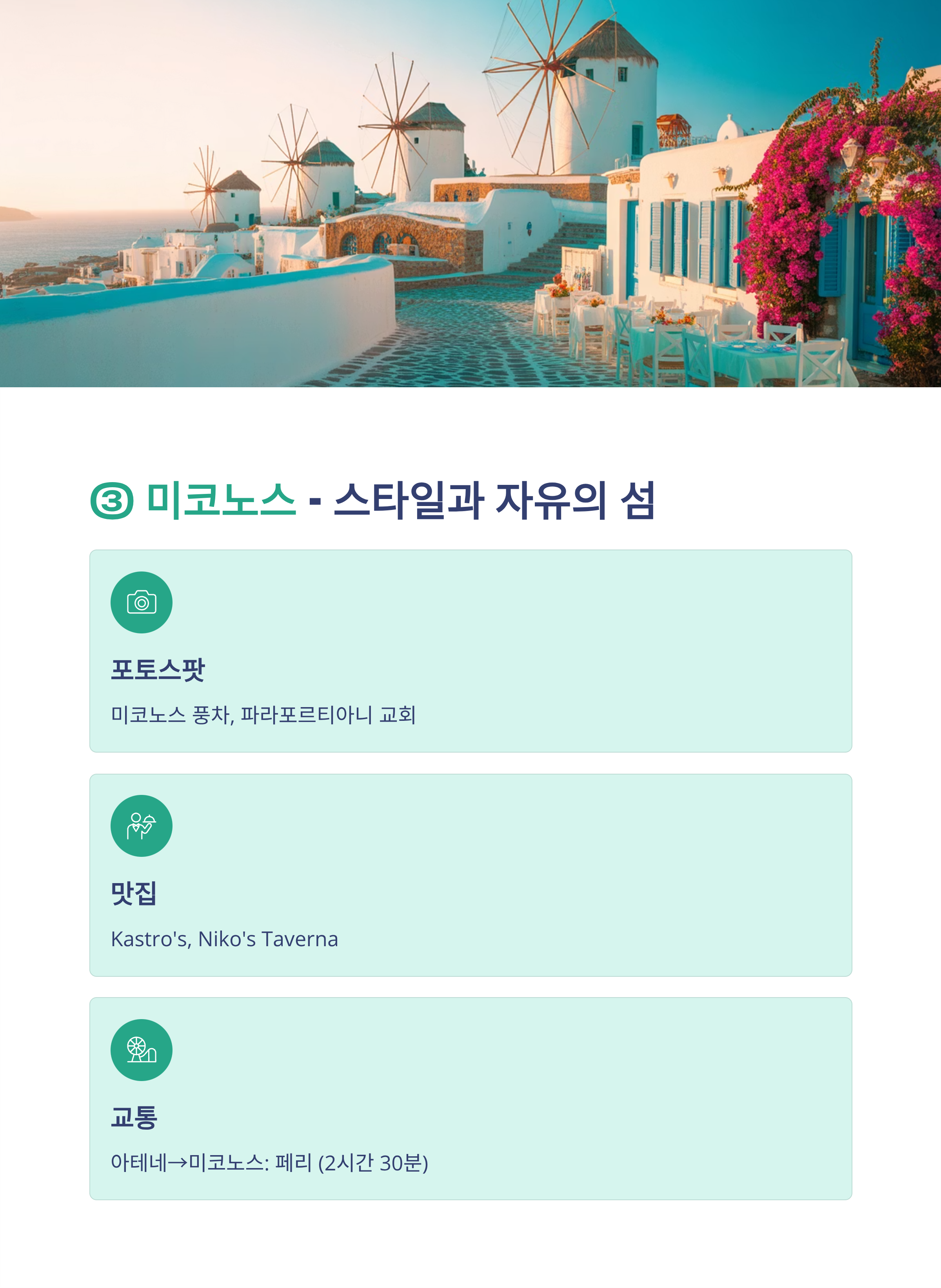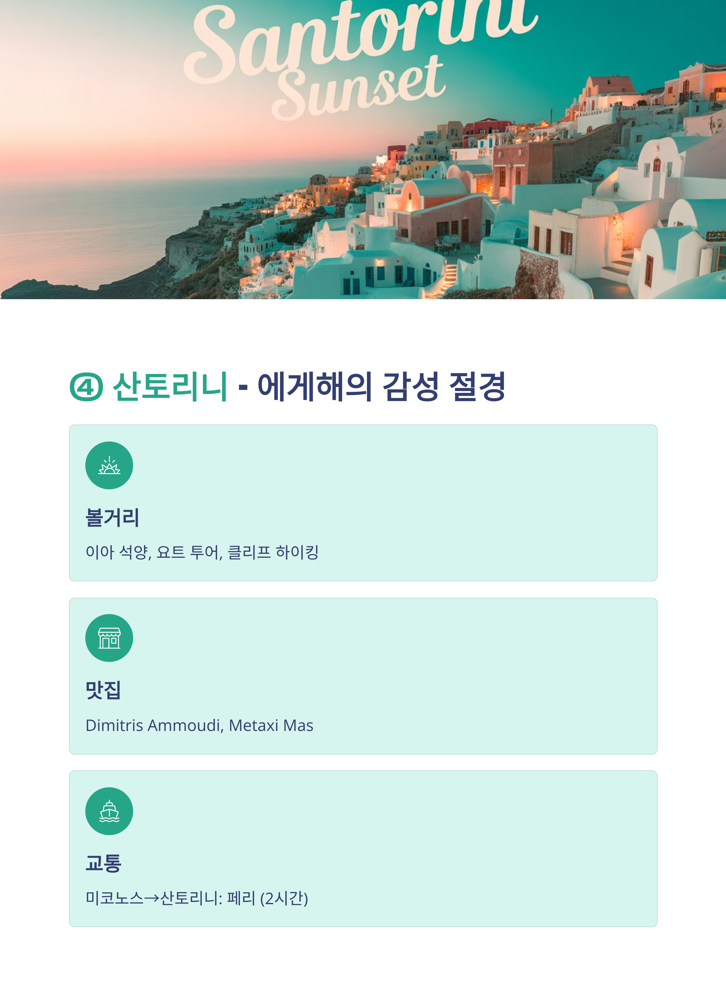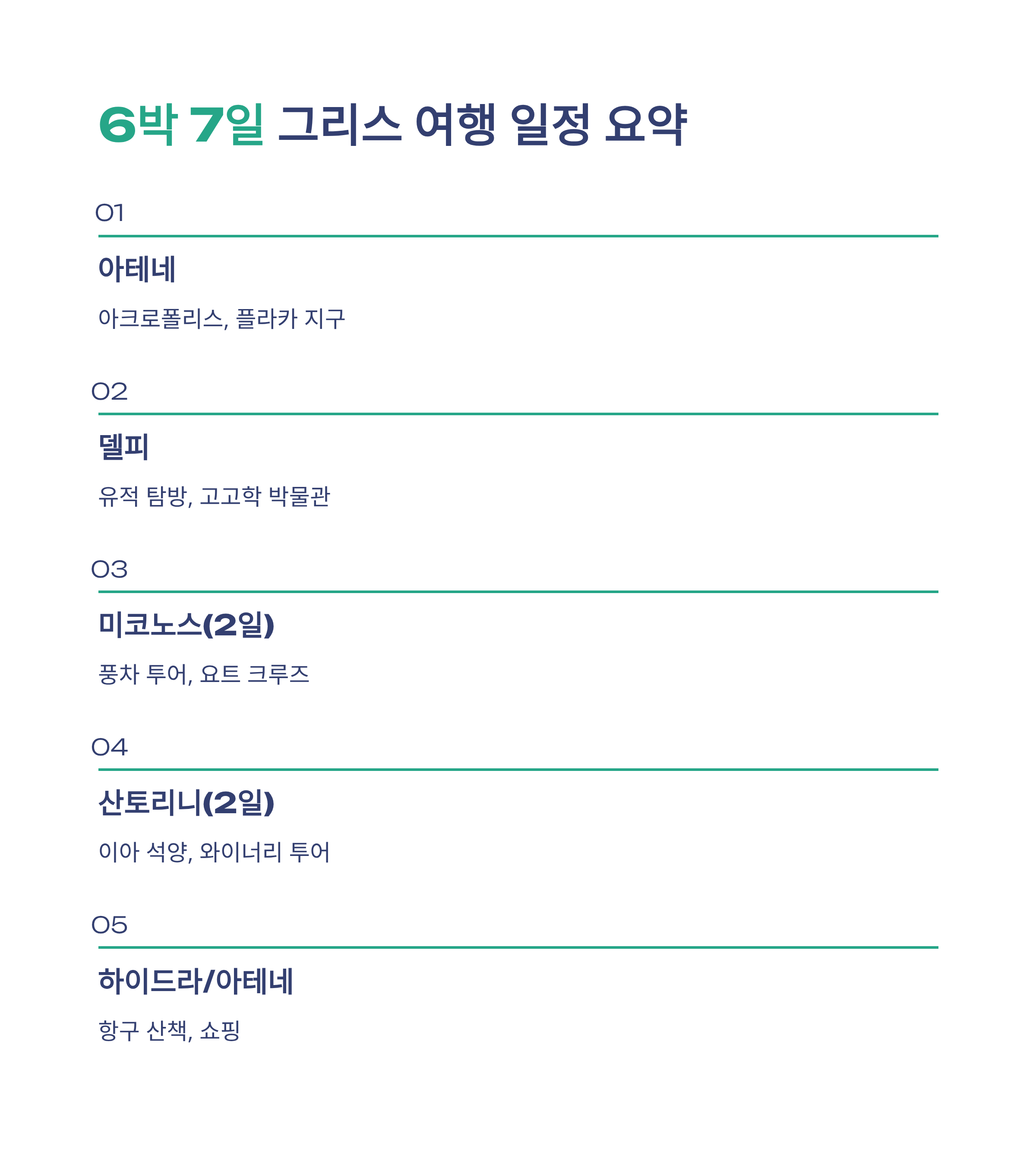 1일차 아테네 아크로폴리스, 플라카 지구, 루프탑 바 공항 → 지하철 M3 2일차 델피 유적 탐방, 고고학 박물관, 힐링 마을 산책 KTEL 버스 (왕복) 3일차 미코노스 풍차·골목 투어, 해변 일광욕 아테네 → 페리 or 비행기 4일차 미코노스 요트 크루즈, 리틀 베니스, 바 탐방 도보, 택시 5일차 산토리니 이아 석양, 와이너리 투어 미코노스 → 페리 6일차 산토리니 온천 투어, 블루돔 포토스팟, 해산물 저녁 셔틀버스, 도보 7일차 하이드라 or 아테네 항구 산책 or 아테네 자유일정, 쇼핑 피레우스 → 페리 or 도보