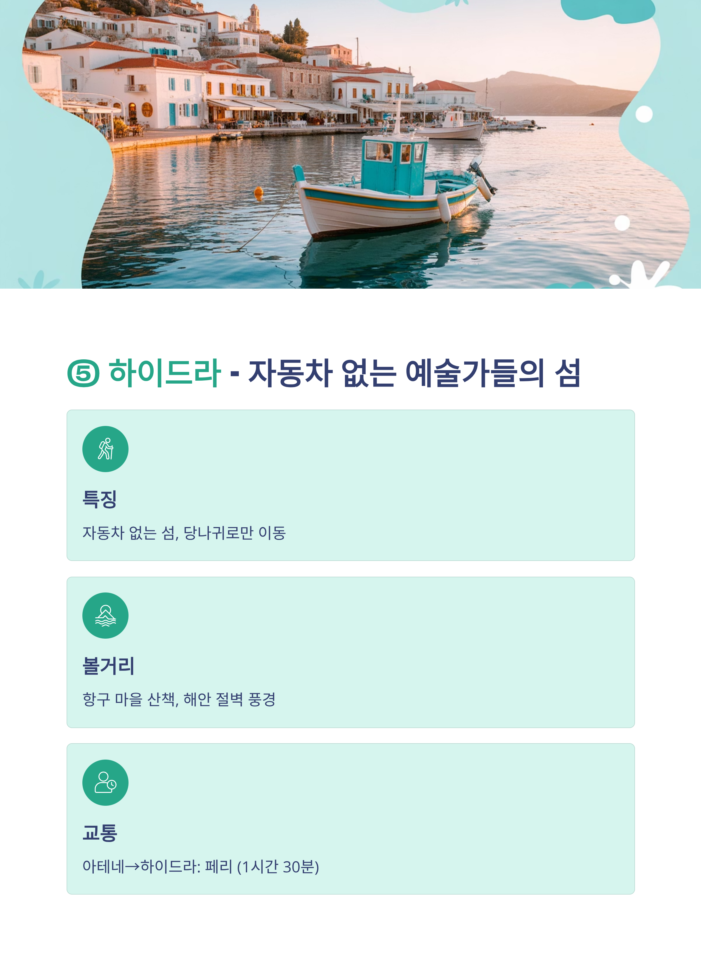 - 아테네 피레우스 항구 → 하이드라: 페리 약 1시간 30분 (Hellenic Seaways, 사전 예약 권장)