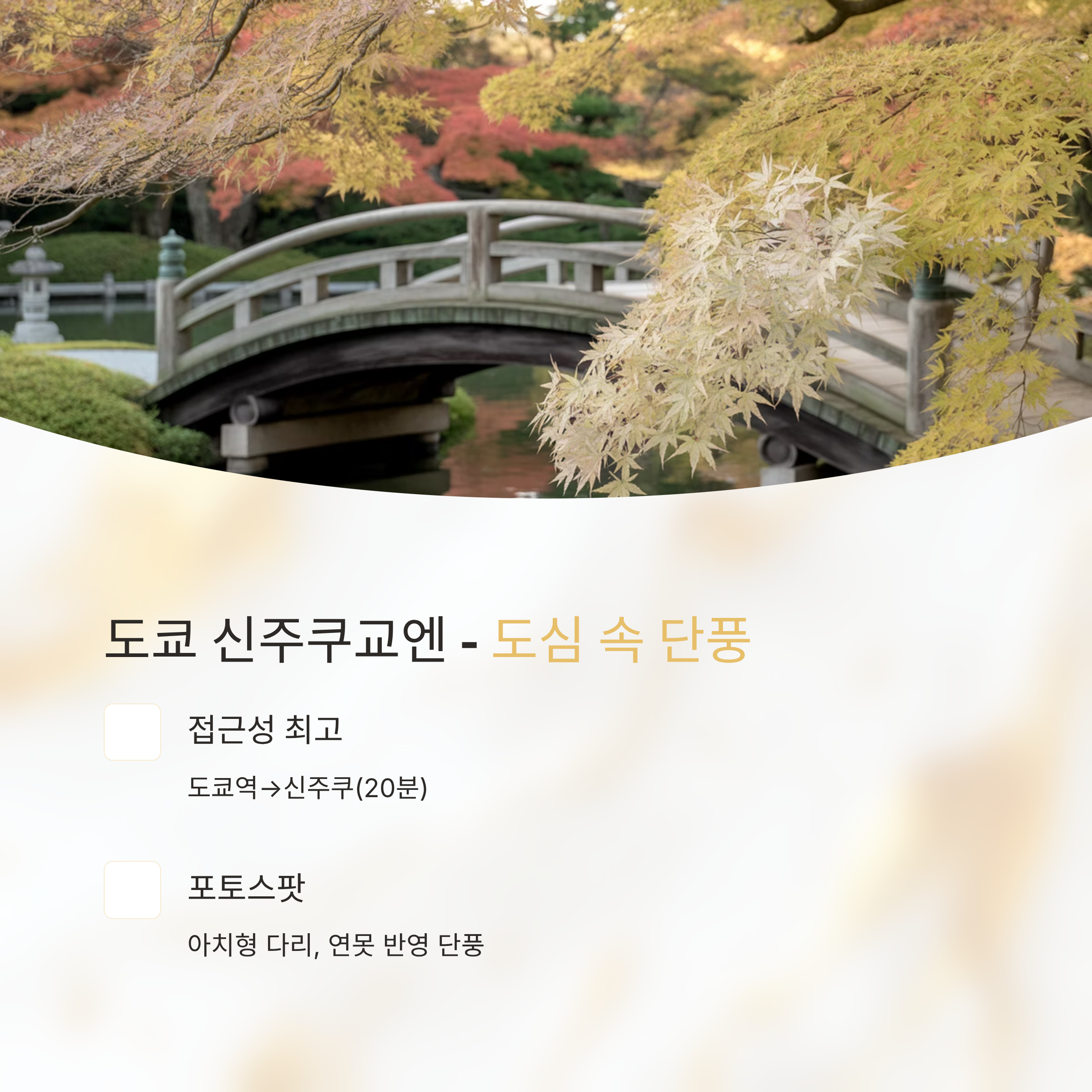 포토스팟: 일본 정원 내 아치형 다리, 연못 반영 단풍