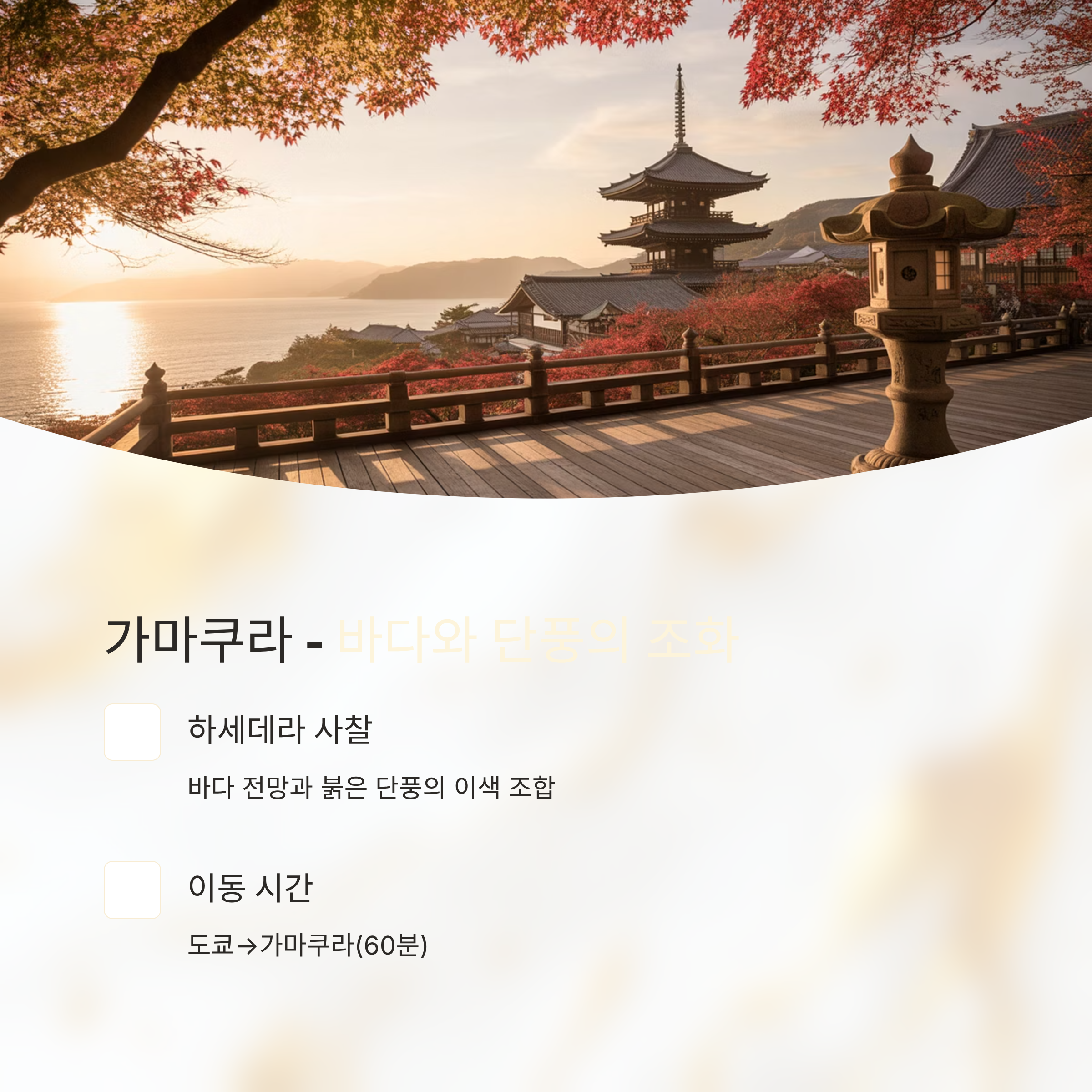 도쿄에서 1시간 거리, 가마쿠라는 전통 사찰과 바닷가가 어우러진 색다른 단풍 포인트. 인생샷 남기기 좋아요.