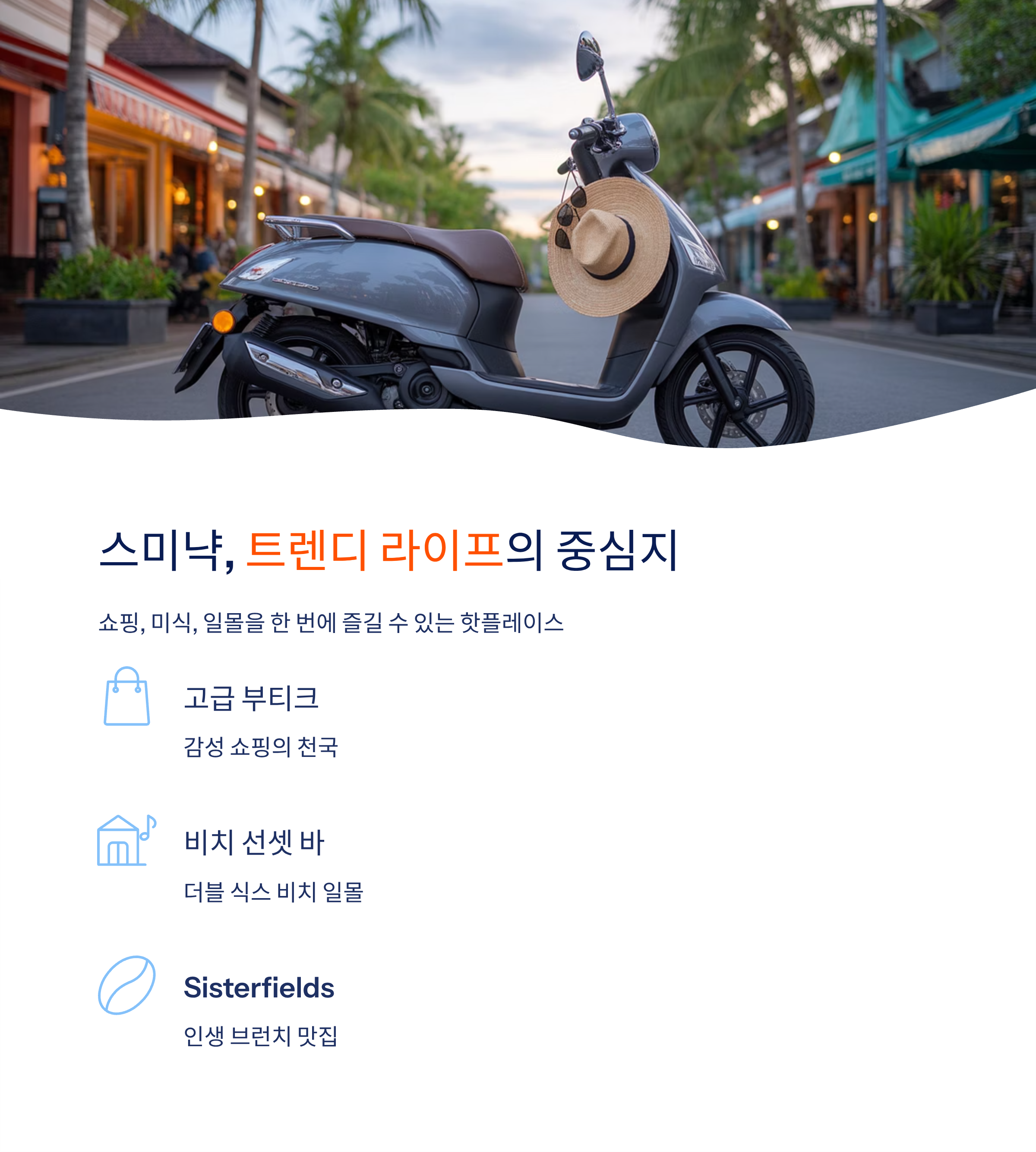 특징: 쇼핑과 미식, 일몰을 한 번에 즐길 수 있는 트렌디 지역즐길거리: