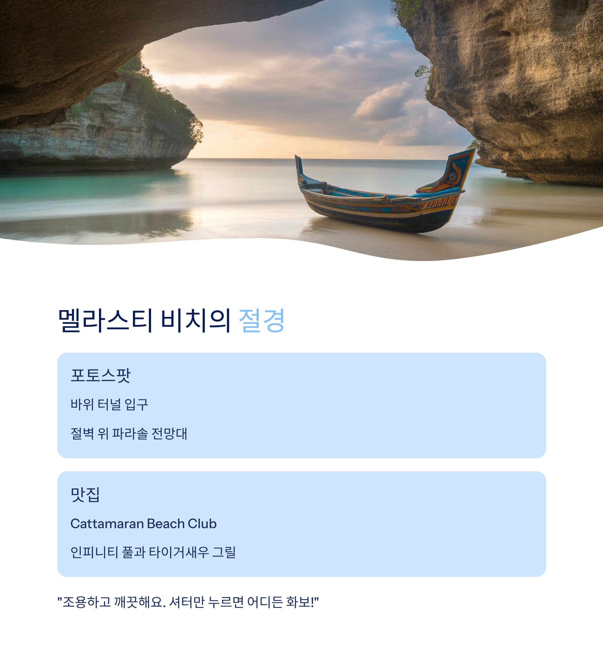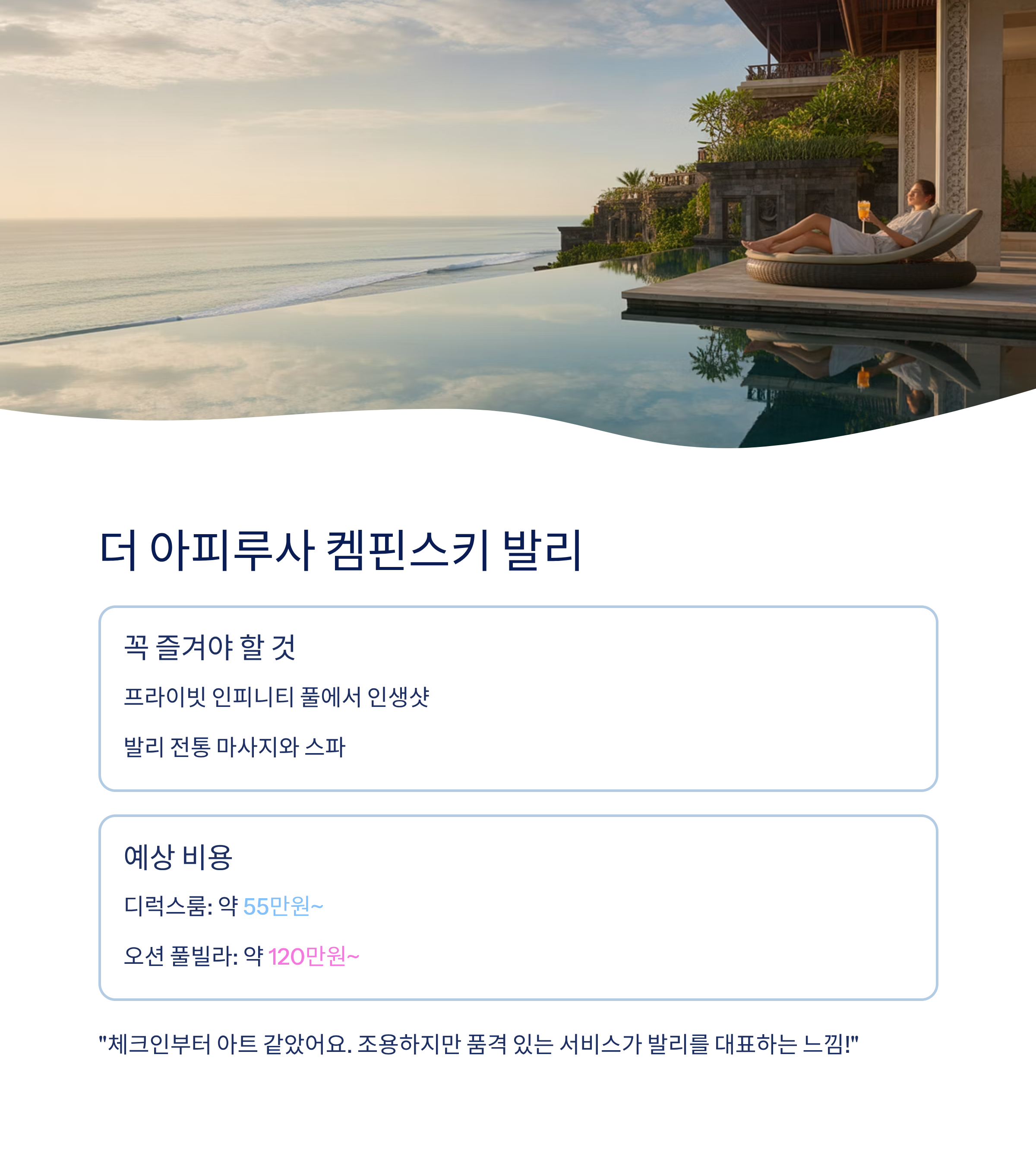 더 아피루사 절벽 위 풀빌라 리조트 Reef, Koral Restaurant 인피니티풀+워터가든 숙박: 1박 약 55~120만원, 이동: 약 40분 멜라스티 비치 드라이브+절벽 해변 Cattamaran, Ulu Cliffhouse 바위 터널+전망대 차로 약 50분 사마베 동굴디너 바닷가 프라이빗 코스요리 Crystal Blue, Rempah-Rempah 석양 동굴+촛불 디너 차로 약 45분 스미냑 쇼핑·브런치·일몰 Merah Putih, Sisterfields 야자수길+해변 일몰 중심지