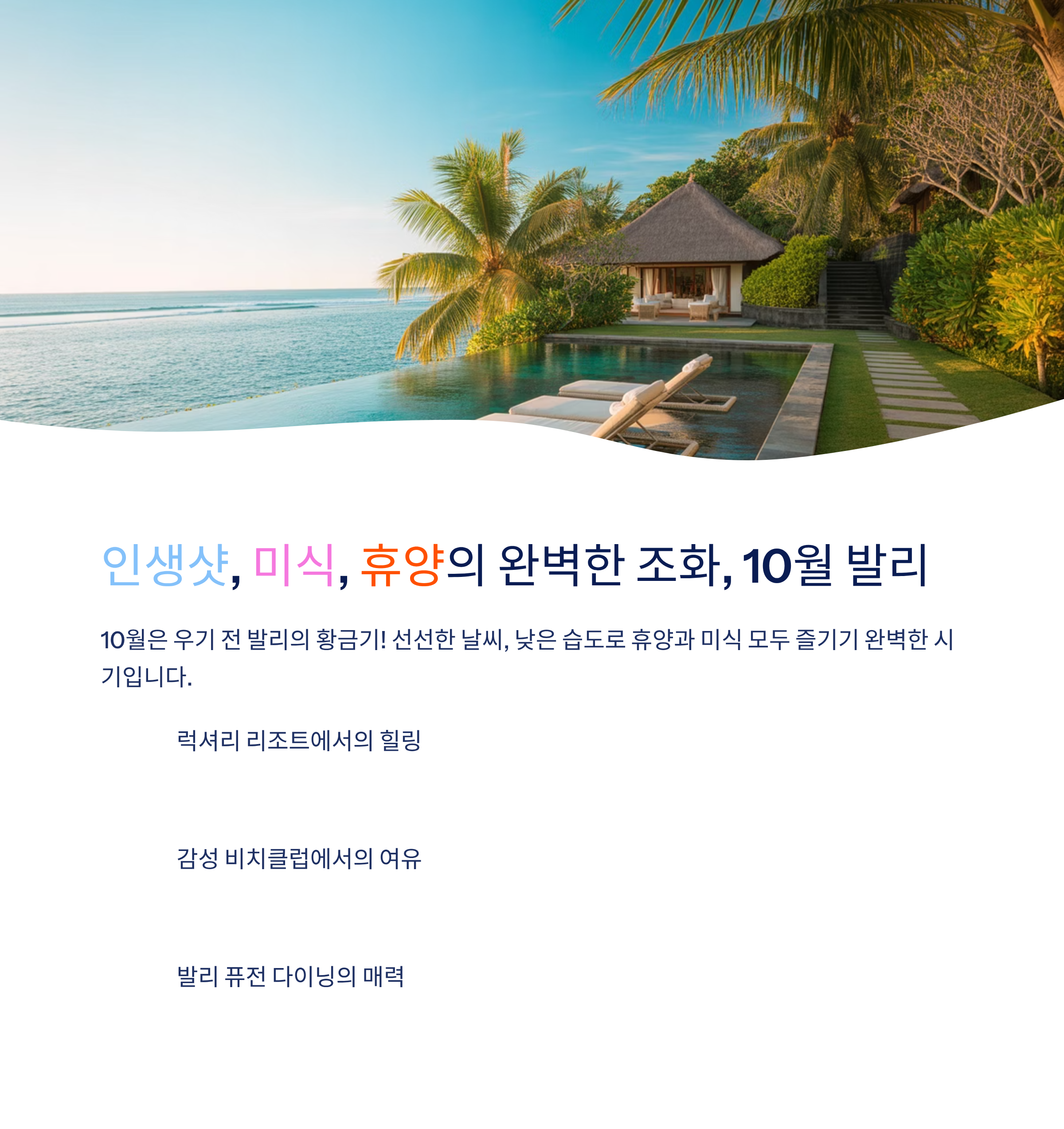 10월의 발리는 너무 덥지도 않고, 비도 적어 해변과 미식을 모두 즐기기에 최적입니다. 단순한 휴양지를 넘어 오감이 만족되는 곳, 그게 바로 발리의 진짜 매력이죠.
