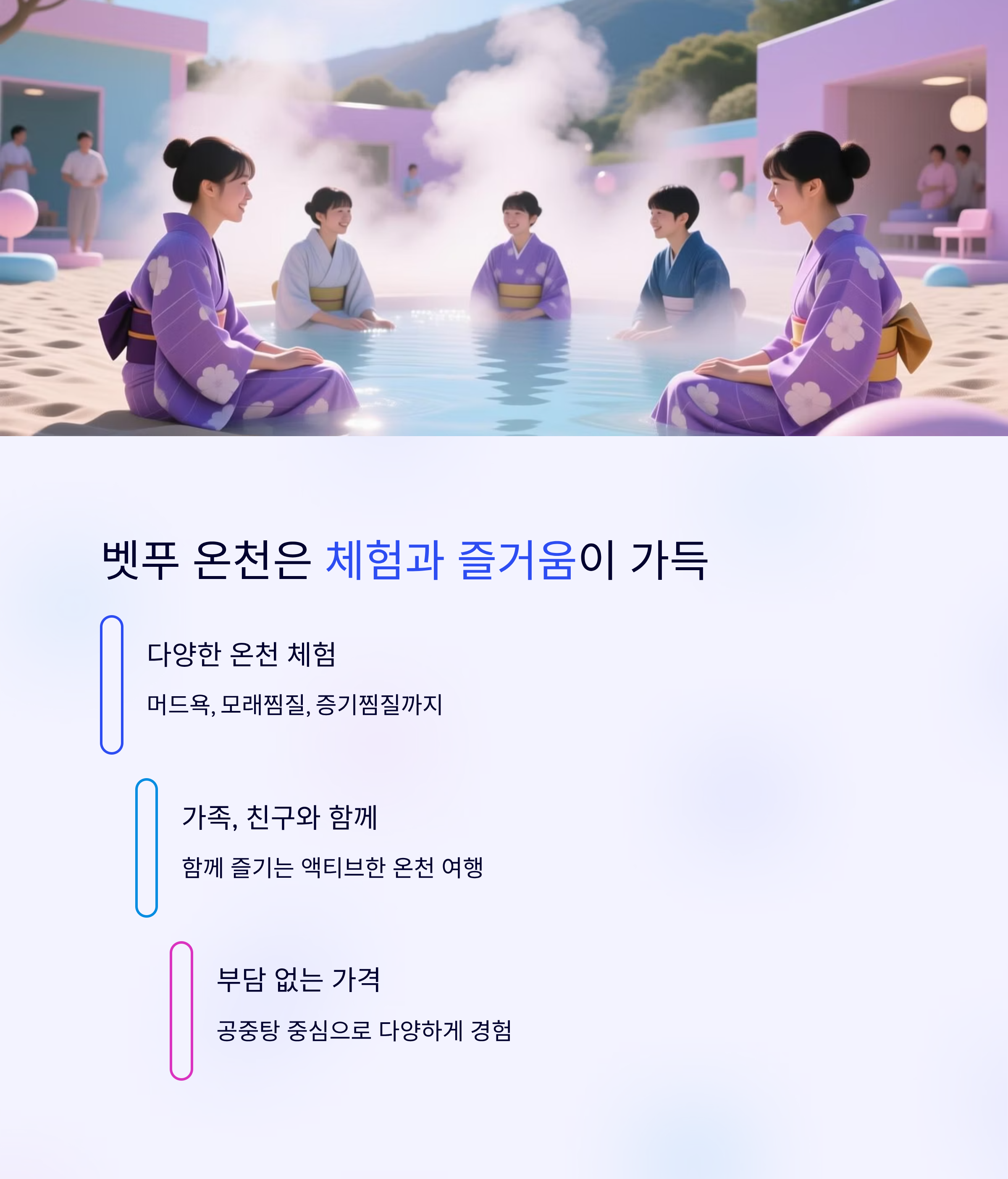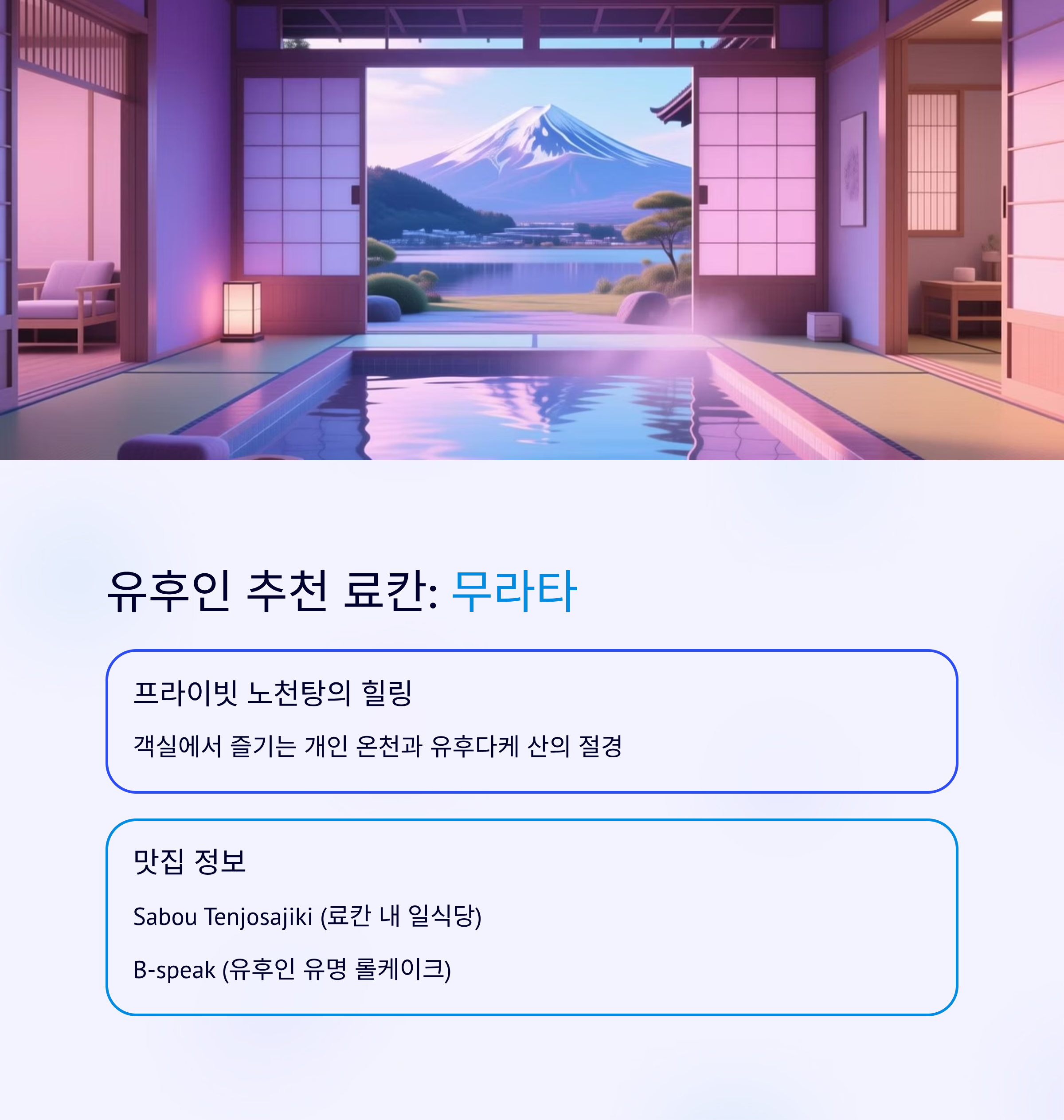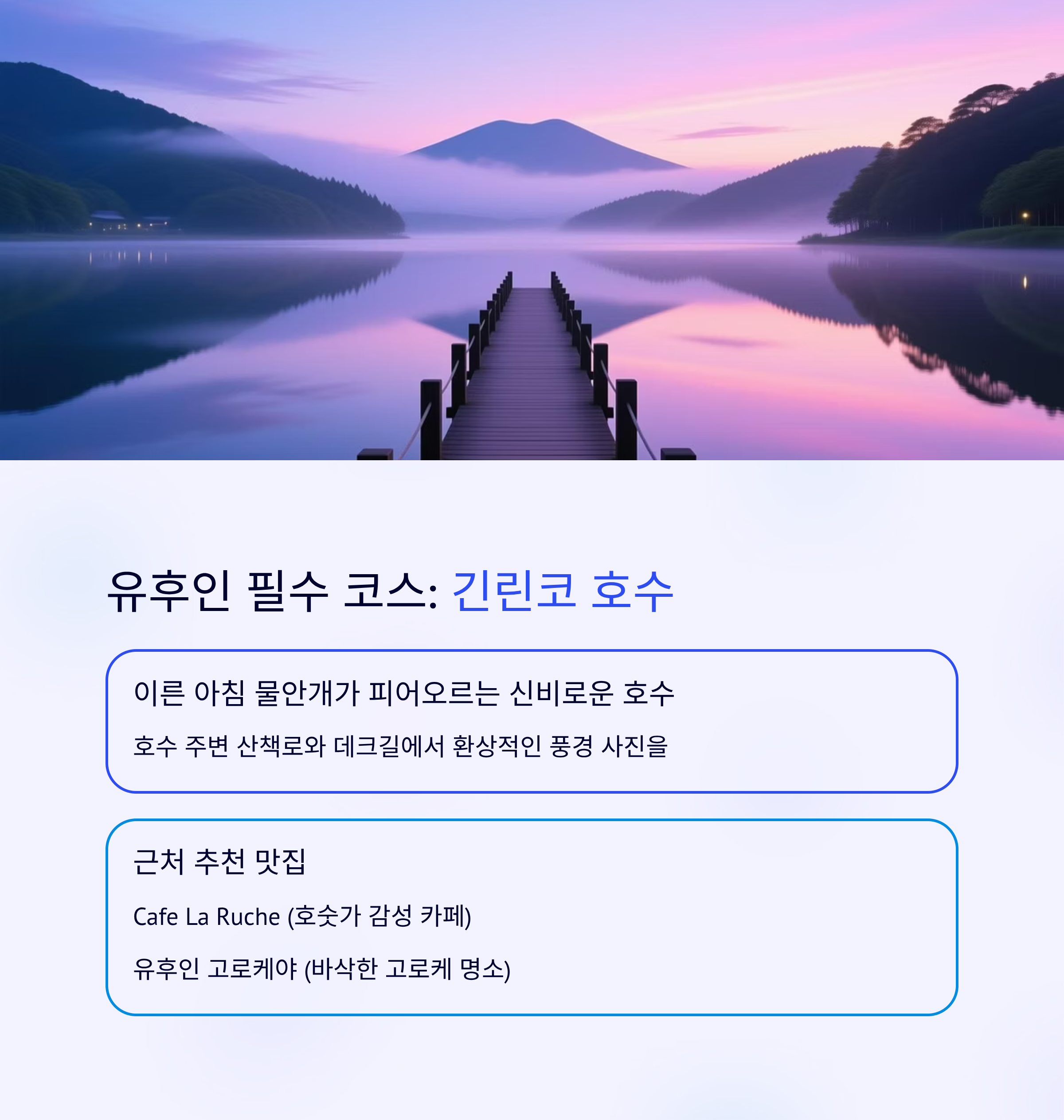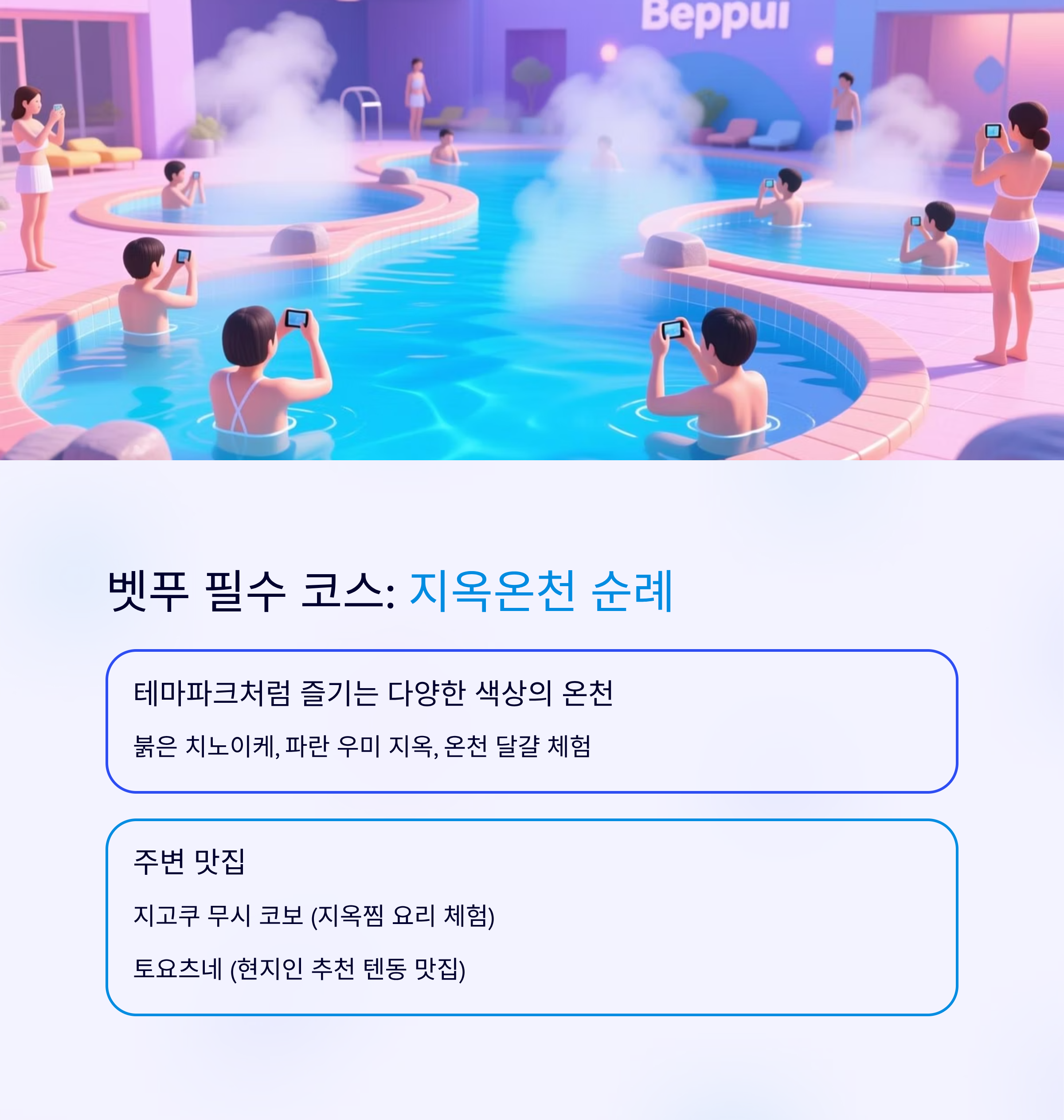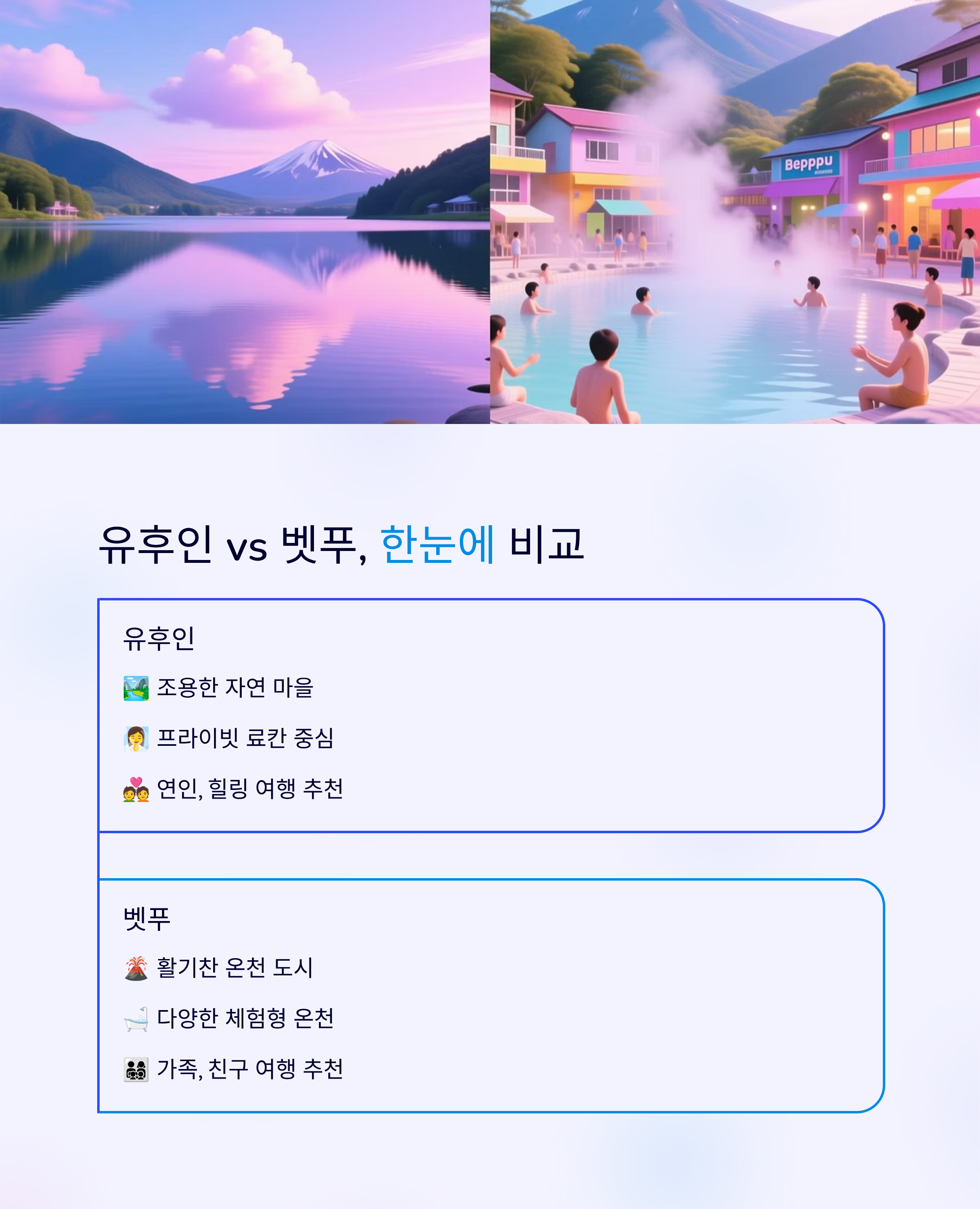 유후인과 벳푸는 각각 전혀 다른 매력을 가진 온천 마을입니다. 조용히 자연 속에서 머물고 싶다면 유후인이 정답이고, 가족과 함께 다양한 체험을 하고 싶다면 벳푸가 훨씬 만족스러울 거예요.