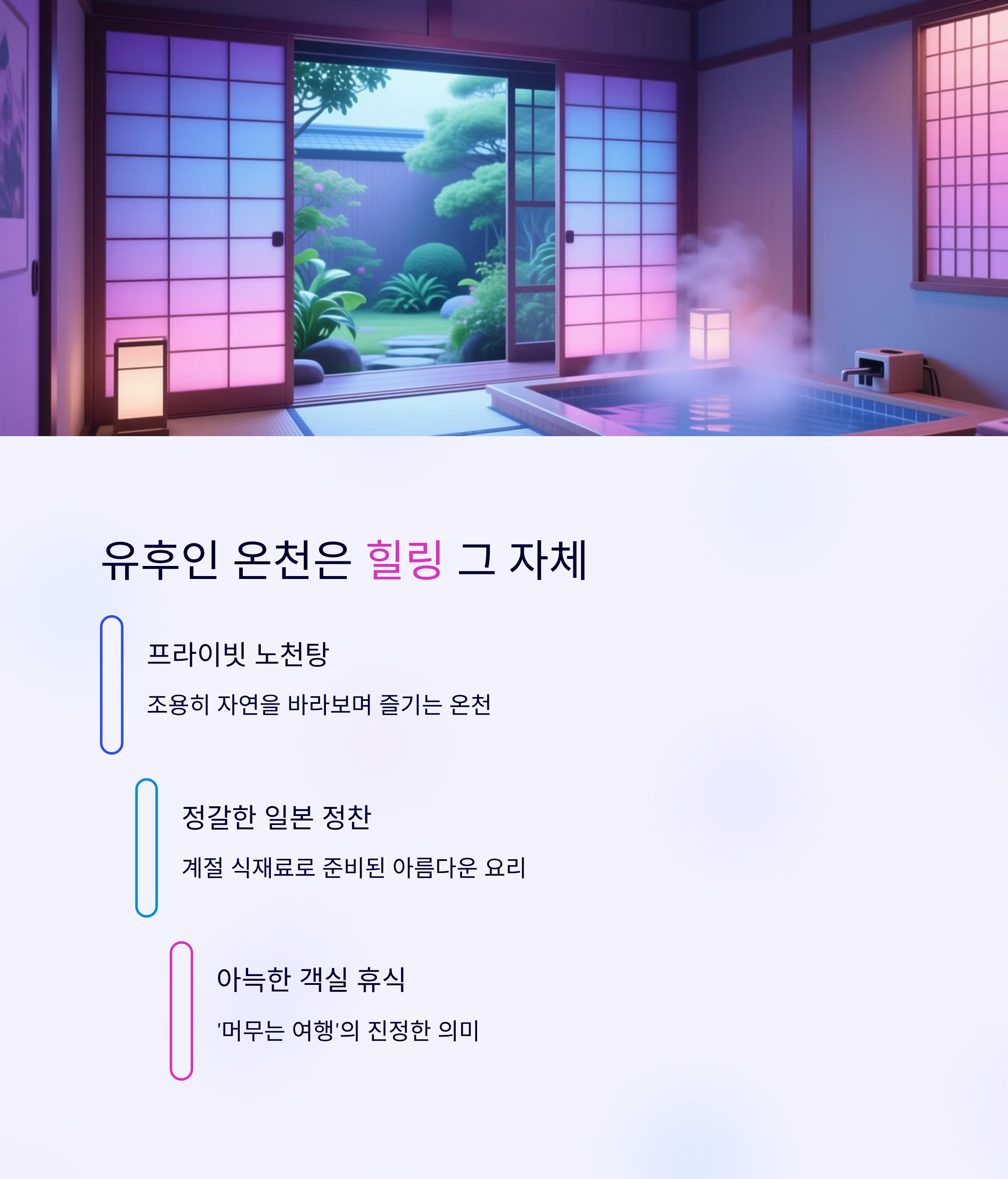 유후인의 온천은 대부분 조용한 료칸 중심으로 운영되며, 하루 종일 시간을 들여 감성적으로 즐길 수 있는 스타일이에요. 프라이빗 노천탕, 정갈한 식사, 아늑한 객실에서의 휴식까지 ‘머무는 여행’의 정수를 느낄 수 있습니다.