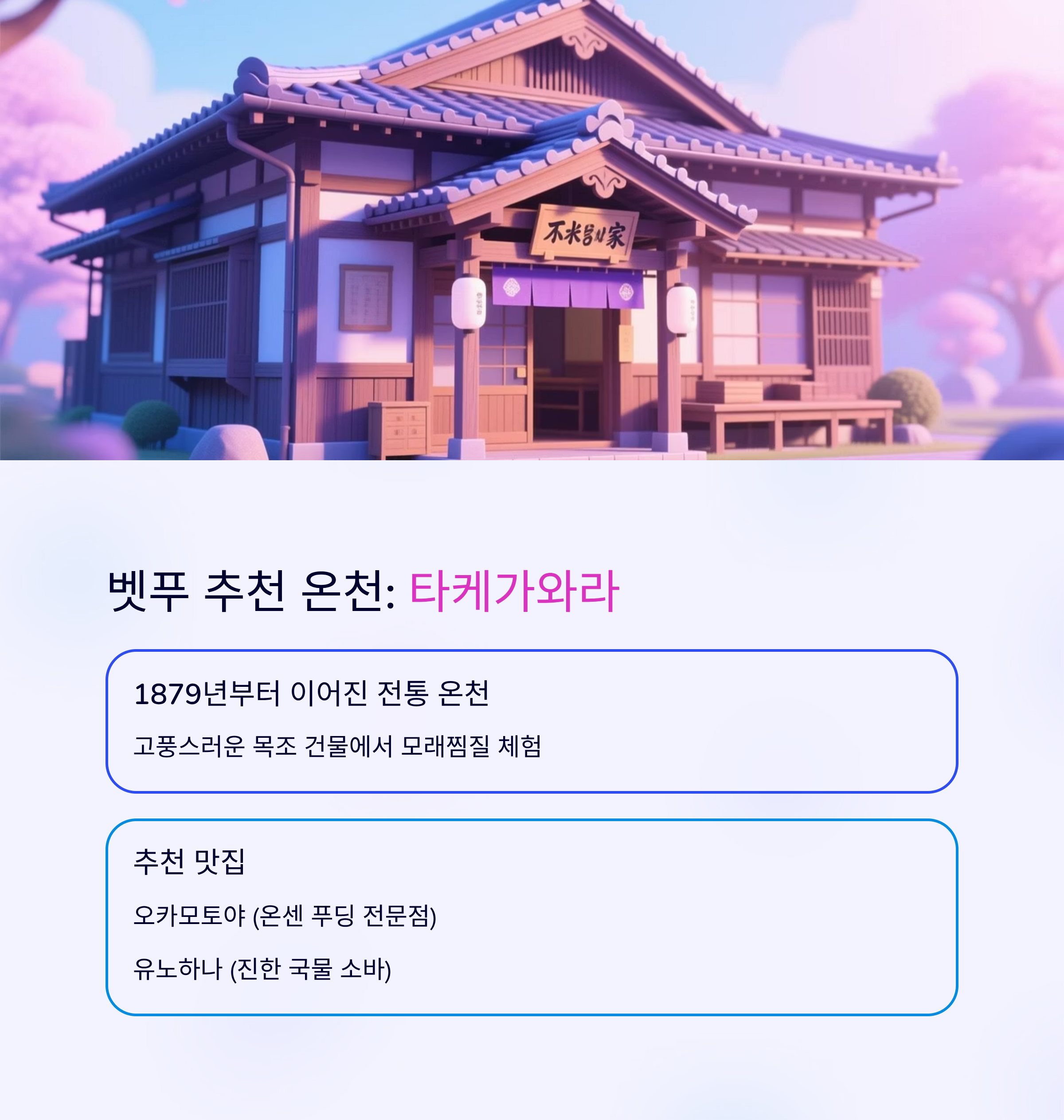 - 즐길거리: 전통 일본식 목욕 체험, 모래찜질로 피로 회복, 고풍스러운 온천 건물 감상