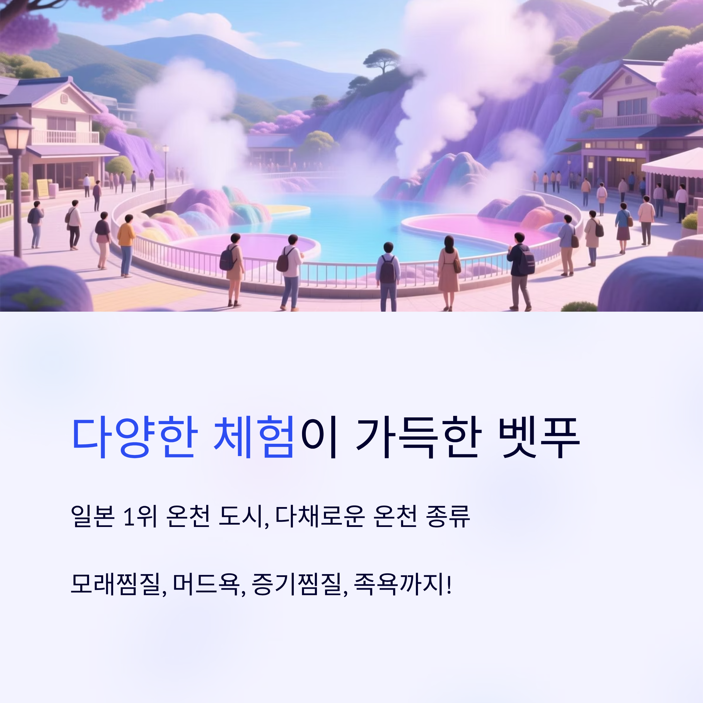 벳푸는 일본에서도 손꼽히는 대규모 온천 도시로, 온천 수와 온천 종류 모두 전국 1위 수준입니다. 모래찜질, 머드욕, 증기찜질, 족욕 등 다양한 체험형 온천이 준비되어 있어요.
