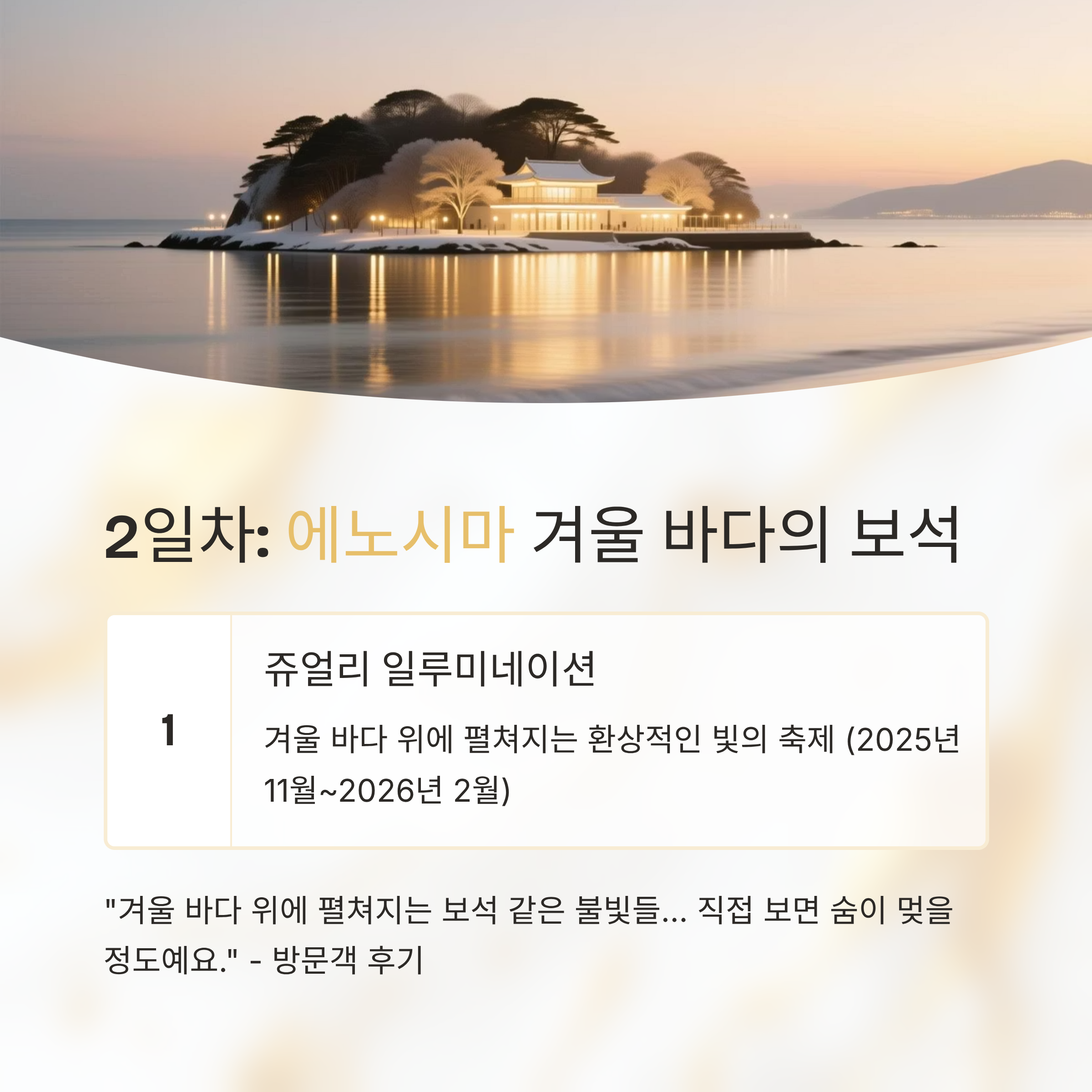 "겨울 바다 위에 펼쳐지는 보석 같은 불빛들… 직접 보면 숨이 멎을 정도예요." - 주변맛집: