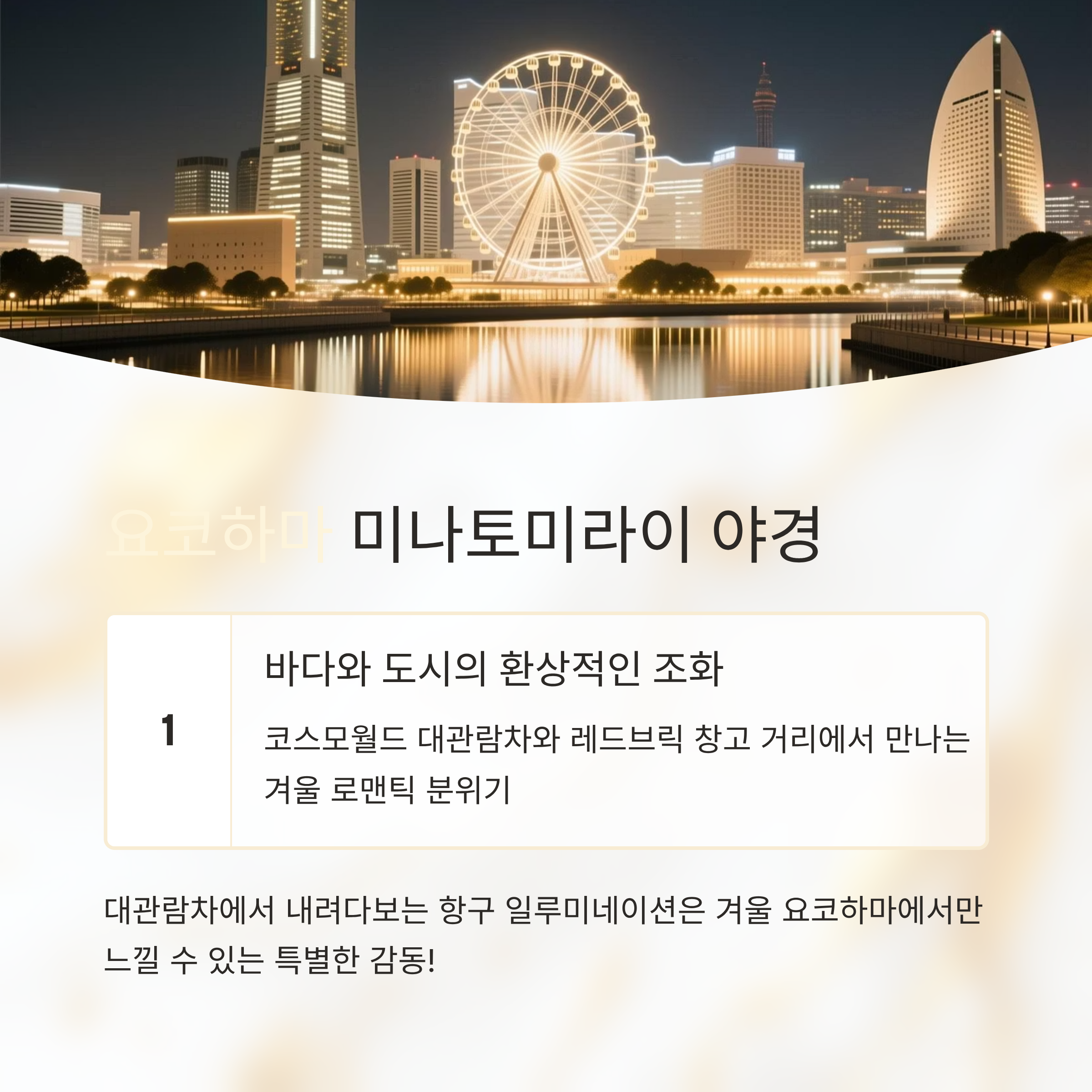 - 특징: 바다와 어우러진 도시 야경, 대관람차, 쇼핑몰