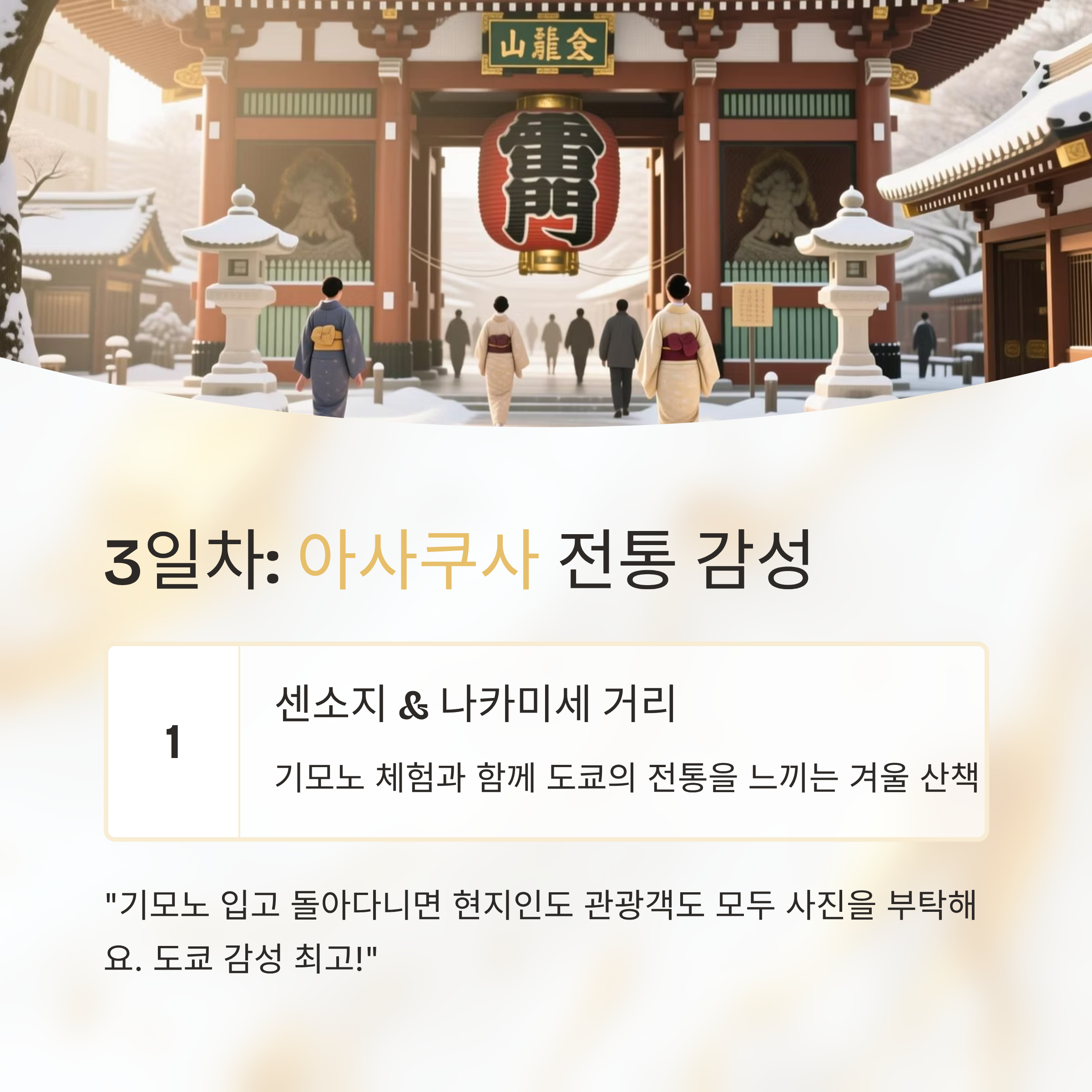 - 특징: 도쿄의 대표 전통 거리, 신년 참배로도 인기
