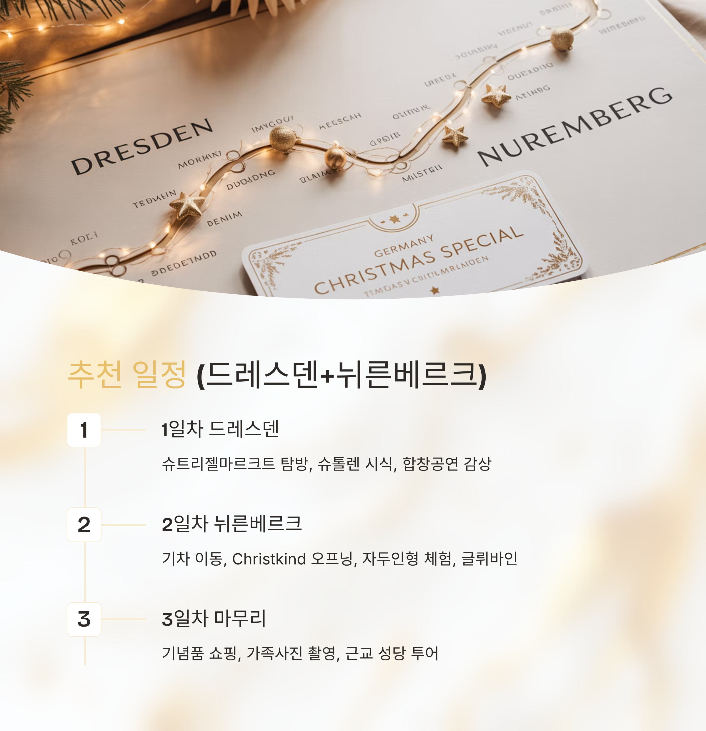 1일차 드레스덴 도착, 시내 호텔 체크인 슈트리젤마르크트 탐방, 슈톨렌 시식 합창 공연 감상, 전통 레스토랑 저녁 식사 2일차 기차로 뉘른베르크 이동 Christkind 오프닝 보기, 자두 인형 체험 레브쿠헨 쇼핑, 야경 촬영, 글뤼바인 한잔 3일차 마켓 기념품 쇼핑 + 가족사진 촬영 근교 성당 혹은 박물관 투어 귀국 준비 or 기차로 다음 도시 이동