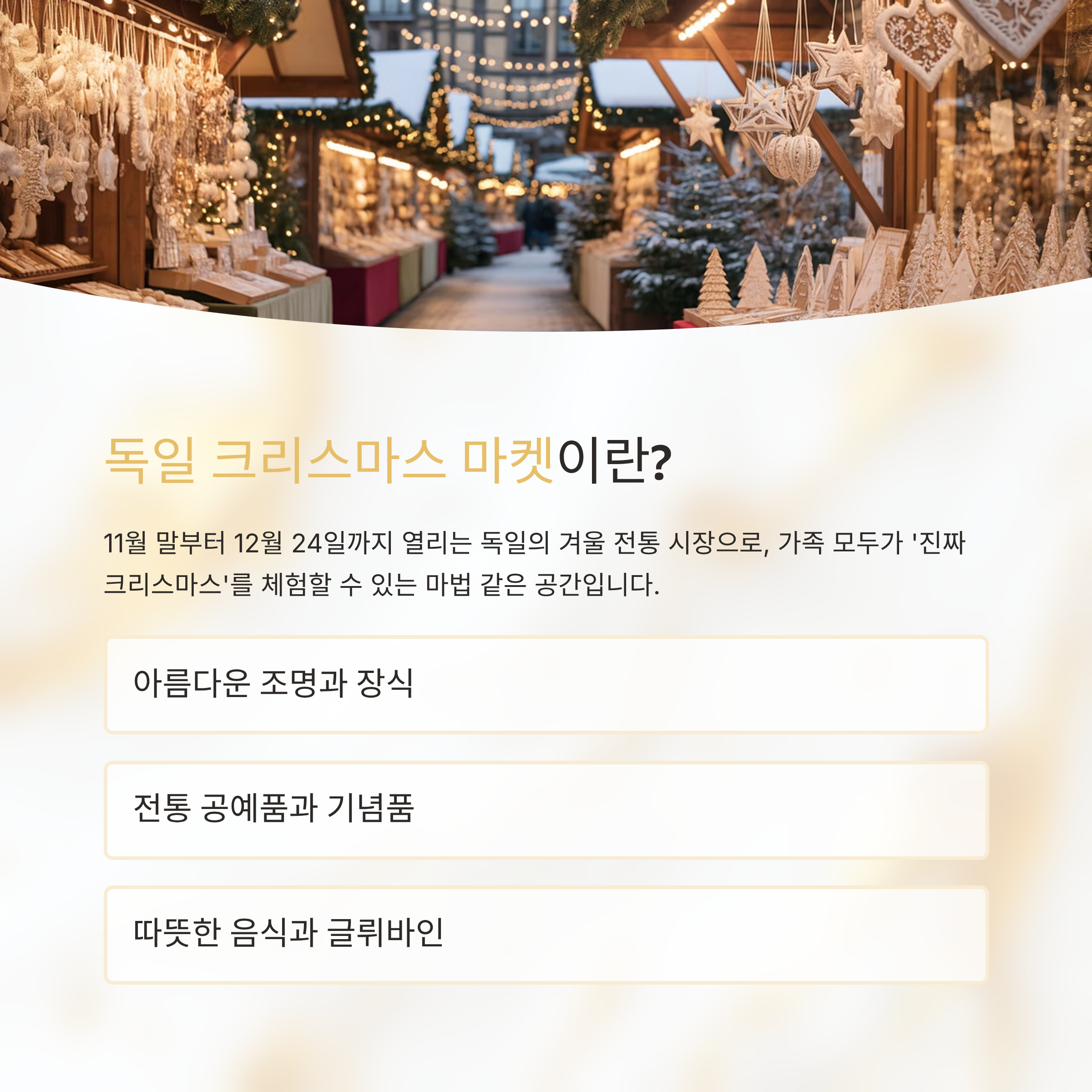 그 중심엔 매년 11월 말부터 12월 24일까지 열리는 **크리스마스 마켓(Weihnachtsmarkt)**이 있죠.
