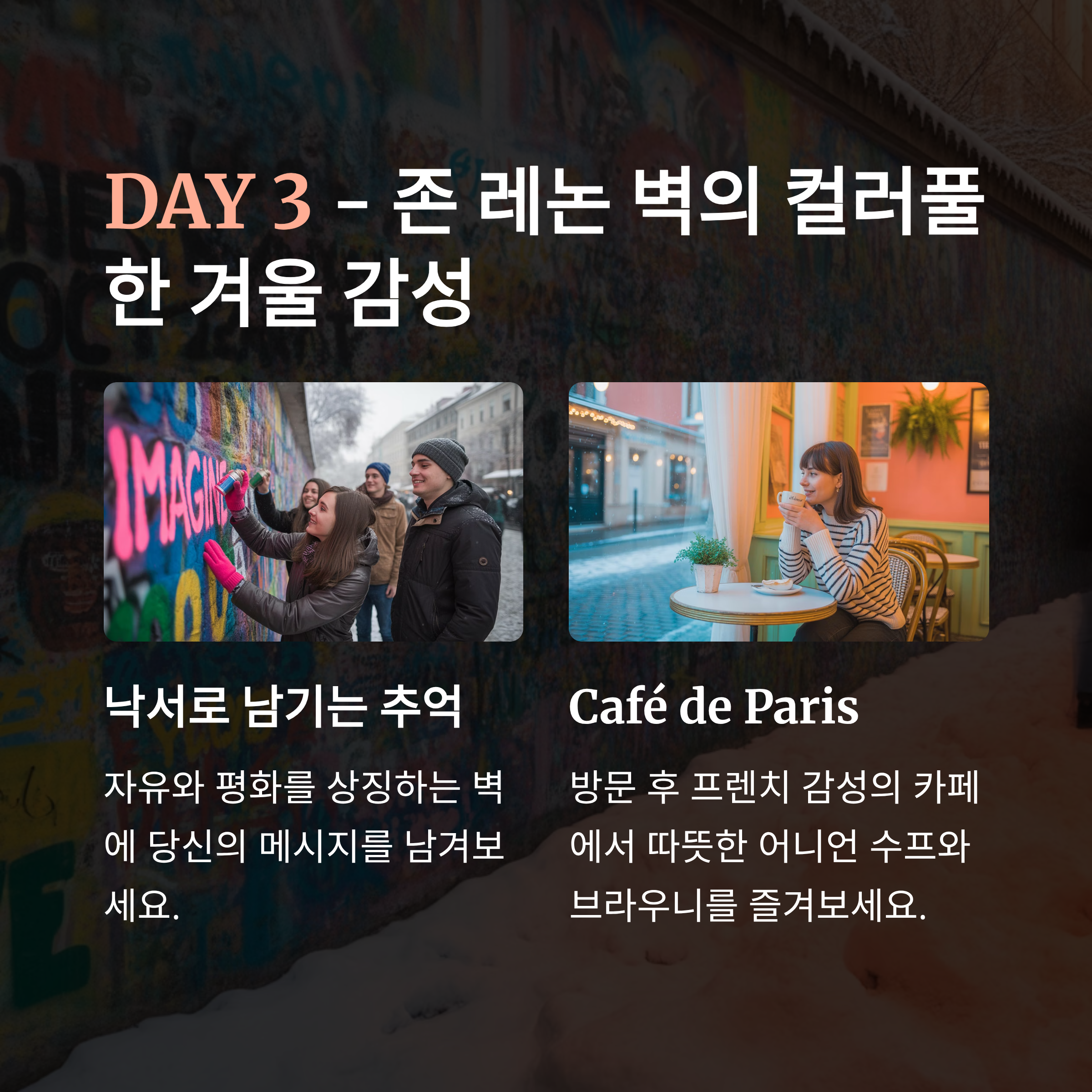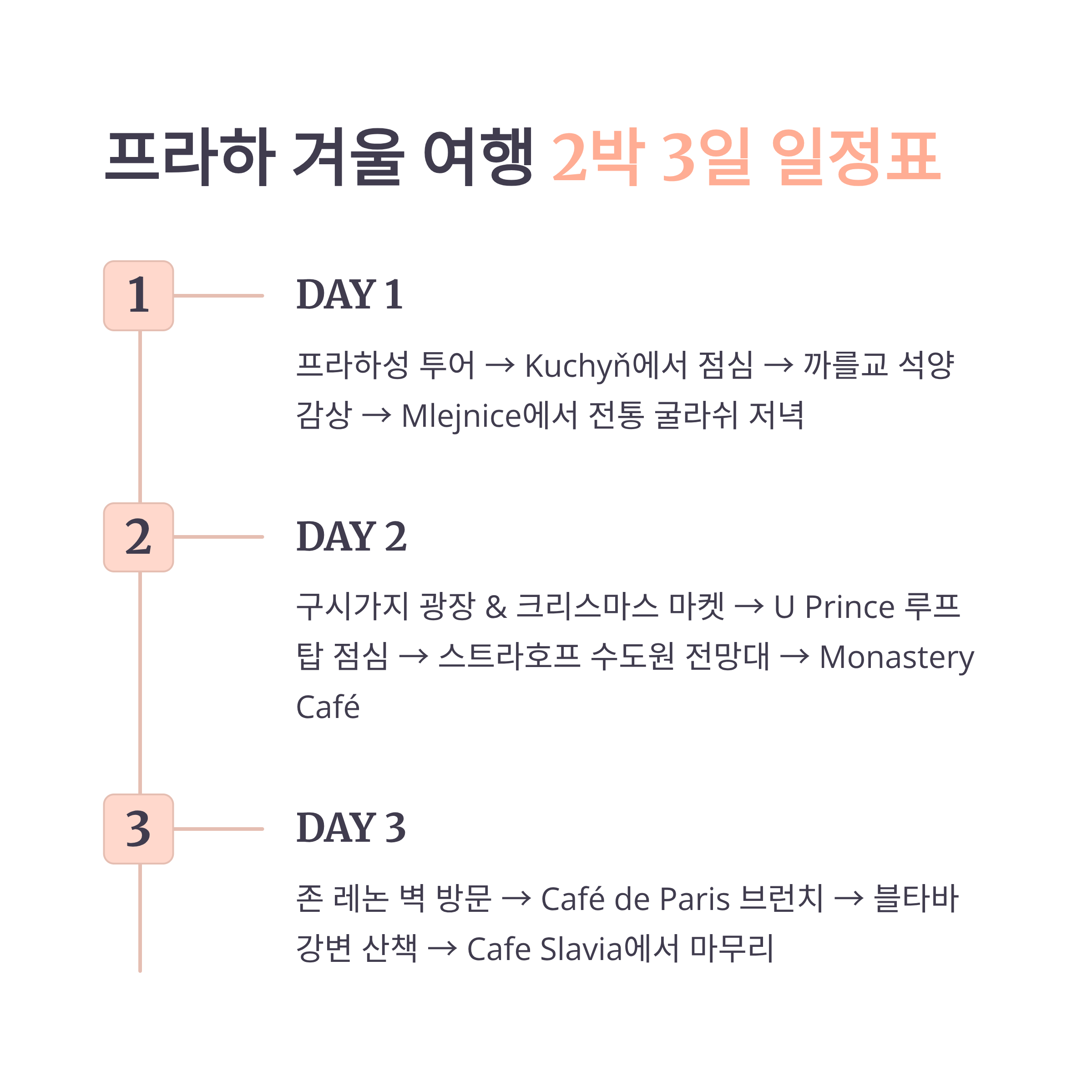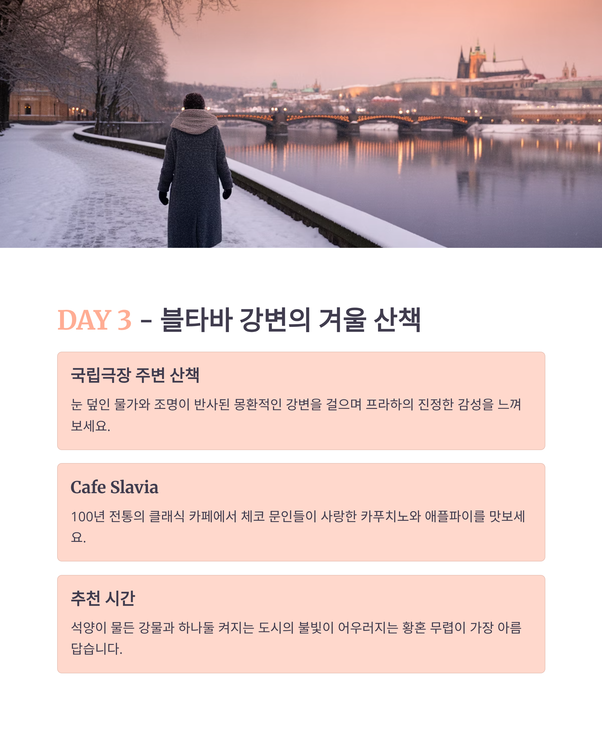 Day 1 프라하성 성벽 뷰, 스테인드글라스 고성 투어, 역사 감상 Kuchyň Café Nový Svět 까를교 강 반사, 석양 버스킹 감상, 포토타임 Mlejnice Café Mánesova Day 2 구시가지 광장 천문시계, 크리스마스 마켓 수공예 쇼핑, 마켓 투어 U Prince Rooftop Café Mozart 스트라호프 수도원 전망대 빨간 지붕 위 눈 쌓인 프라하 전경 도서관, 맥주 시음 Restaurant Peklo Monastery Café Day 3 존레논 벽 컬러 벽화와 눈의 조화 낙서 남기기, 셀카 Café de Paris Artic Bakehouse 블타바 강변 강 반사와 극장 조명 겨울 산책, 클래식 카페 Cafe Slavia La Bohème Café