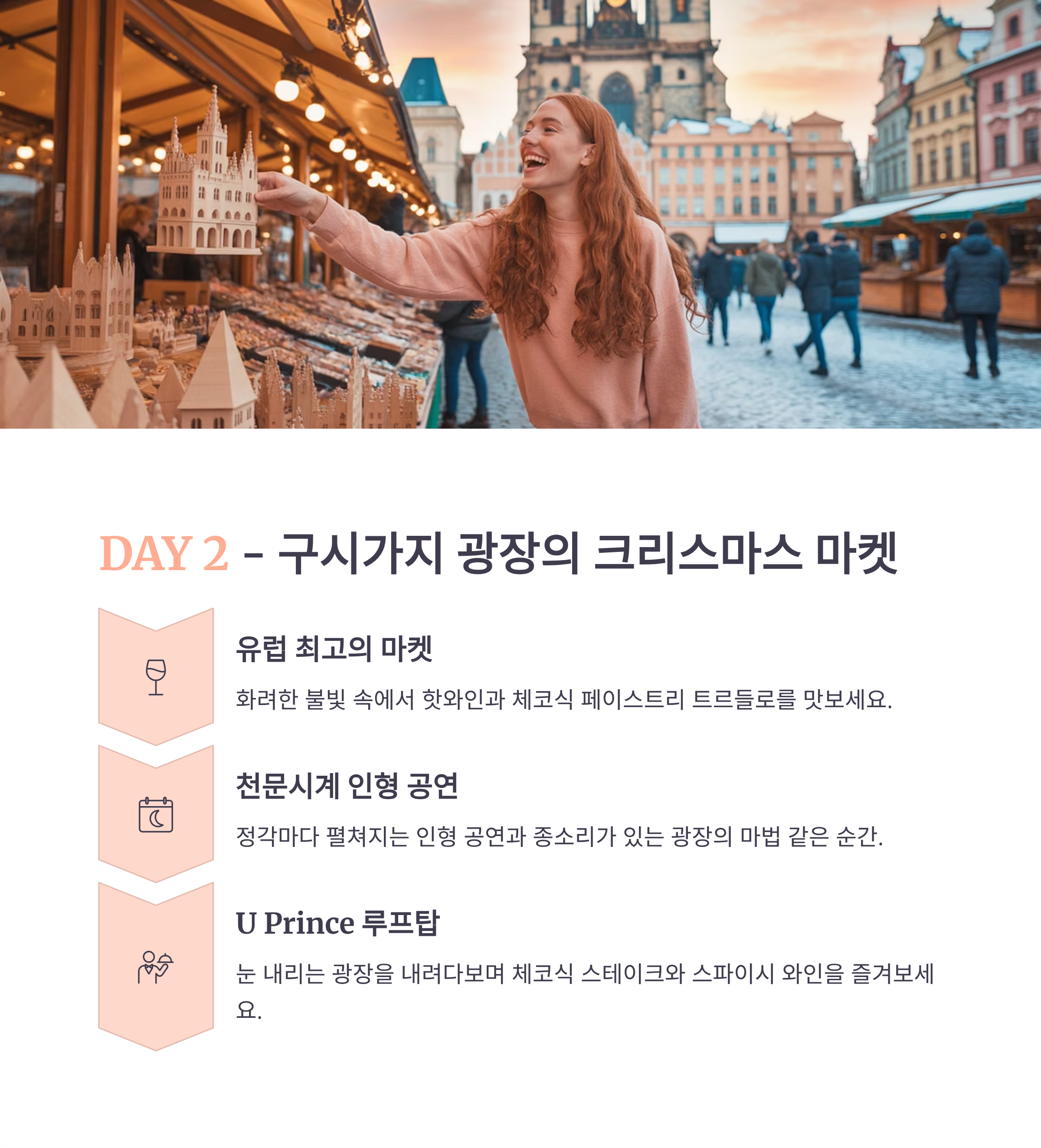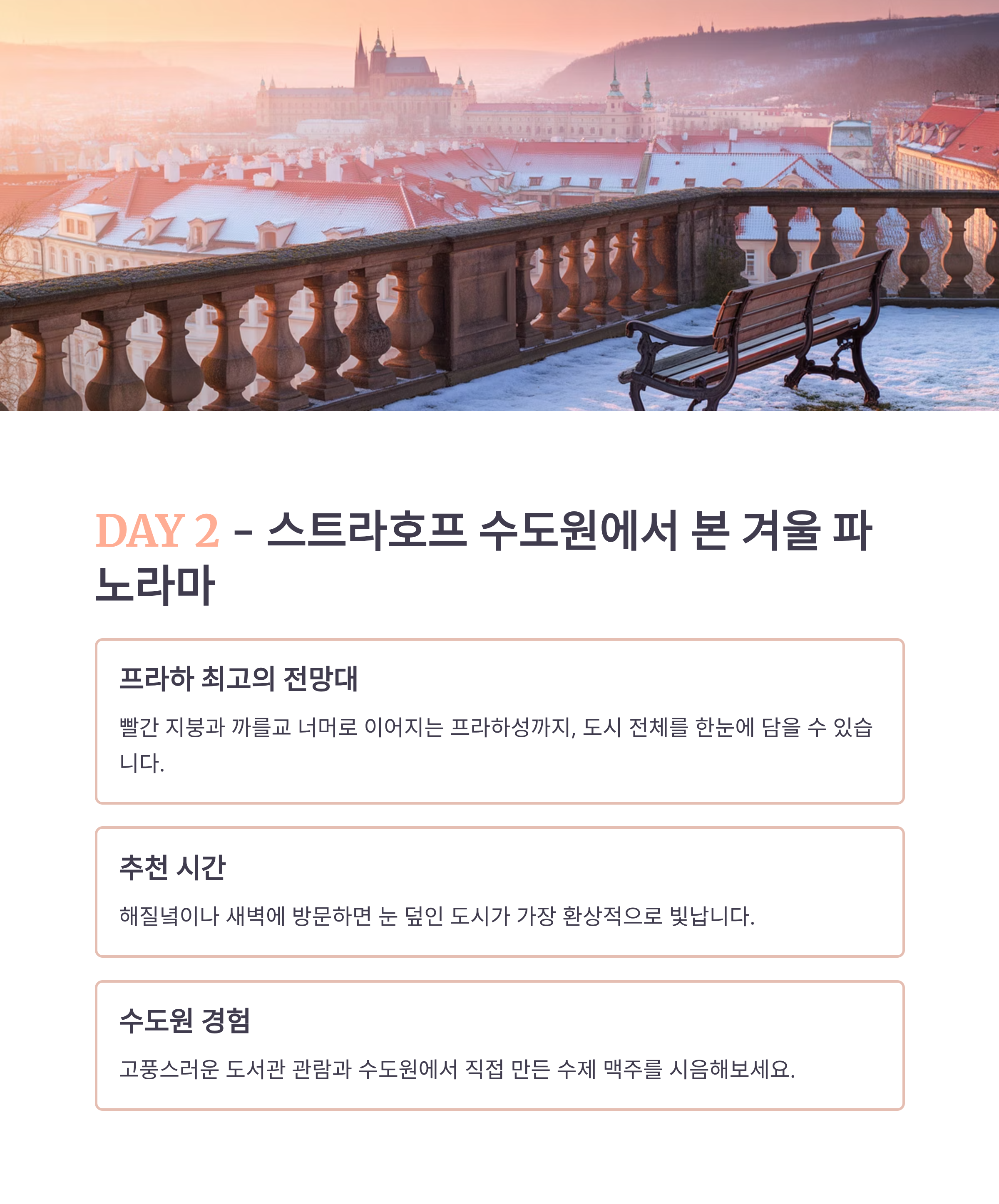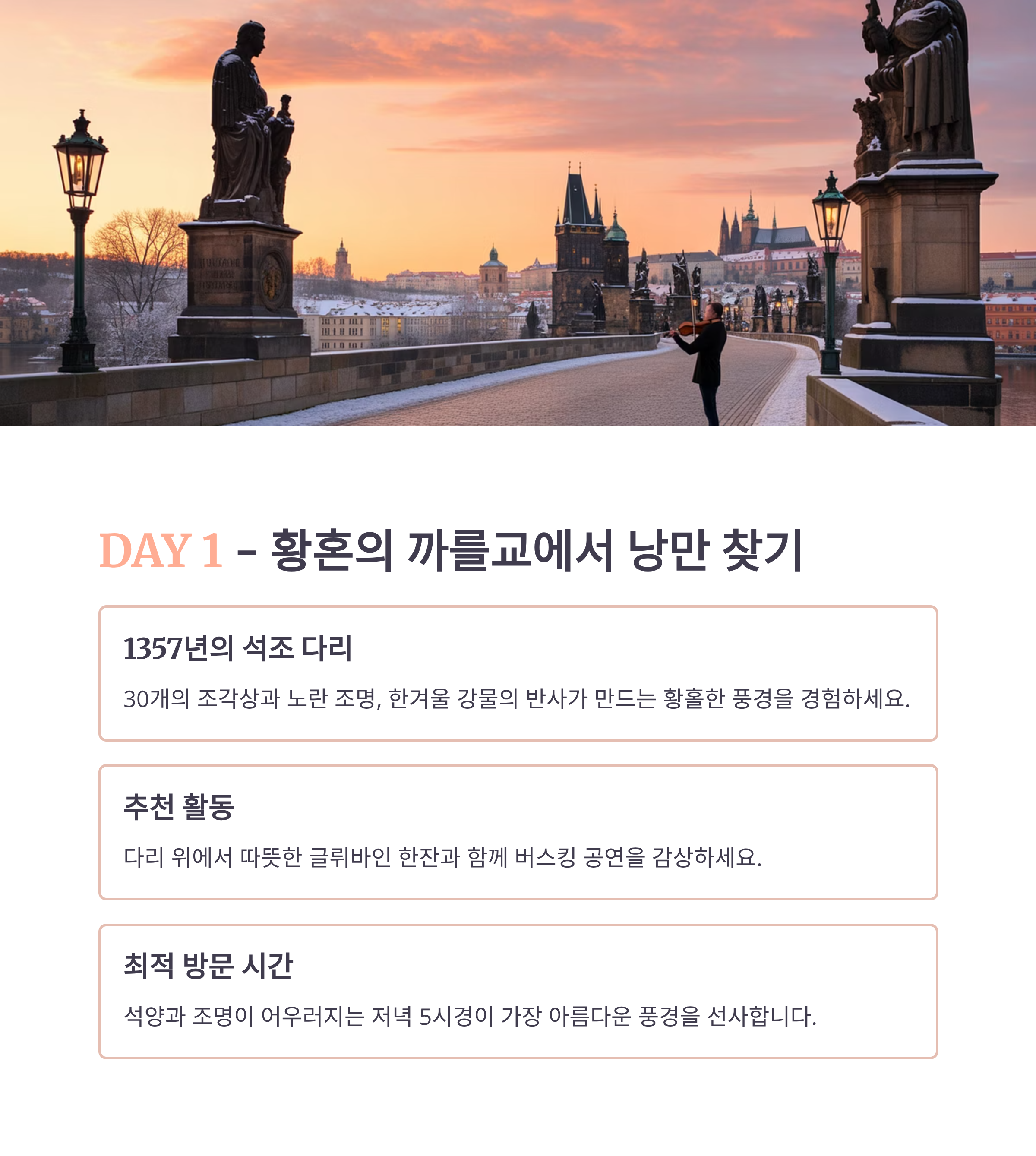Day 1 프라하성 성벽 뷰, 스테인드글라스 고성 투어, 역사 감상 Kuchyň Café Nový Svět 까를교 강 반사, 석양 버스킹 감상, 포토타임 Mlejnice Café Mánesova Day 2 구시가지 광장 천문시계, 크리스마스 마켓 수공예 쇼핑, 마켓 투어 U Prince Rooftop Café Mozart 스트라호프 수도원 전망대 빨간 지붕 위 눈 쌓인 프라하 전경 도서관, 맥주 시음 Restaurant Peklo Monastery Café Day 3 존레논 벽 컬러 벽화와 눈의 조화 낙서 남기기, 셀카 Café de Paris Artic Bakehouse 블타바 강변 강 반사와 극장 조명 겨울 산책, 클래식 카페 Cafe Slavia La Bohème Café