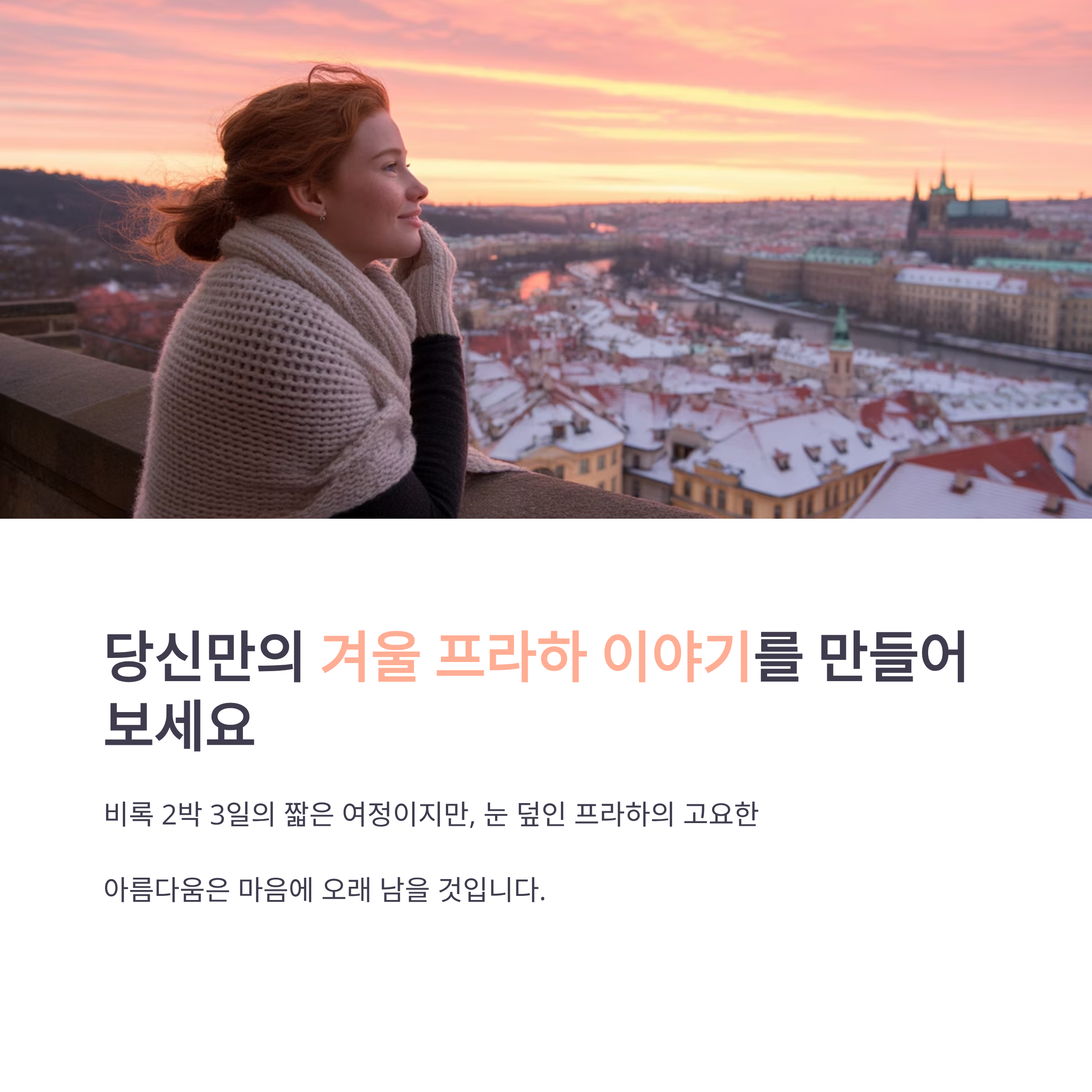 혼자 떠나도, 연인과 함께여도, 친구들과 함께여도 그 순간이 특별하게 느껴집니다.한파 속을 걷는 프라하는 오히려 그 고요함 덕분에 더욱 마음에 오래 남아요.