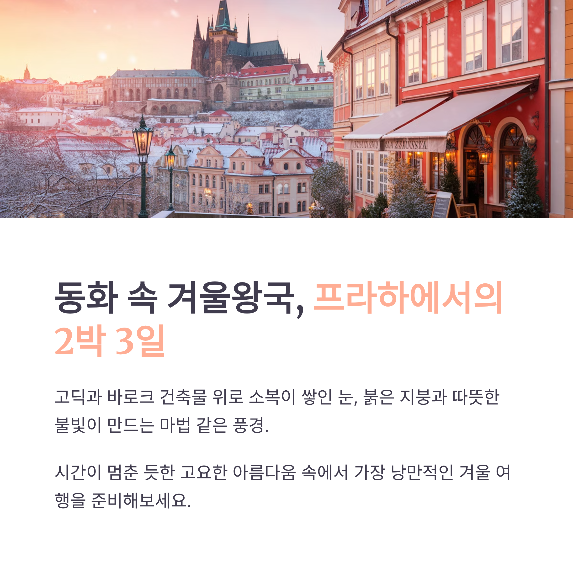 겨울의 프라하는 마치 시간이 멈춘 듯한 고요한 아름다움을 자랑합니다. 고딕과 바로크 양식의 건축물 위로 눈이 소복이 쌓이고, 붉은 지붕과 노란 불빛들이 따뜻한 분위기를 더해줍니다. 이 글에서는 2025-2026년 겨울 시즌 기준으로, 프라하에서 2박 3일 동안 감성적으로 여행할 수 있는 루트와 함께, 추천 장소의 주소·특징·즐길거리·포토스팟·체험 후기·맛집 정보와 주변 카페까지 한눈에 정리해드립니다.