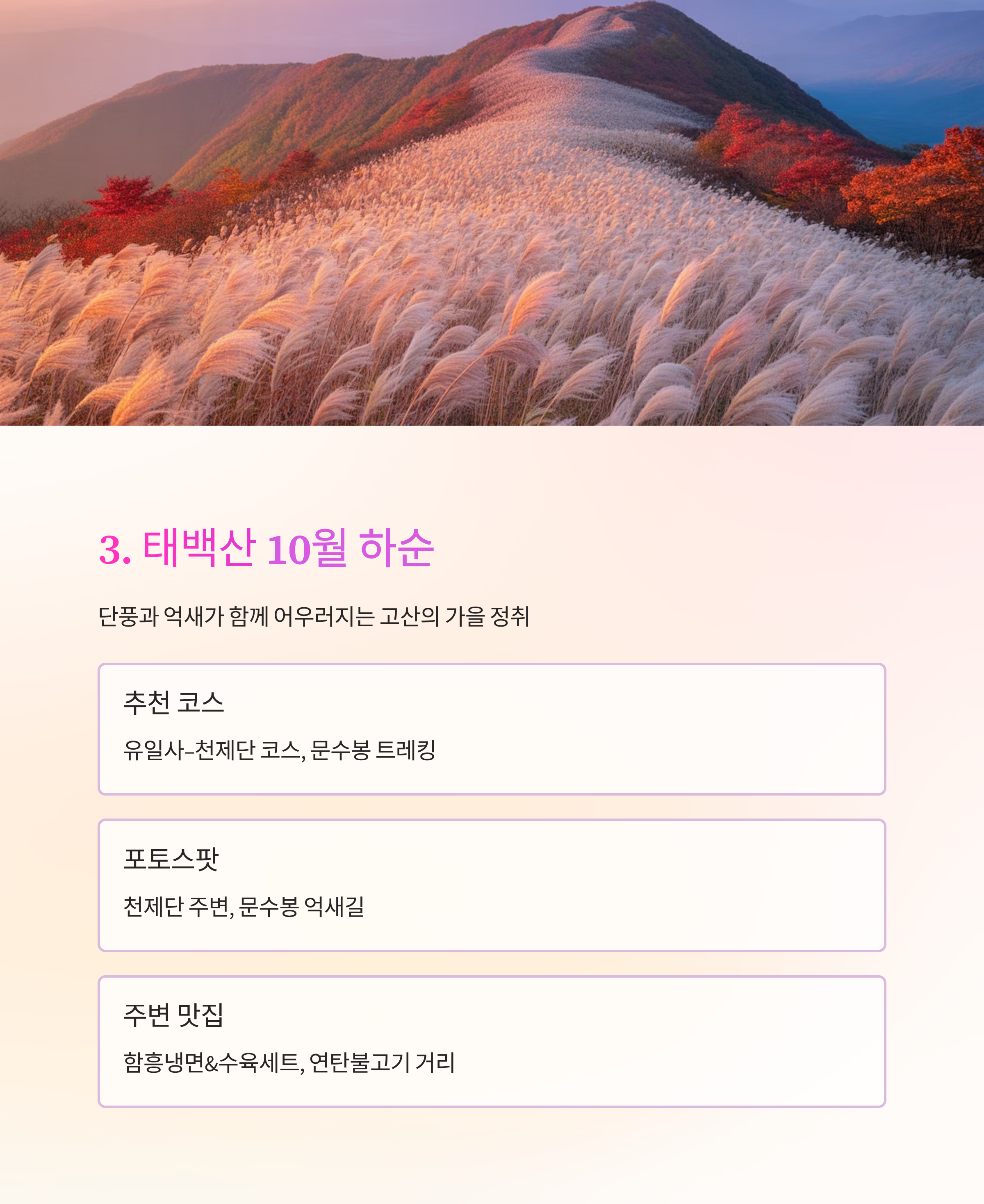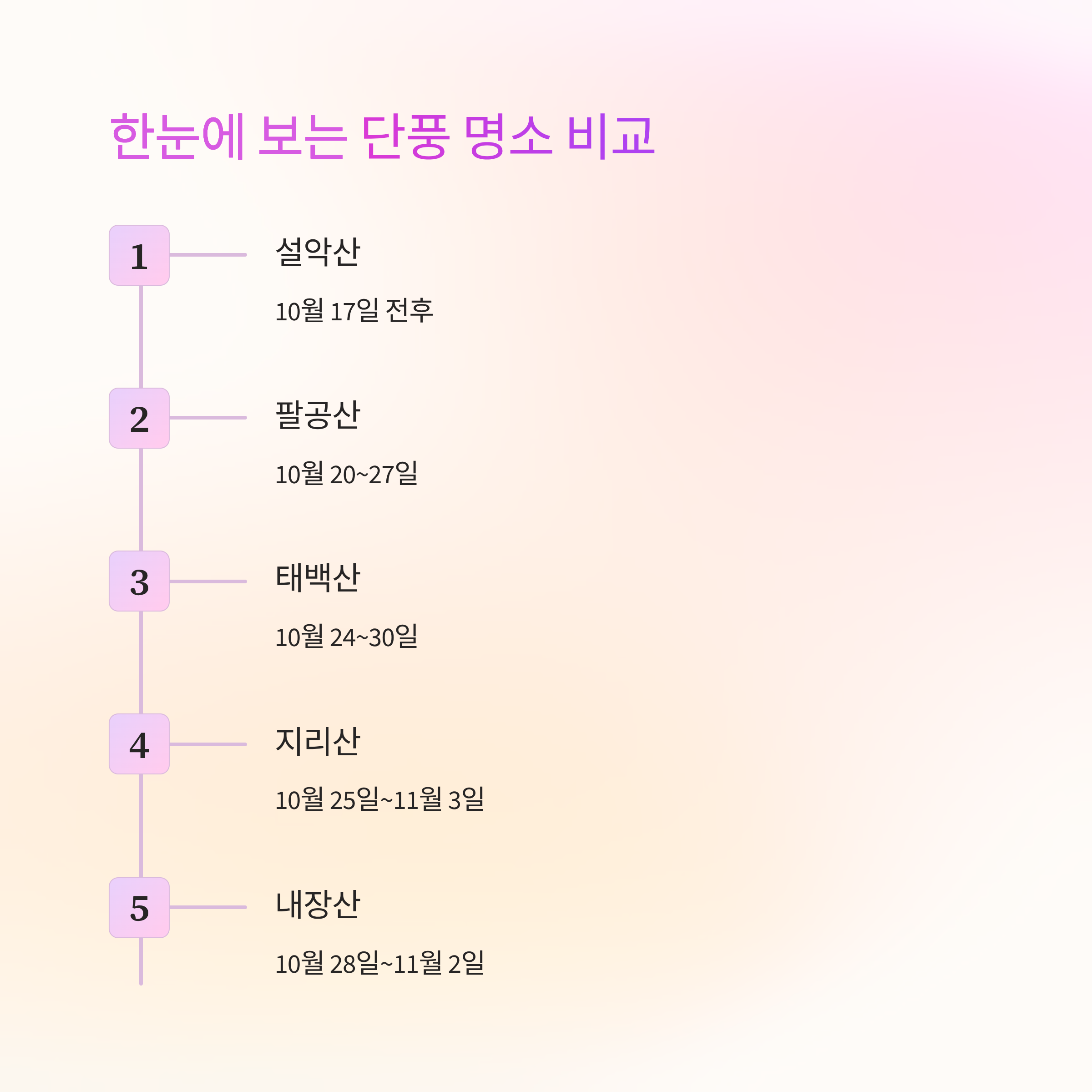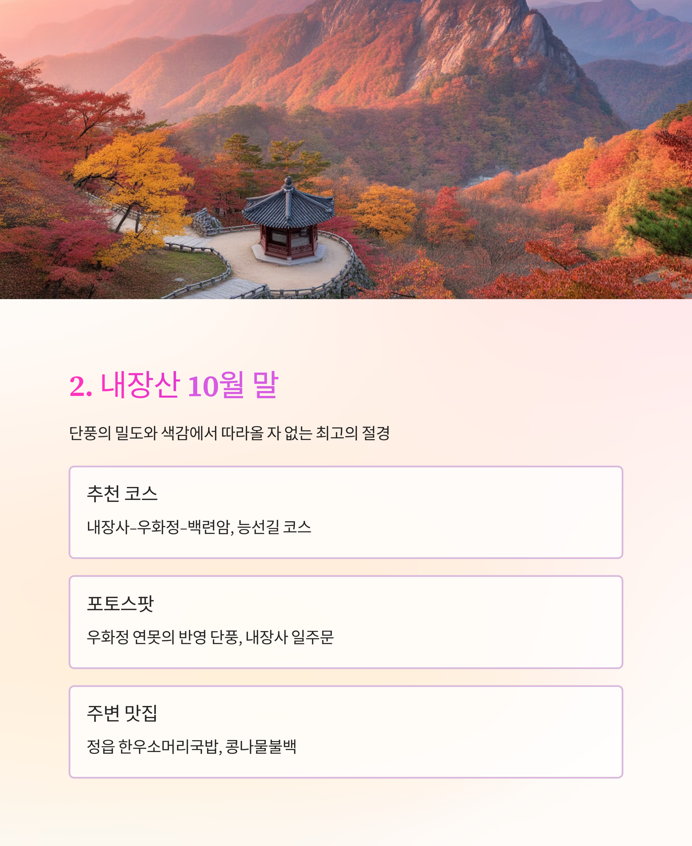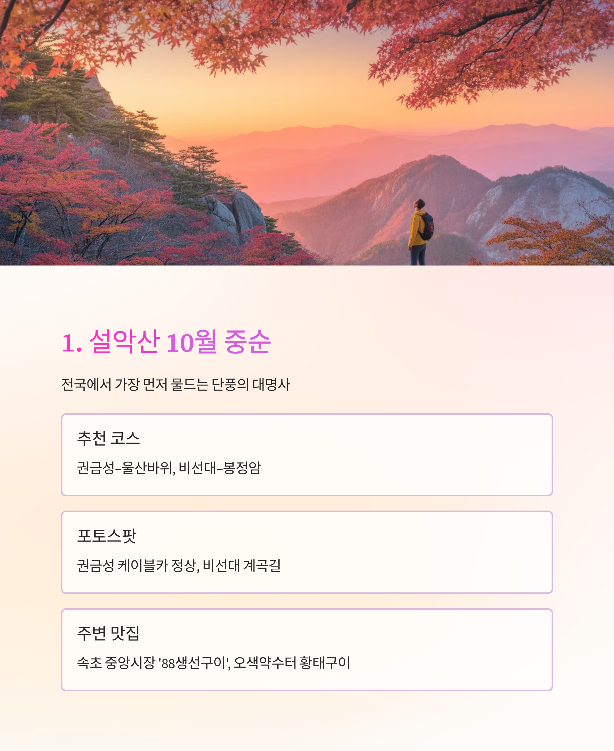 강원 속초 설악산 10월 17일 전후 빠른 단풍, 암석과 조화 권금성, 비선대, 흔들바위 전북 정읍 내장산 10월 28일~11월 초 단풍 밀도 최고 우화정, 내장사 일주문 강원 태백 태백산 10월 24일~30일 억새+단풍 조합 천제단, 문수봉 능선 경남 하동 지리산 10월 25일~11월 3일 운해+단풍+일출 삼박자 피아골, 노고단, 반야봉 대구 팔공산 10월 20일~27일 도심 접근성+단풍+사찰 동화사, 갓바위 계단길