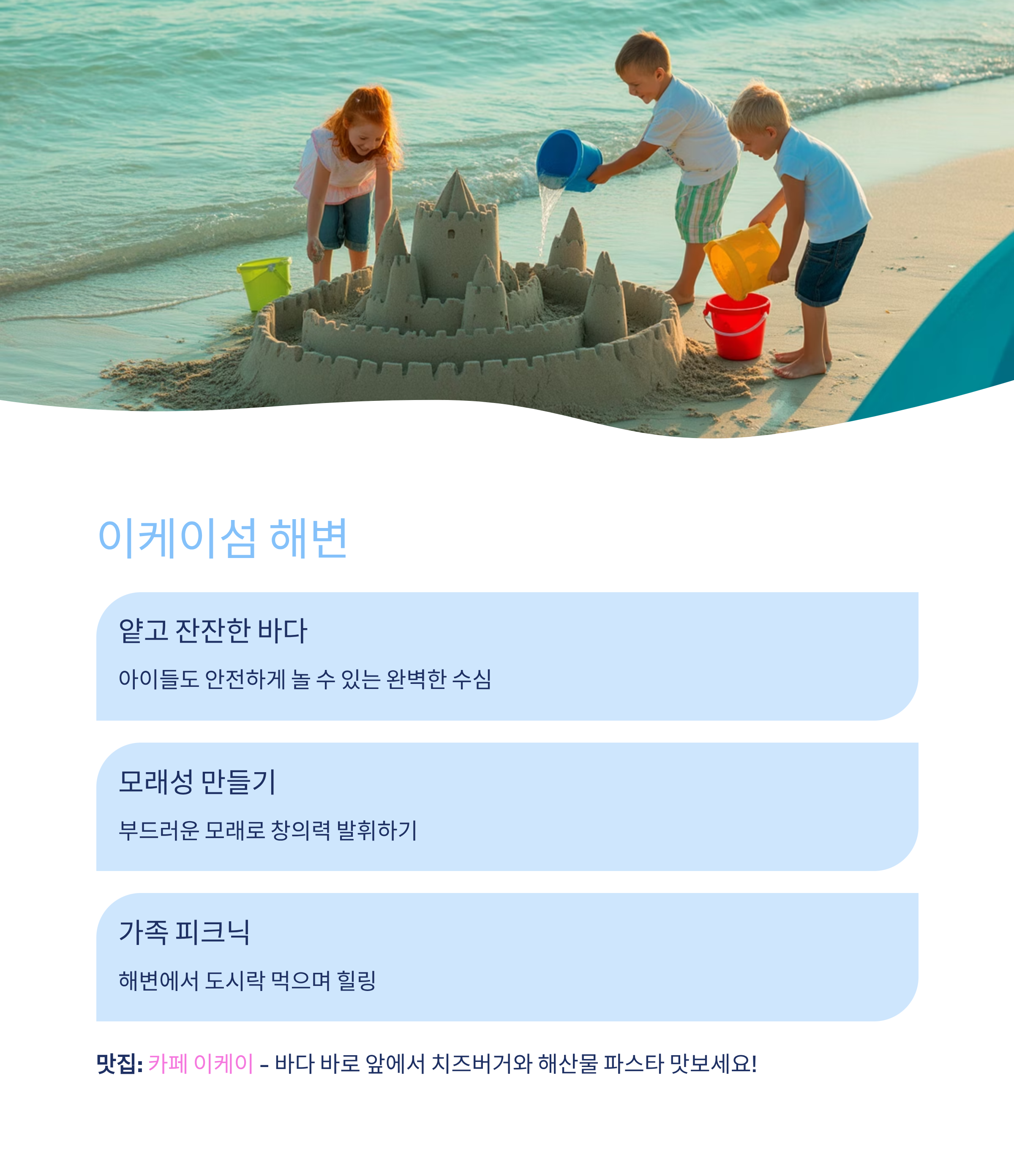 물놀이, 모래성 만들기, 피크닉, 산책아이들이 좋아하는 포인트