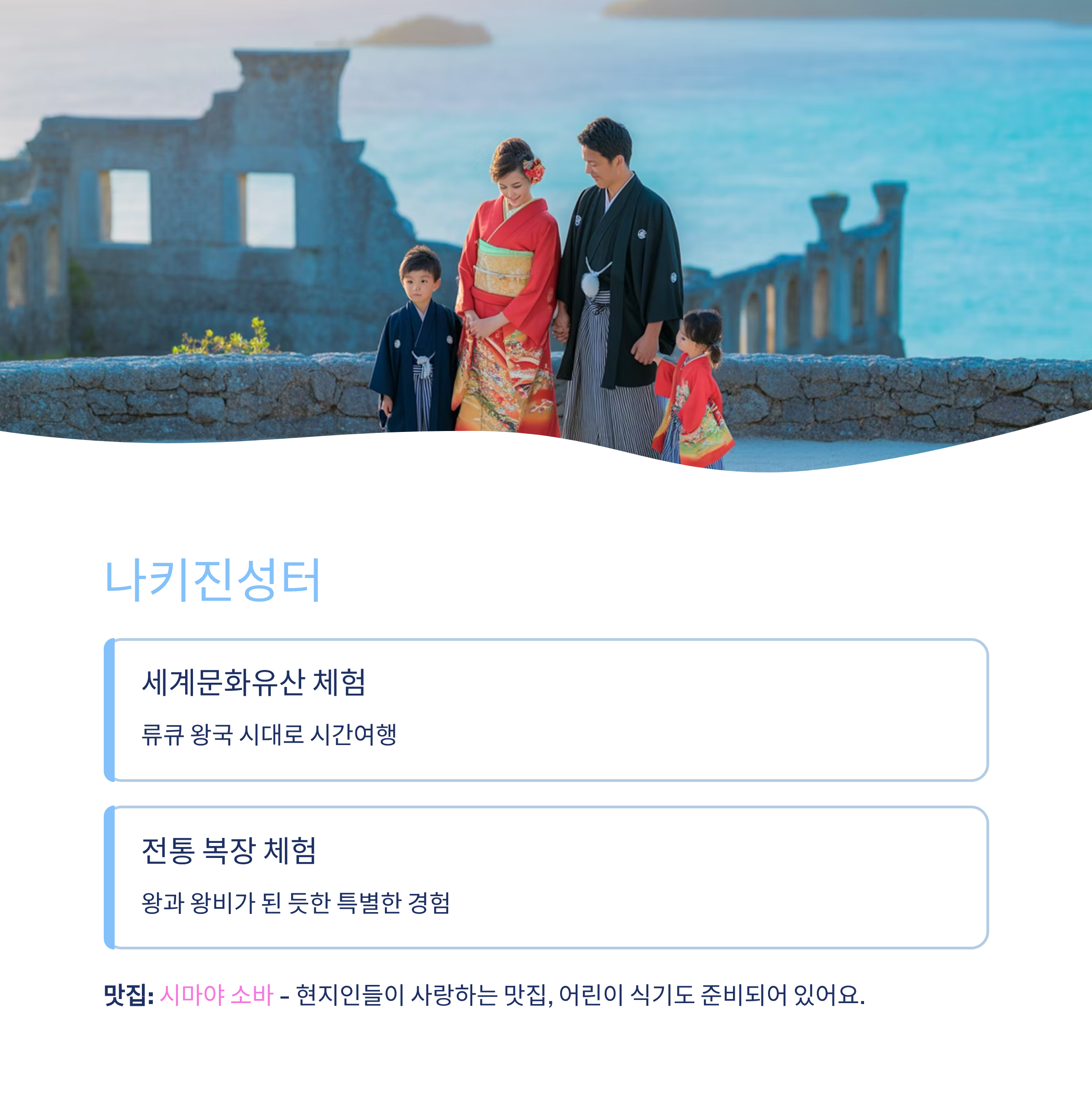 성곽 산책, 류큐 복장 체험, 유적 탐방, 해질녘 포토 타임아이들이 좋아하는 포인트