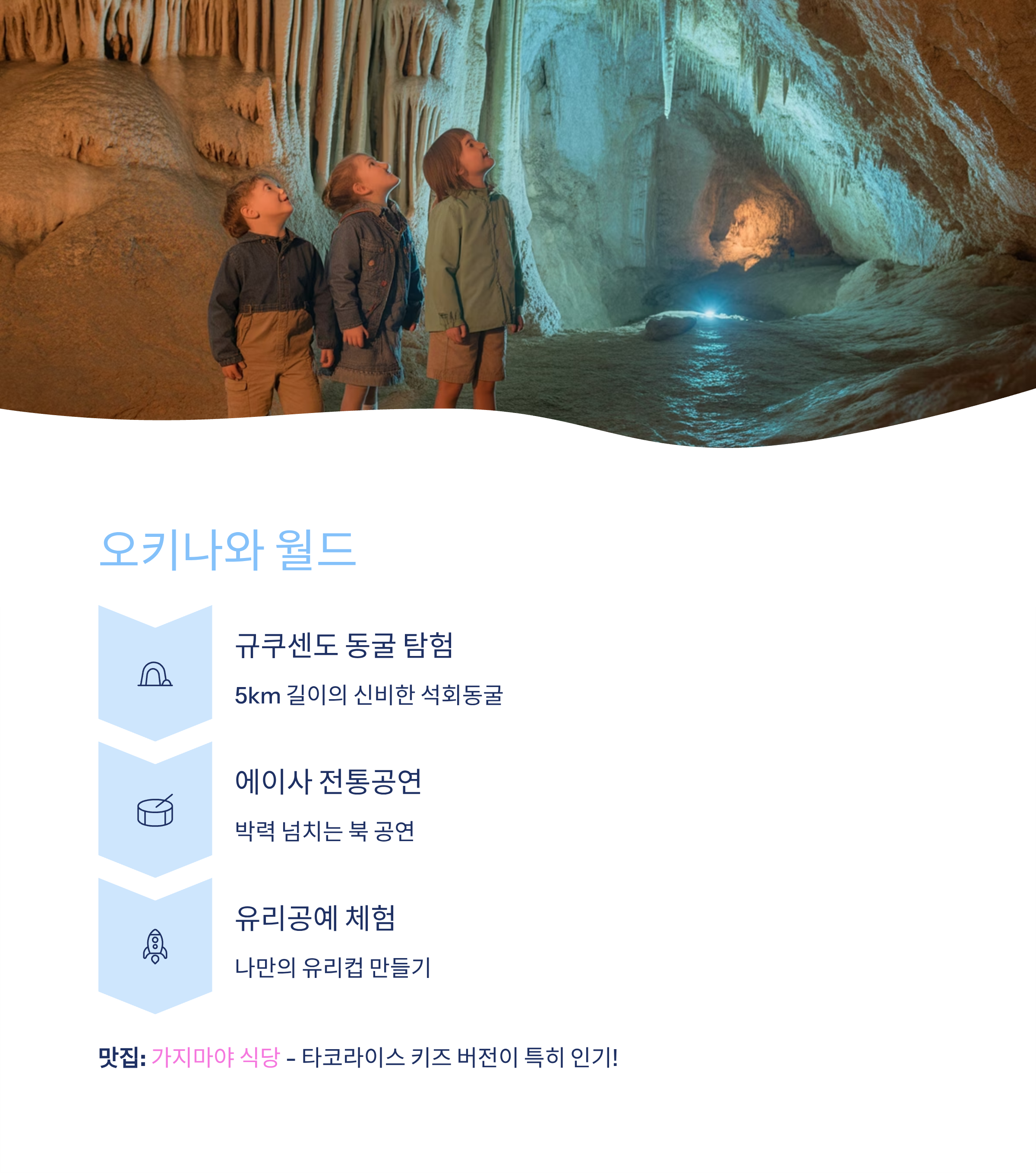 규쿠센도 동굴탐험, 에이사 전통공연, 유리공예 체험, 전통복식 체험아이들이 좋아하는 포인트