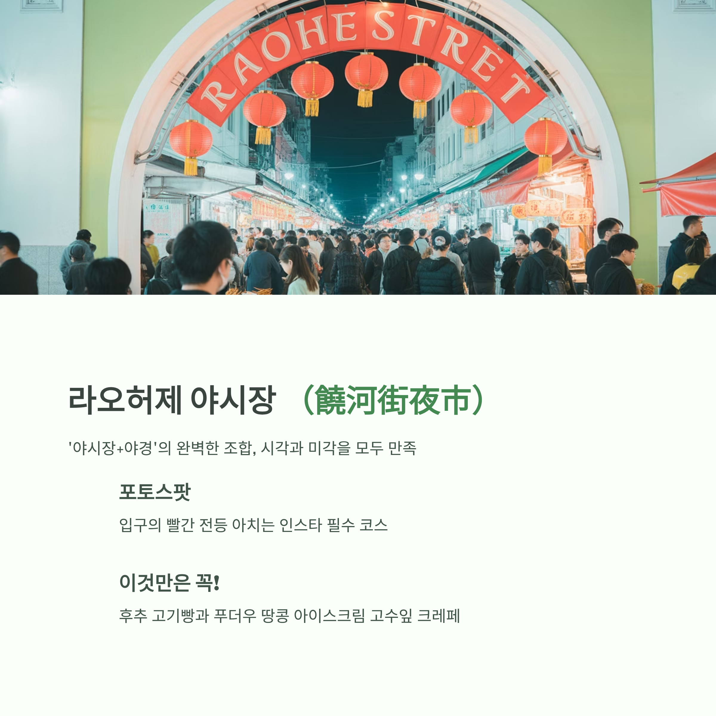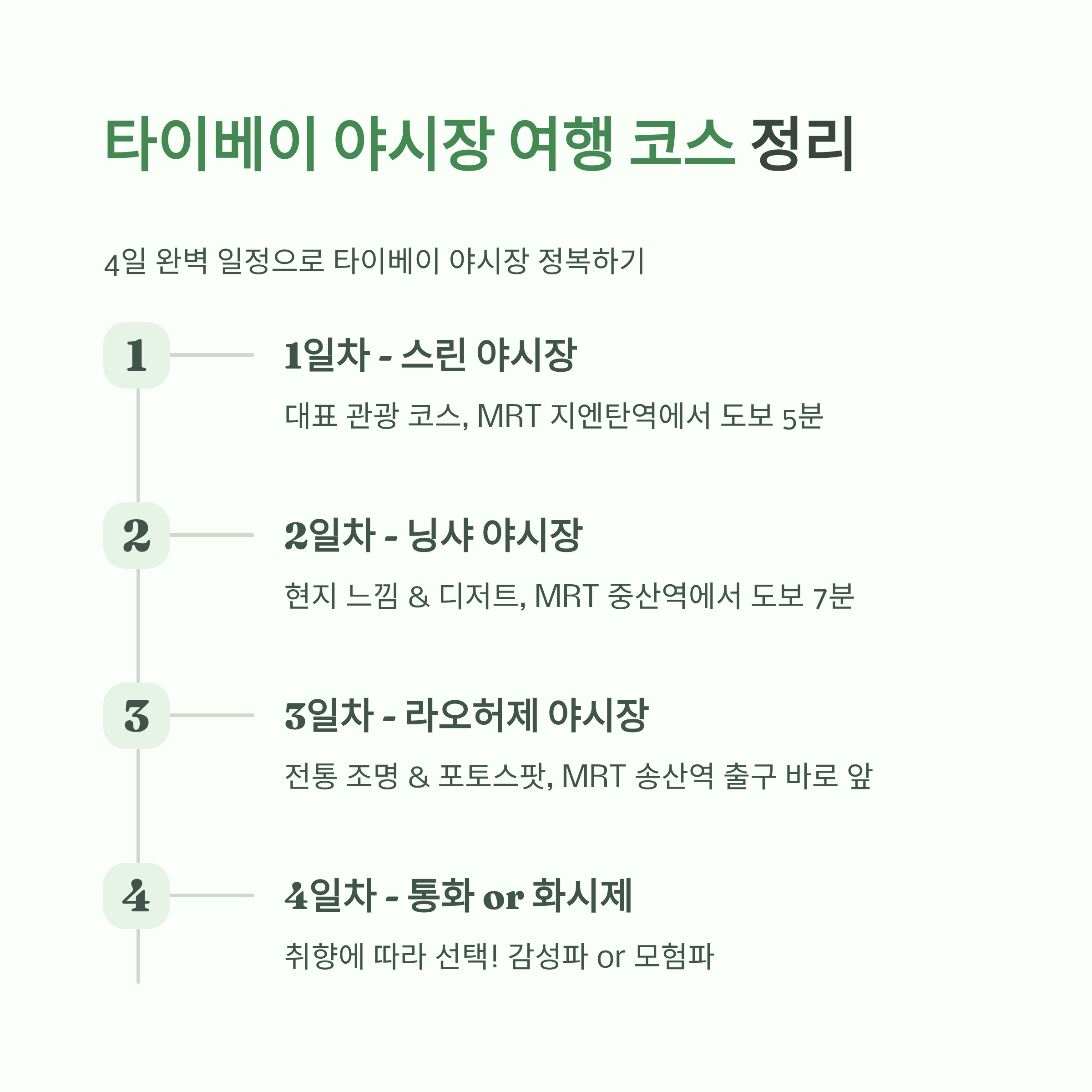 1일차 스린 야시장 먹방 입문 & 대표 관광 MRT 지엔탄역 도보 5분 2일차 닝샤 야시장 현지 느낌 & 디저트 MRT 중산역 도보 7분 3일차 라오허제 야시장 전통 조명 & 포토스팟 MRT 송산역 출구 바로 앞 4일차 통화 or 화시제 감성 or 로컬 체험 통화: MRT 신이안허역 / 화시: MRT 룽산쓰역