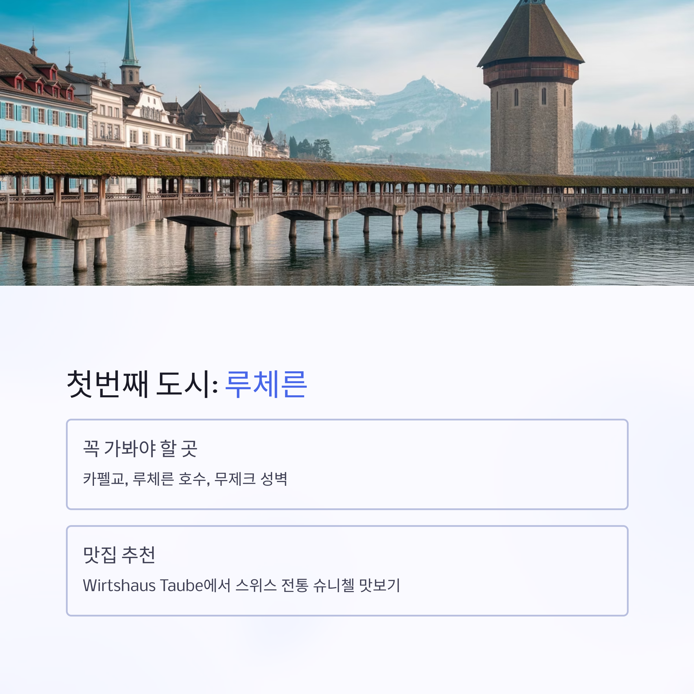“루체른 기차역에서 내리자마자 보이는 탁 트인 호수와 산맥… 이건 현실이 아니에요. 사진보다 실제가 훨씬 더 아름답습니다.”주변 맛집 추천