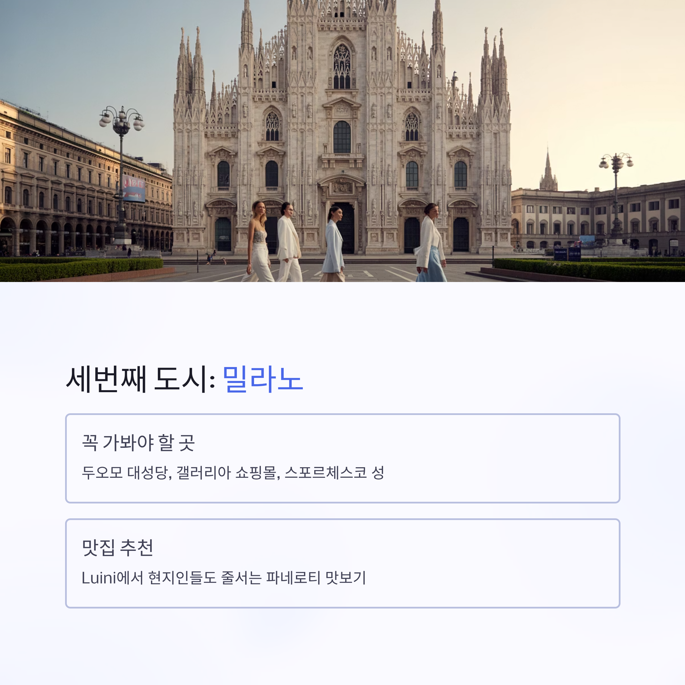 “두오모 앞에서 사진 찍고 바로 쇼핑하러 갔는데, 유럽 감성 최고! 도시 분위기와 기차 여행의 간편함이 너무 좋았어요.”주변 맛집 추천