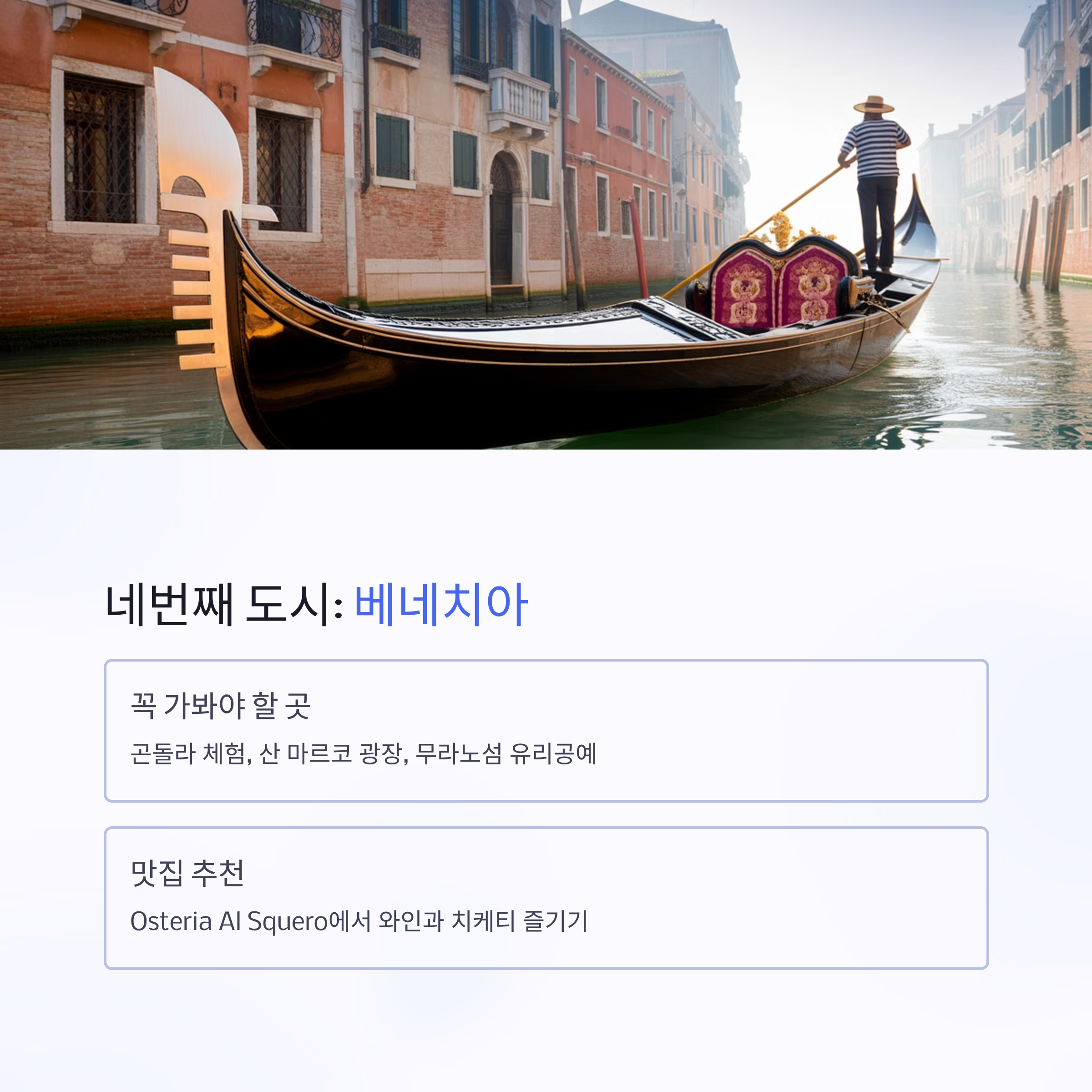 즐길거리: 곤돌라 체험, 무라노섬 유리공예, 산 마르코 광장 산책