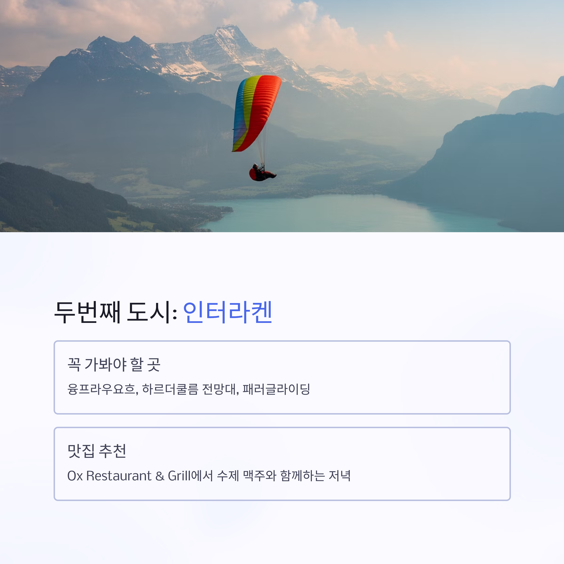 즐길거리: 융프라우요흐 열차 탑승, 하르더쿨름 전망대, 패러글라이딩