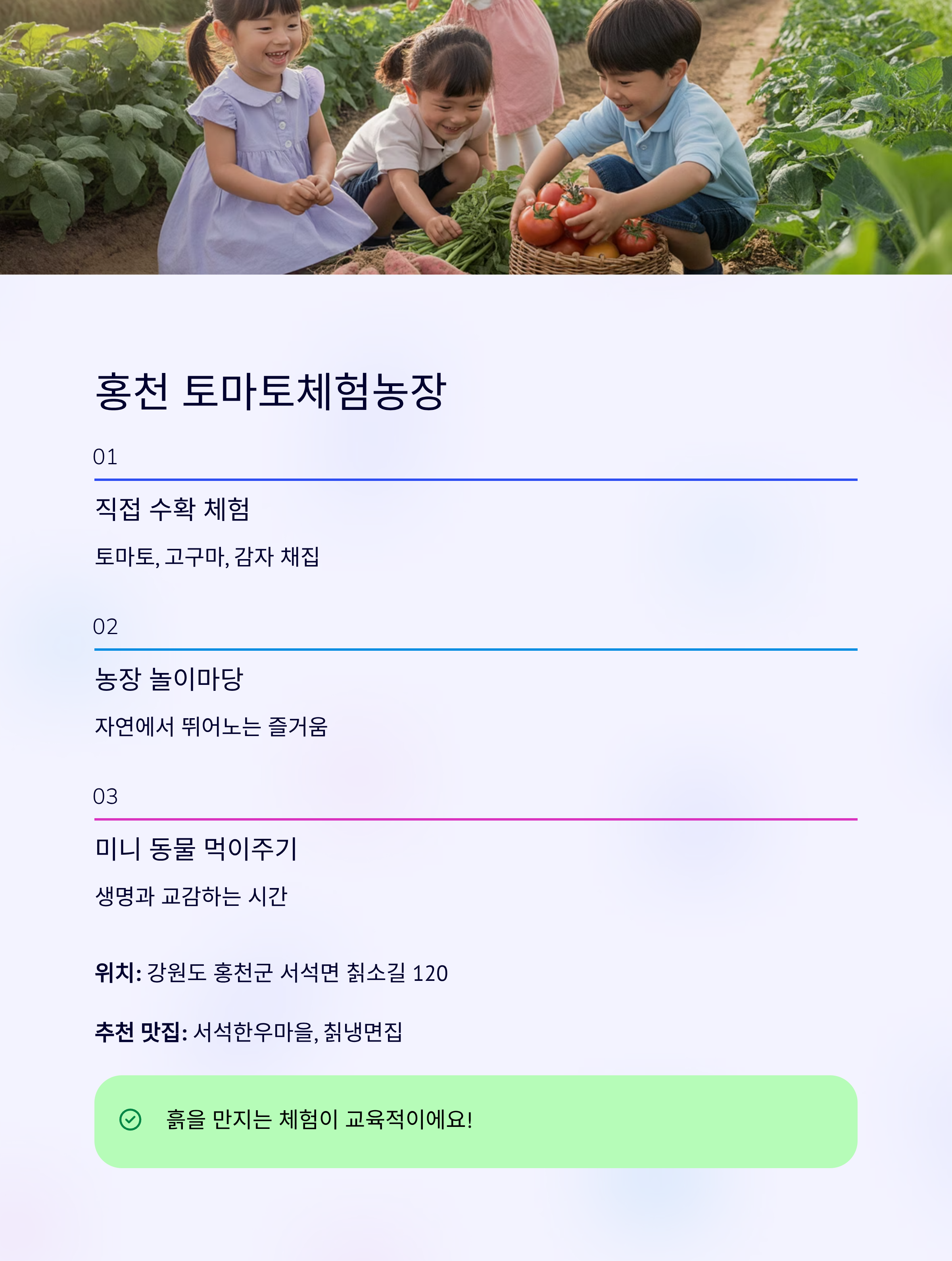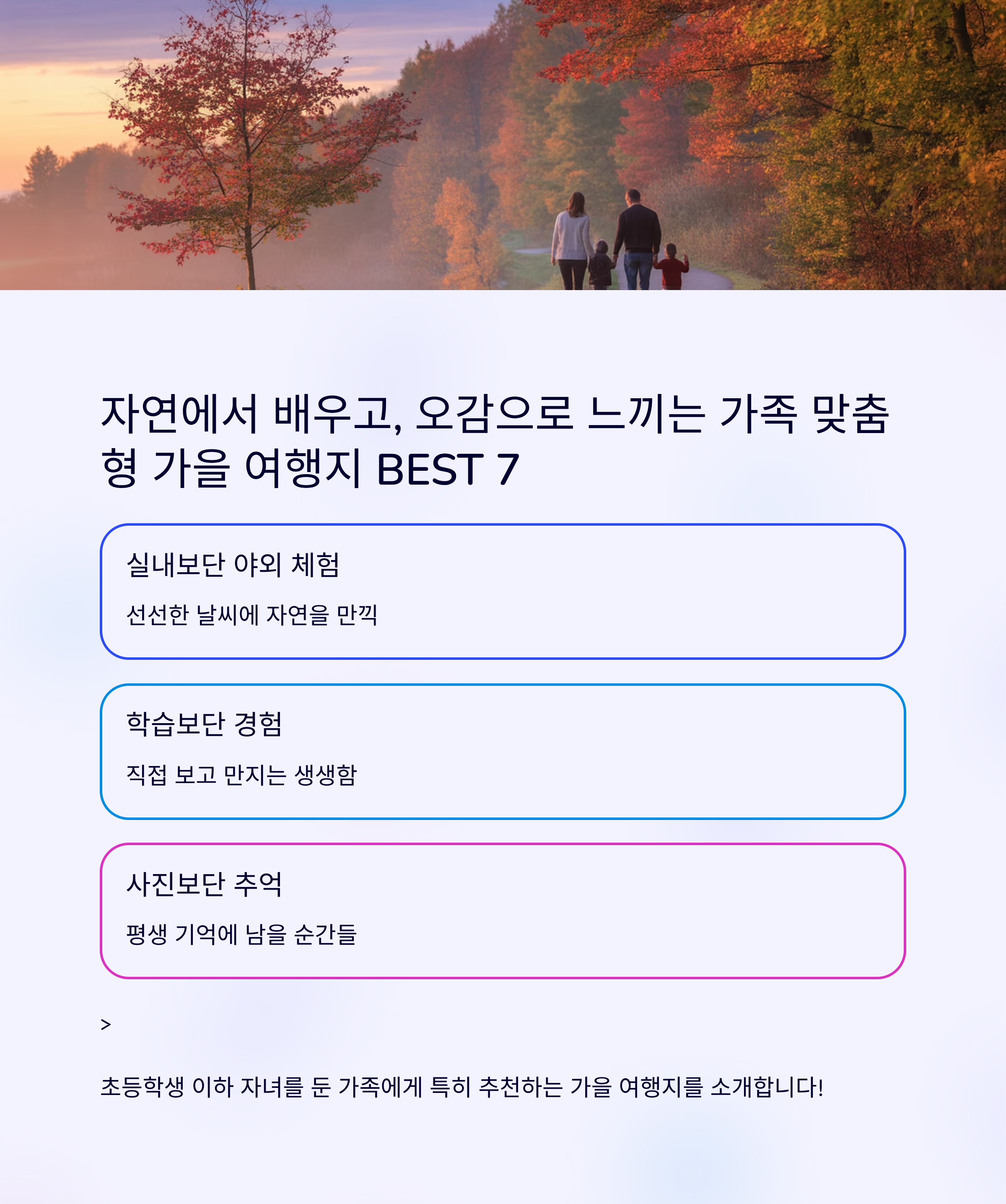 SNS에서는 "아이와 가을 나들이 어디 가지?", "자연 체험 가능한 곳 추천해주세요!"라는 검색이 눈에 띄게 증가하고 있습니다. 이번 글에서는 아이와 함께하는 가을 체험 여행지 7선을 선정해 위치, 즐길거리, 포토존, 실제 후기, 맛집까지 정리했습니다. 초등학생 이하 자녀를 둔 가족에게 특히 추천합니다!