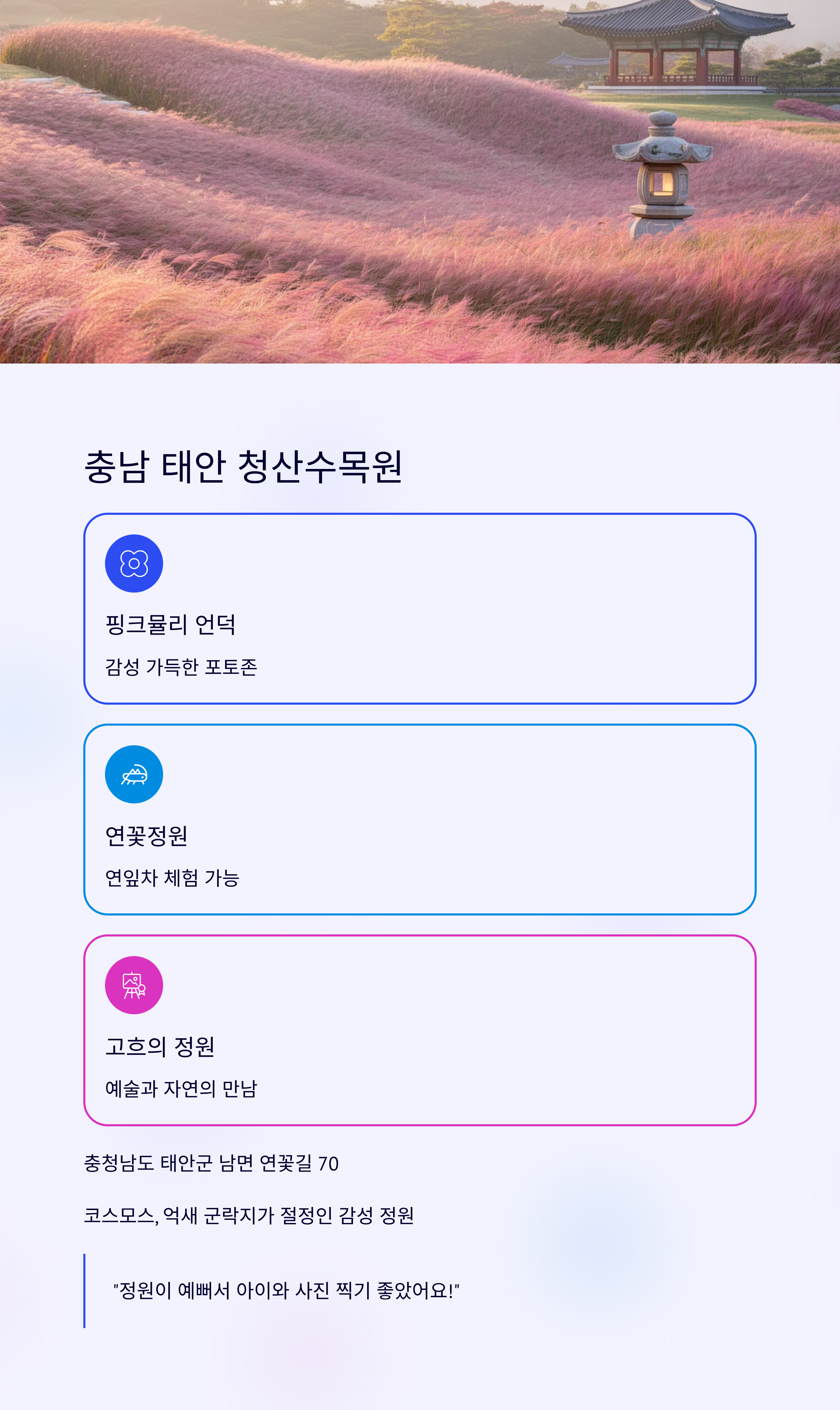 특징: 핑크뮬리, 코스모스, 억새 군락지가 절정인 감성 정원