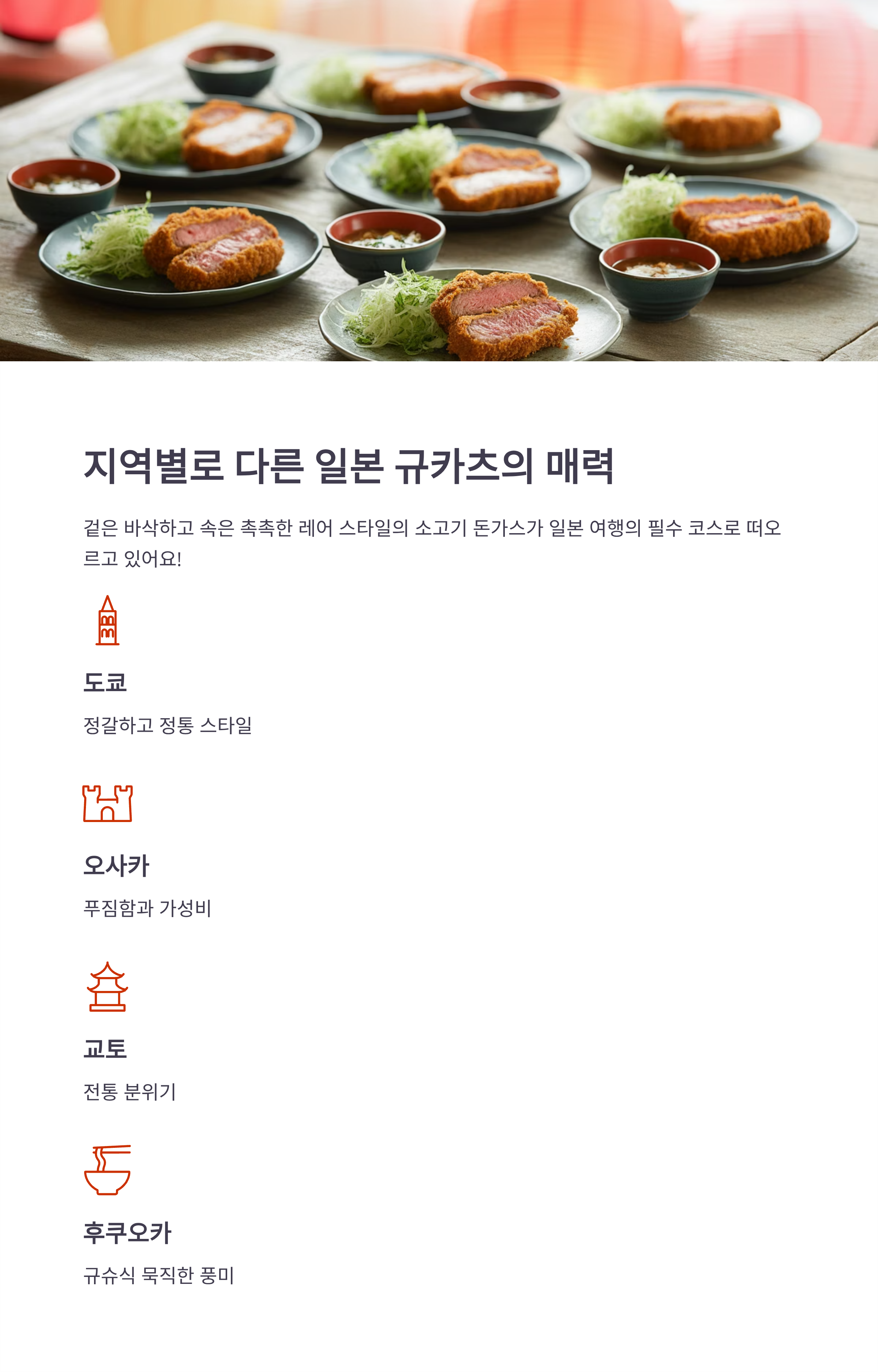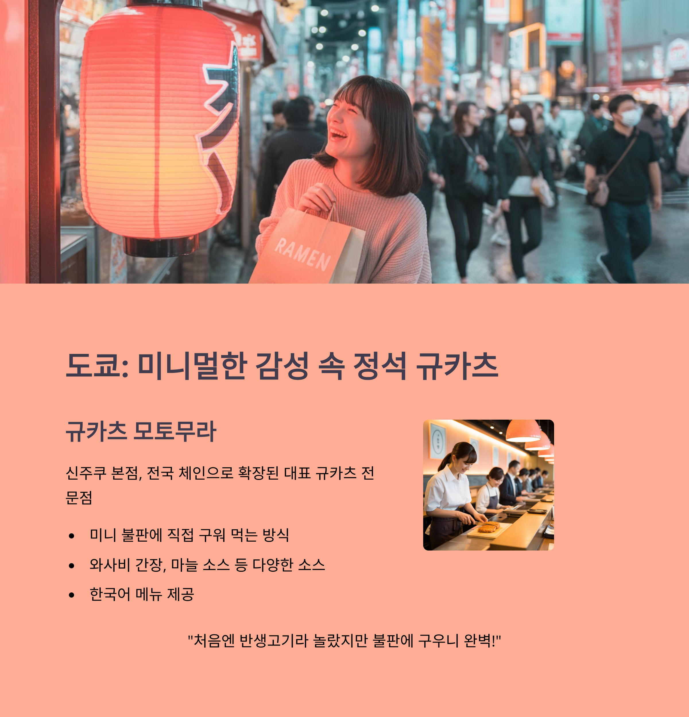 도쿄 규카츠 모토무라 일반 소고기 미니멀, 도시감성 중상 불판에 직접 구워 먹는 재미 오사카 와규카츠 이치니산 와규 활기참, 서민적 중 양 많고 가성비 최고 교토 규카츠 교토 다카야마 일반 소고기 고즈넉, 전통미 중상 정원뷰, 사케 페어링 후쿠오카 규카츠 토쿠로 두툼한 소고기 정통 규슈식 중하 마늘 토핑, 폰즈 조합 삿포로 규카츠 사쿠라야 홋카이도산 와규 겨울 감성 중상 겨울 한정 메뉴, 미소소스 인기