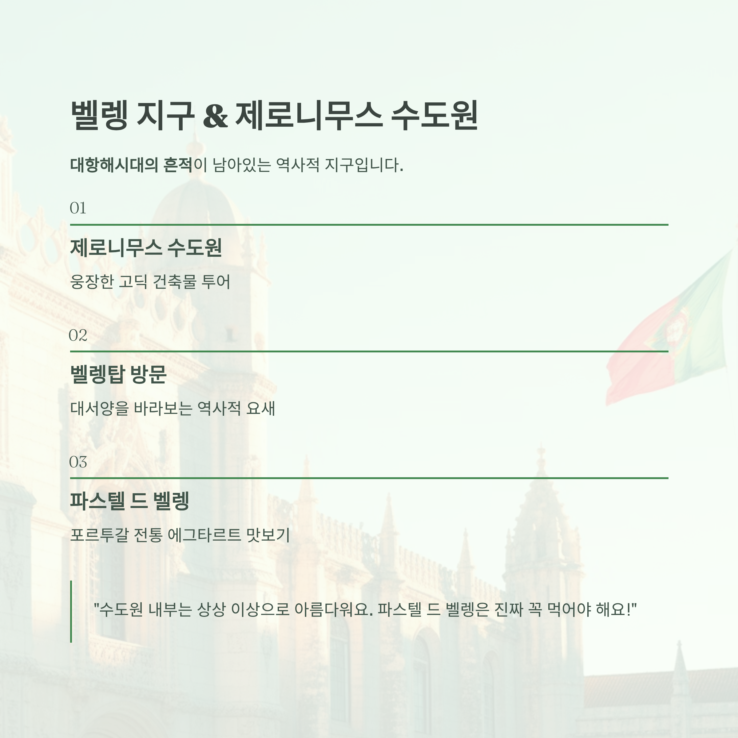 "수도원 내부는 상상 이상으로 아름다워요. 입장료 아깝지 않아요. 그리고 파스텔 드 벨렝은 진짜 꼭 먹어야 해요!"