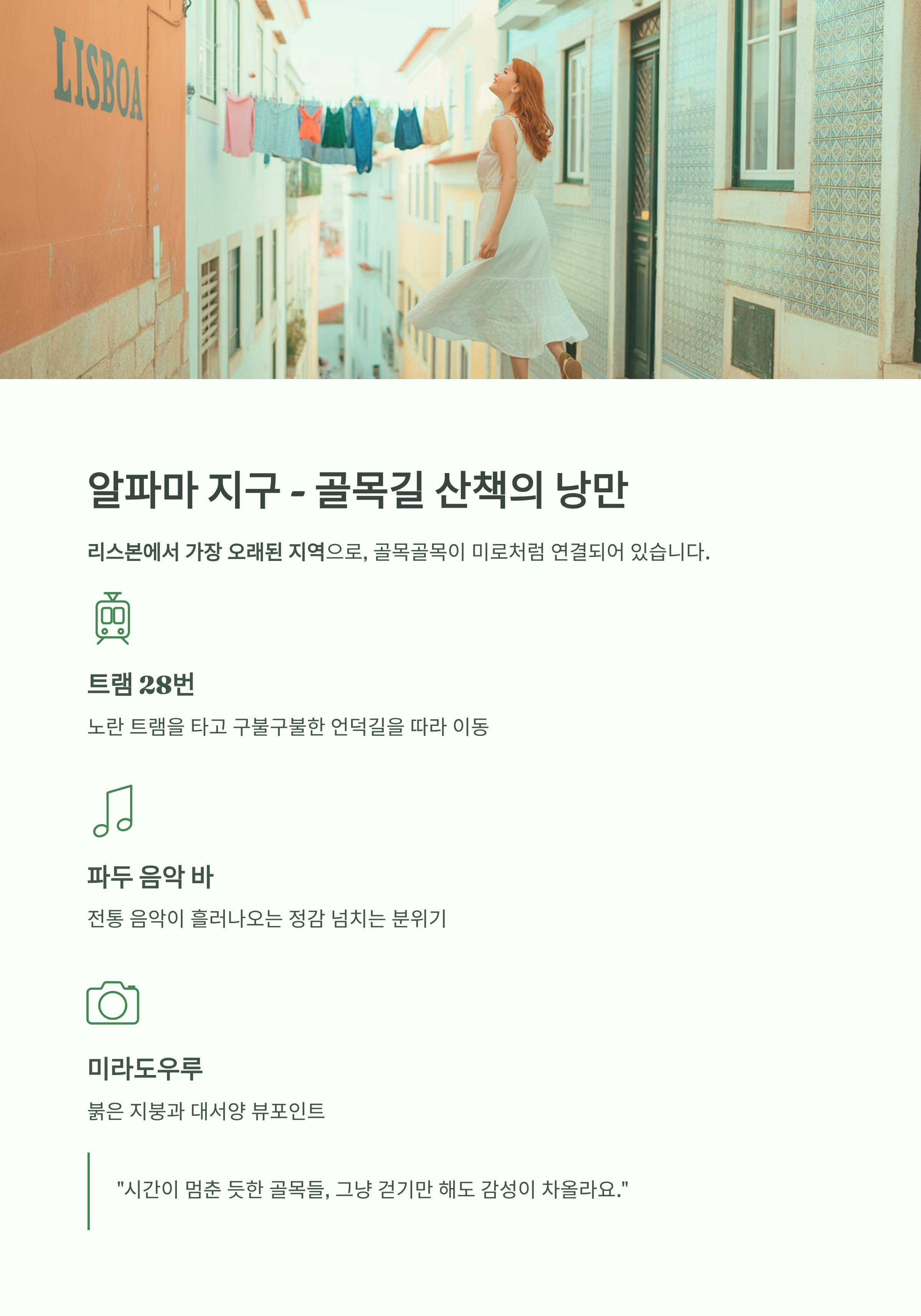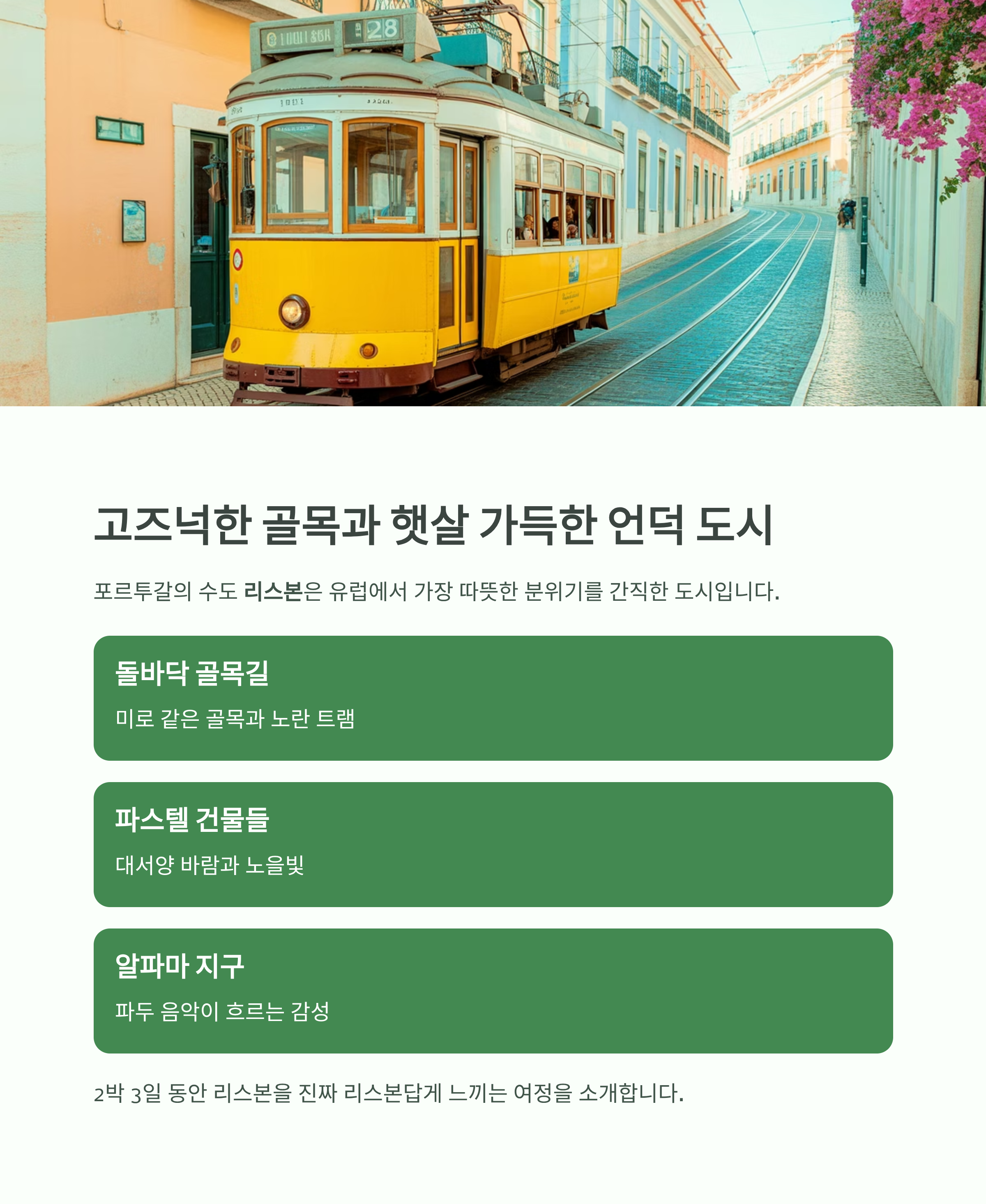 돌바닥 골목, 노란 트램, 파스텔톤 건물, 대서양 바람, 그리고 노을에 물드는 알파마 지구까지.