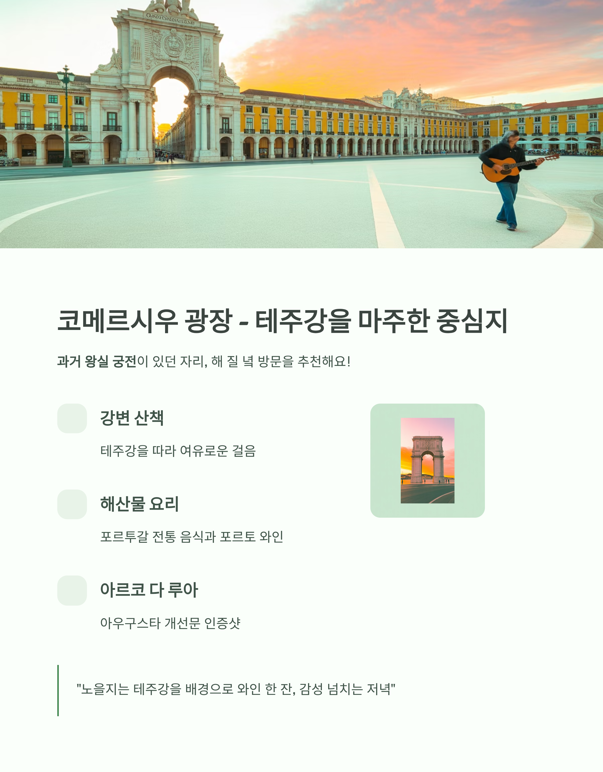 테주강을 마주한 대형 광장으로, 과거 왕실 궁전이 있던 자리예요. 현재는 시민과 관광객이 어우러지는 리스본의 중심지 역할을 합니다. 낮보다 해 질 녘 방문을 추천!즐길거리
