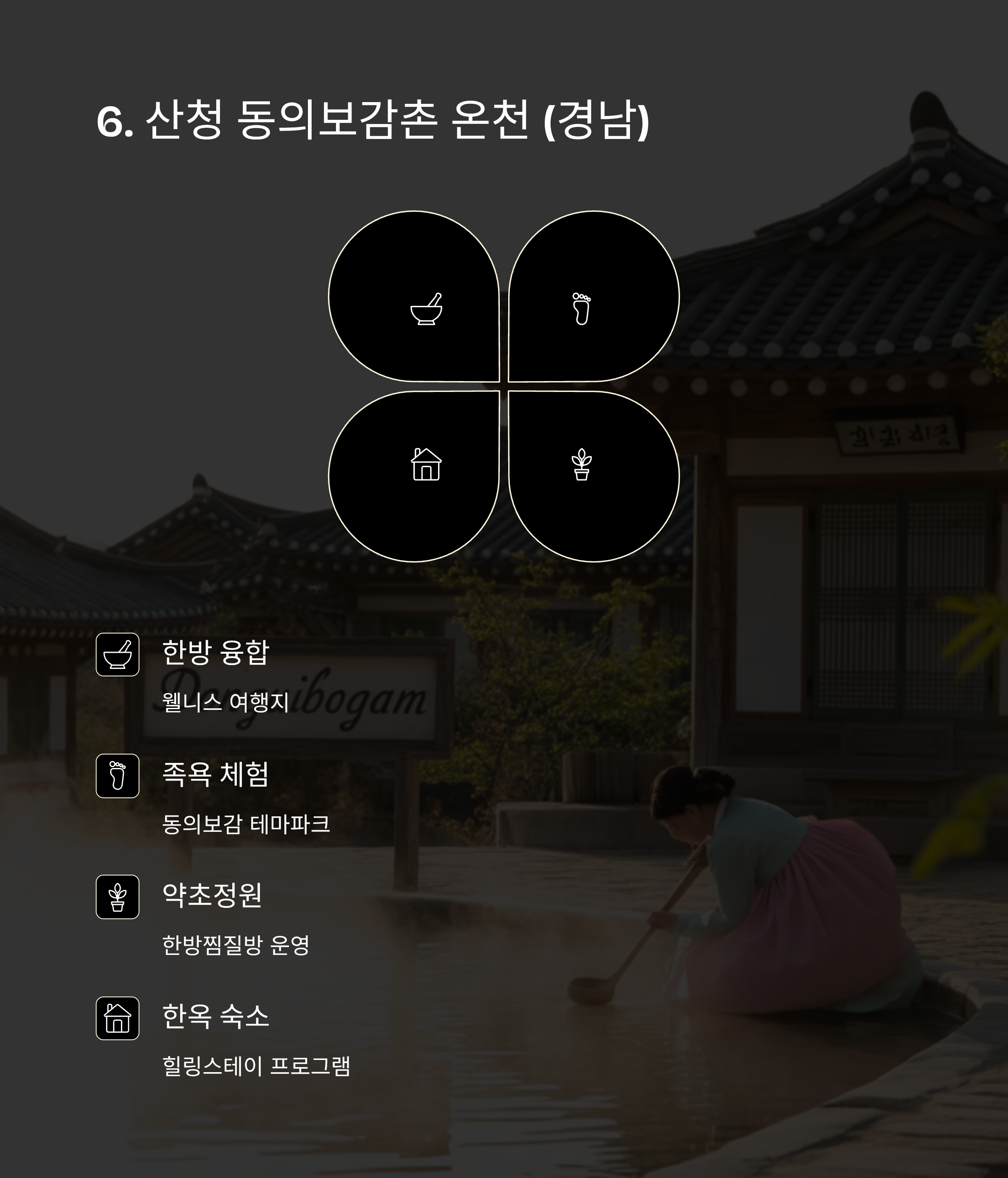 특징: 동의보감 테마파크와 연계된 족욕, 온천 체험 공간