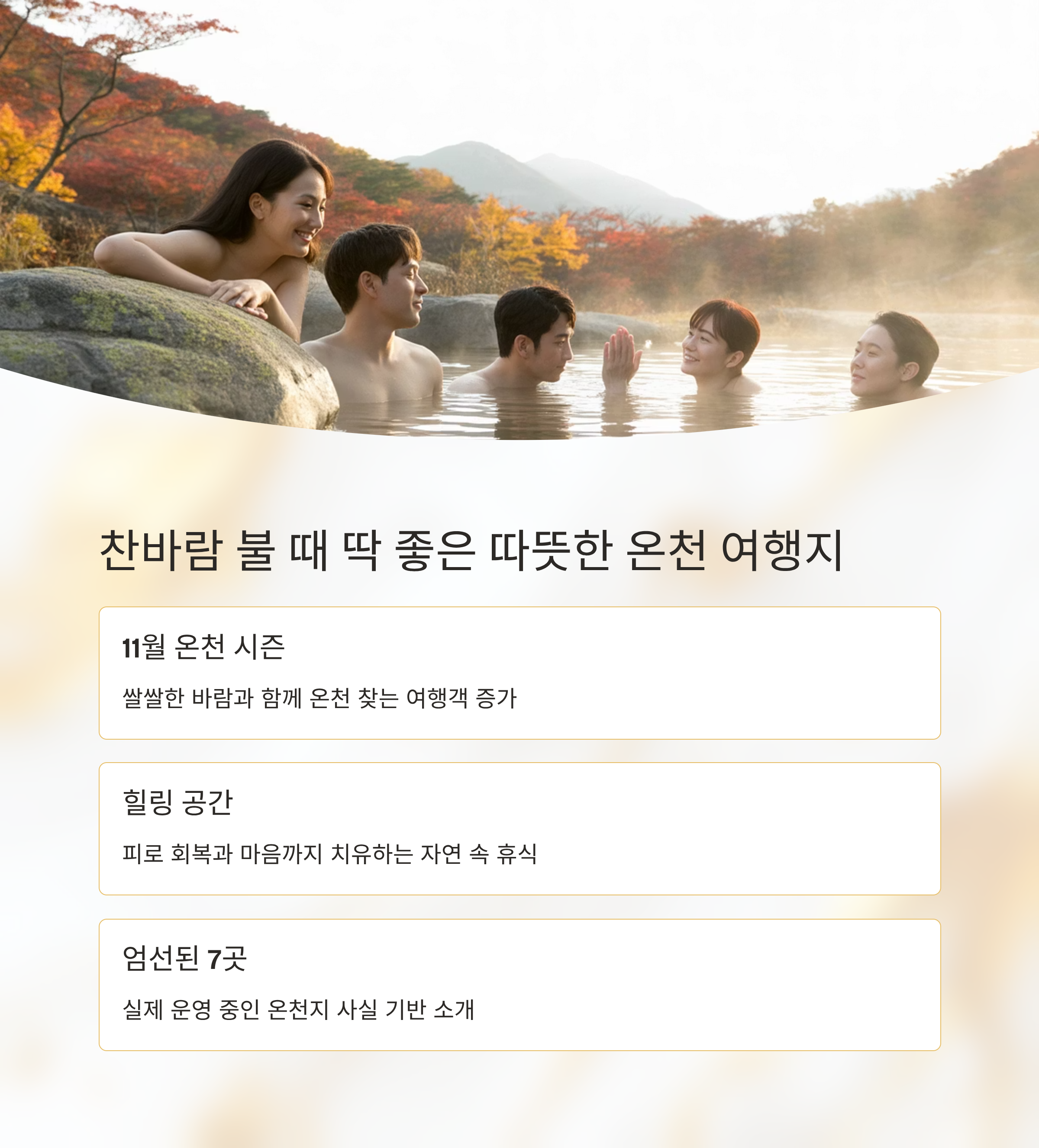 11월은 쌀쌀한 바람이 불기 시작하면서 따뜻한 온천을 찾는 여행객이 많아지는 시기입니다. 온천은 단순히 몸을 따뜻하게 해줄 뿐만 아니라, 조용한 자연 속에서 피로를 풀고 마음까지 힐링할 수 있는 공간이죠. 이번 글에서는 지역 관광공사와 숙박 후기, SNS, 블로그 등을 바탕으로, 11월에 가기 좋은 국내 온천 여행지 7곳을 엄선해 소개합니다. 각 지역의 대표 온천, 숙박업소, 맛집, 포토스팟까지 실제 존재하고 운영 중인 장소 위주로 정리했으며, 과장 없이 사실에 기반한 내용을 제공합니다.