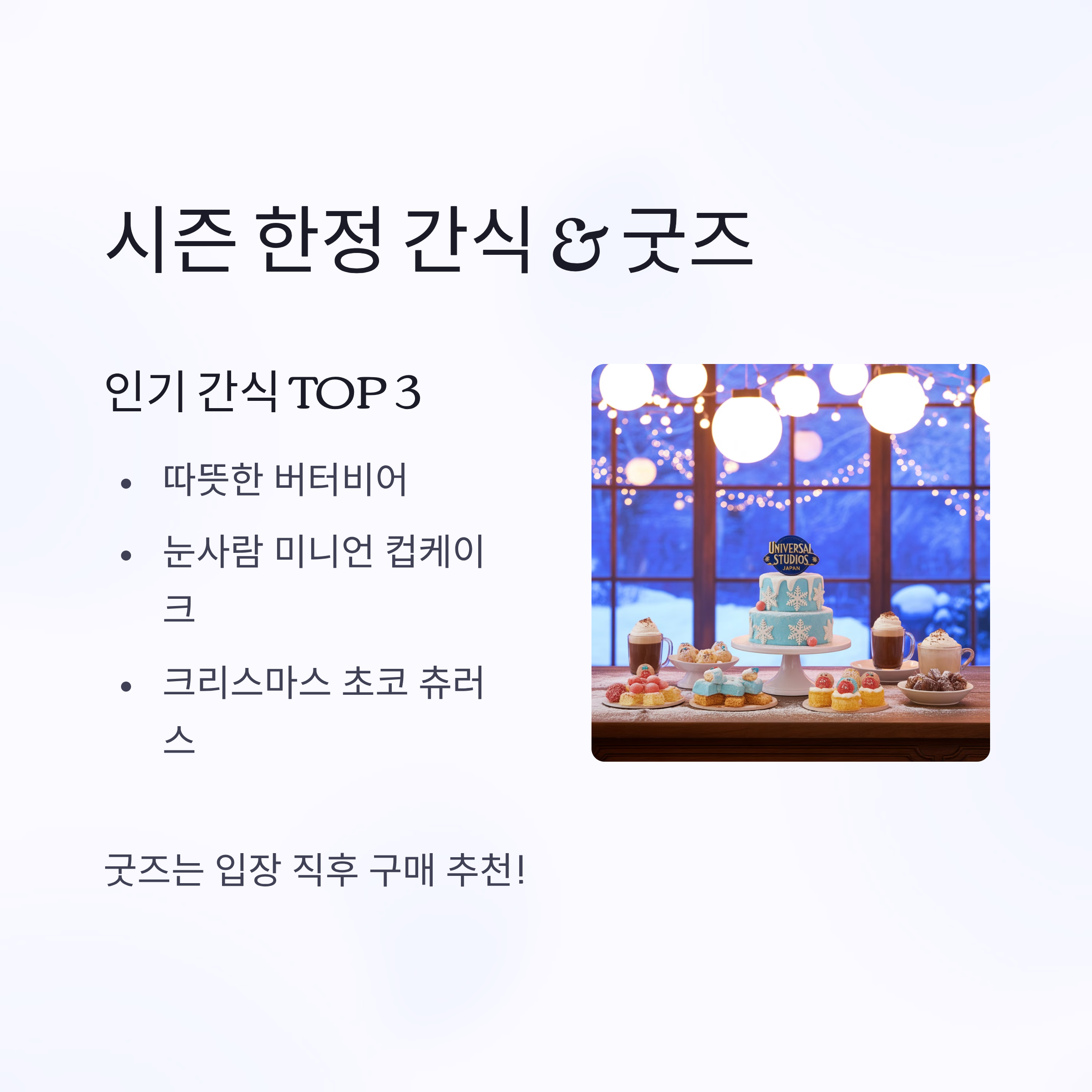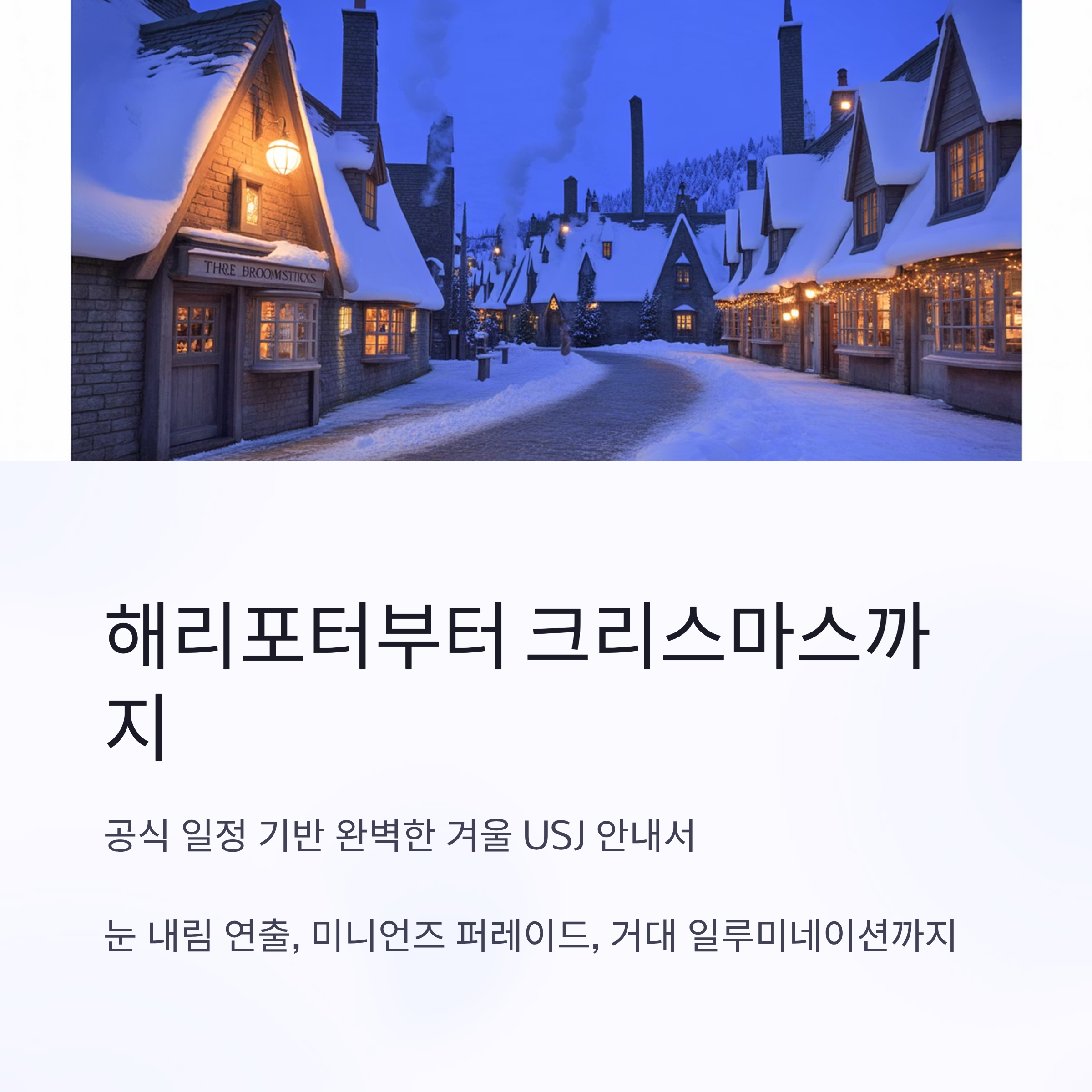 2025-2026 겨울 시즌에 USJ를 찾을 분들을 위한 입장권 정보, 축제 일정, 테마존별 즐길 거리, 추천 스팟, 하루 여행 요약표까지 모두 담았습니다.