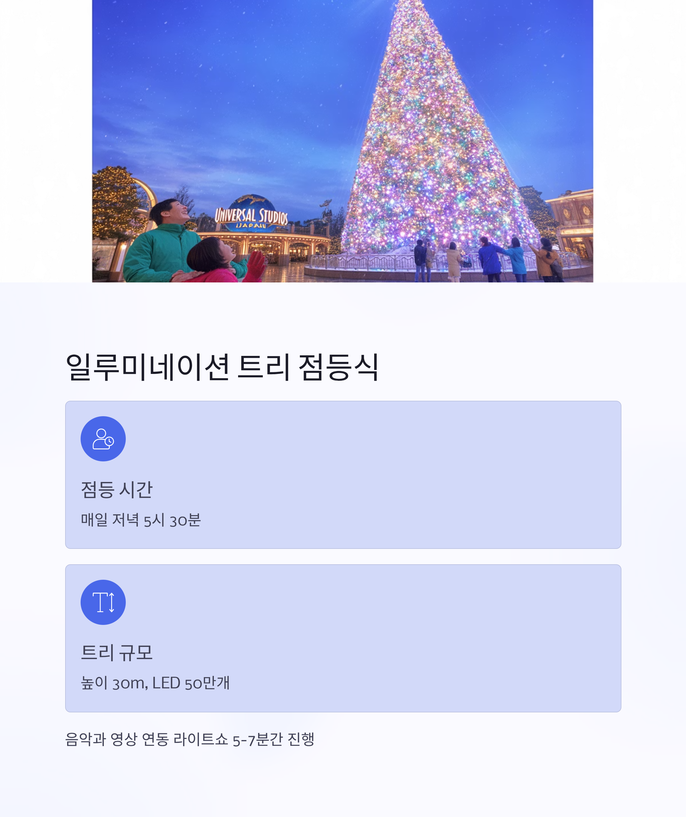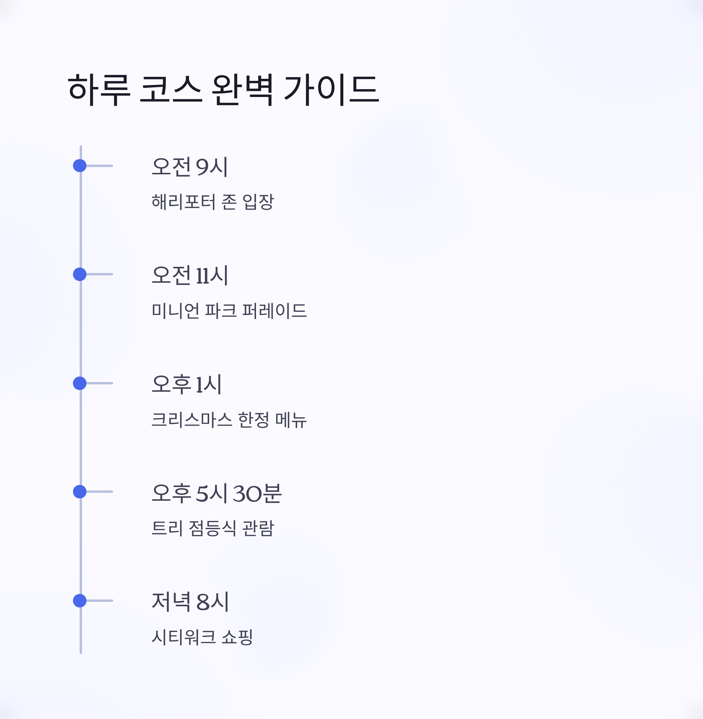 오전 9:00 해리포터 존 입장 눈 내림 체험, 버터비어, 포토타임 오전 11:00 미니언 파크 퍼레이드 관람, 포토존 촬영, 굿즈 구매 오후 1:00 내부 식당 or 시티워크 식사 크리스마스 시즌 한정 메뉴 맛보기 오후 2:30 일루미네이션 트리 대기 조명 점등식 앞자리 선점, 근처 포토존 탐방 오후 5:30 점등식 관람 트리 조명쇼 감상 + 커플 사진 오후 7:00 조스 존 or 입구 광장 불꽃놀이 관람 (해당일자만 진행) 저녁 8:00 유니버설 시티워크 기념품 쇼핑 + 디저트 or 야식 후 숙소 이동