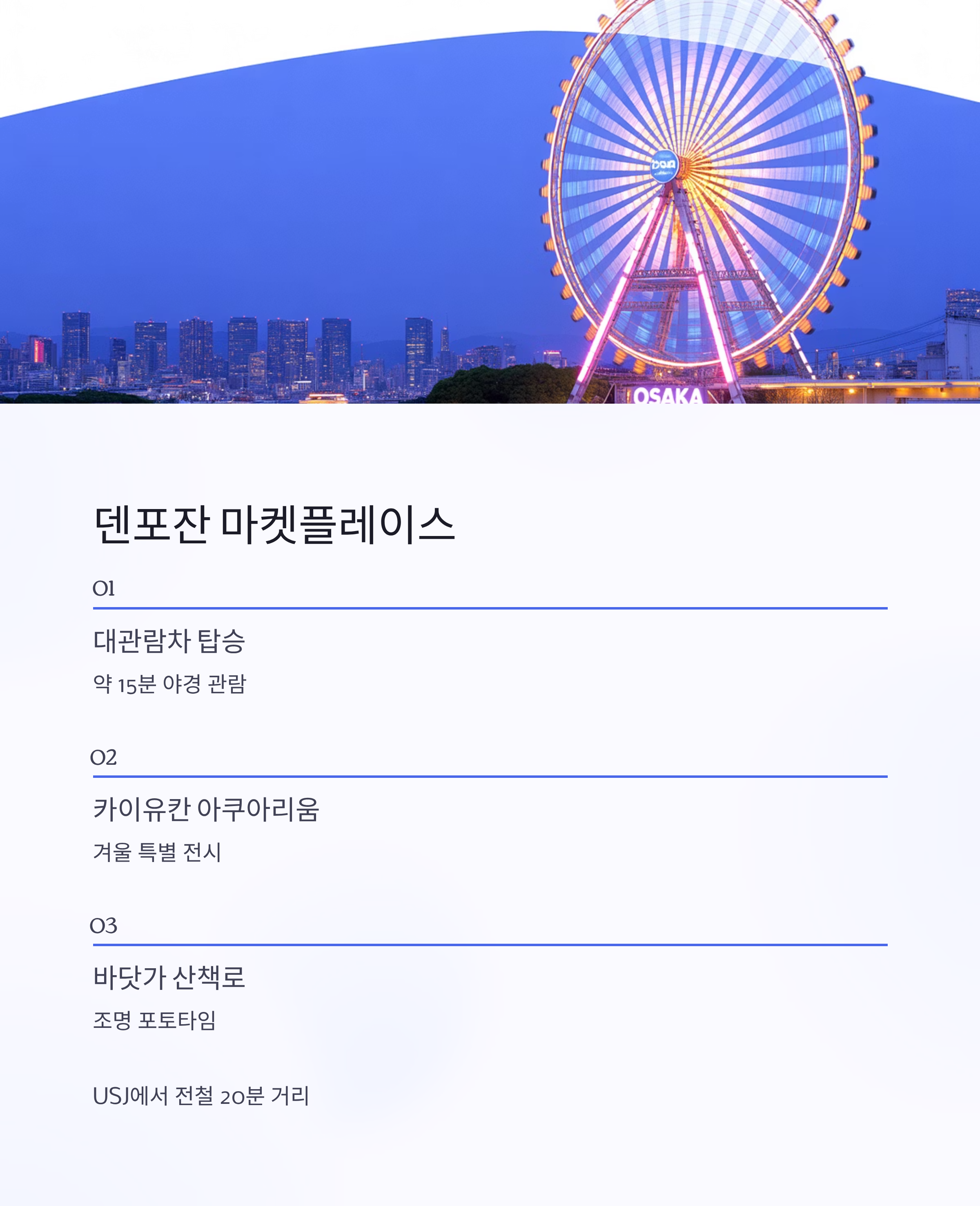 USJ에서 전철로 약 20분 거리의 복합 쇼핑 + 관광 명소입니다. 겨울엔 야경 관람, 야시장 테마 마켓이 열려 연인, 가족 모두에게 추천됩니다.