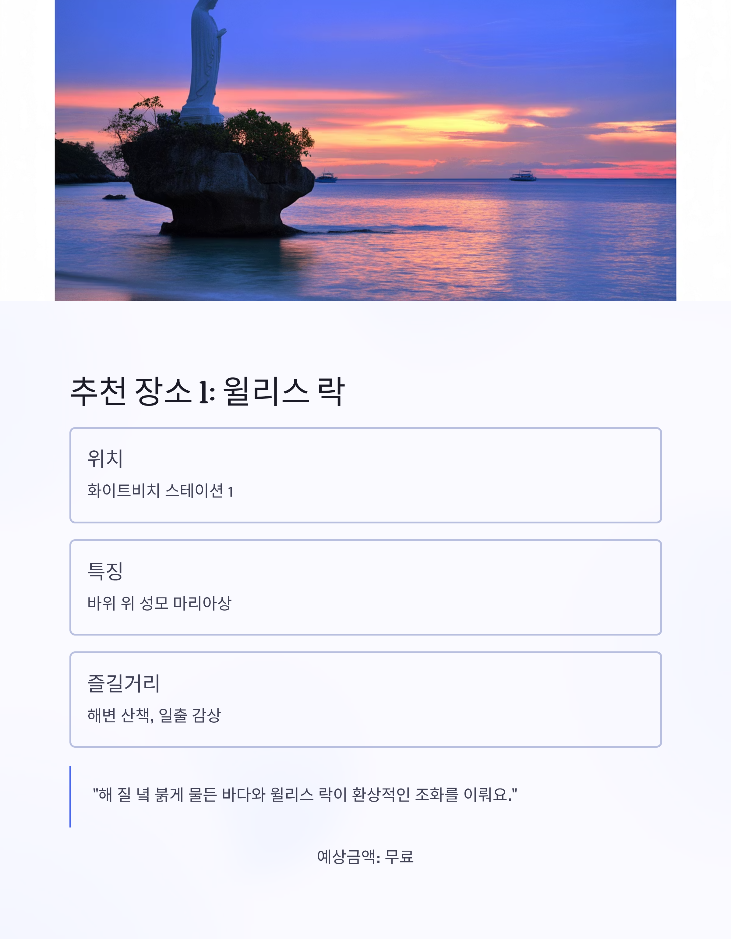 필리핀 보라카이의 화이트비치는 세계에서 가장 아름다운 해변 중 하나로 손꼽힙니다. 눈부시게 하얀 모래와 투명한 바다, 다채로운 액티비티와 감성적인 포토스팟까지 여행자를 사로잡는 매력이 가득하죠. 이 글에서는 보라카이 화이트비치에서 꼭 가봐야 할 명소와 즐길 거리, 예산 정보까지 정리했습니다. 실제 방문자 후기도 함께 담아 믿을 수 있는 여행 정보로 구성했으니 마지막의 여행 일정표와 비교표까지 꼭 확인해 주세요.